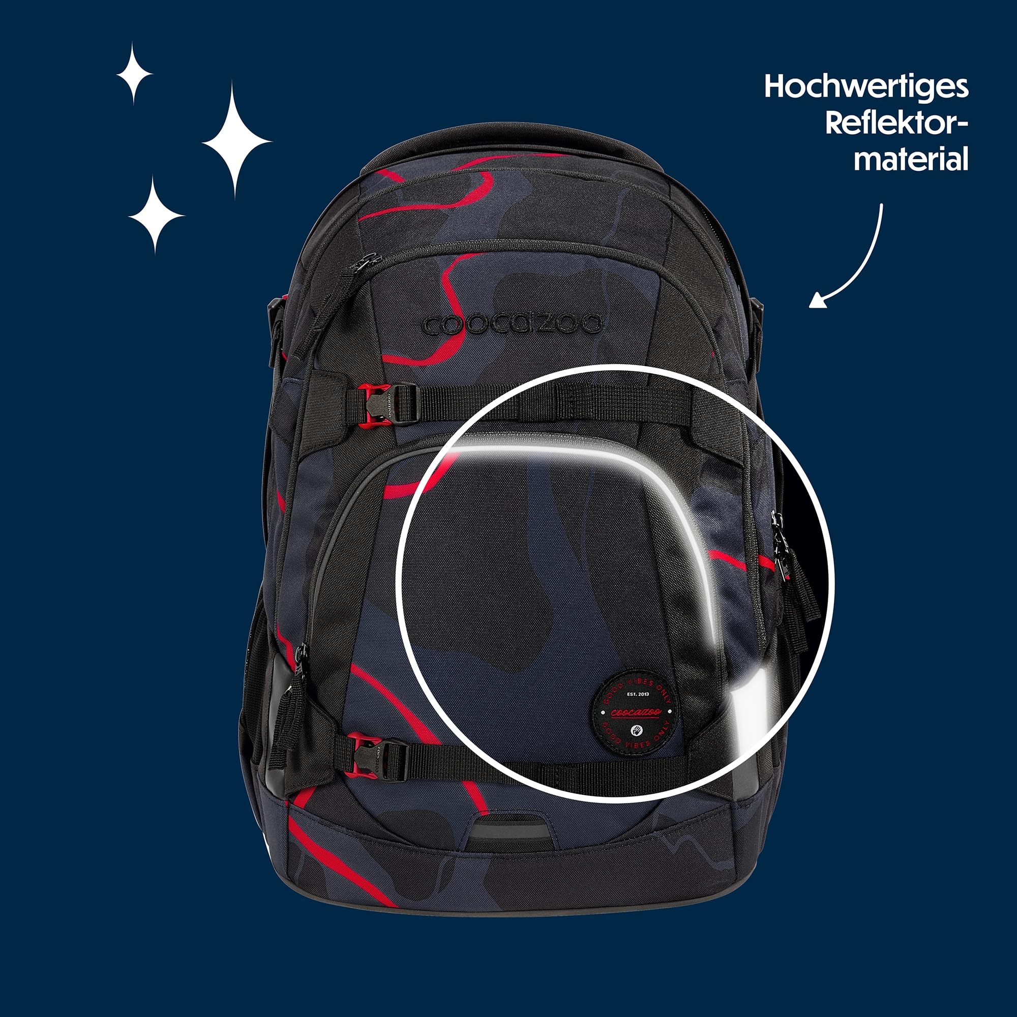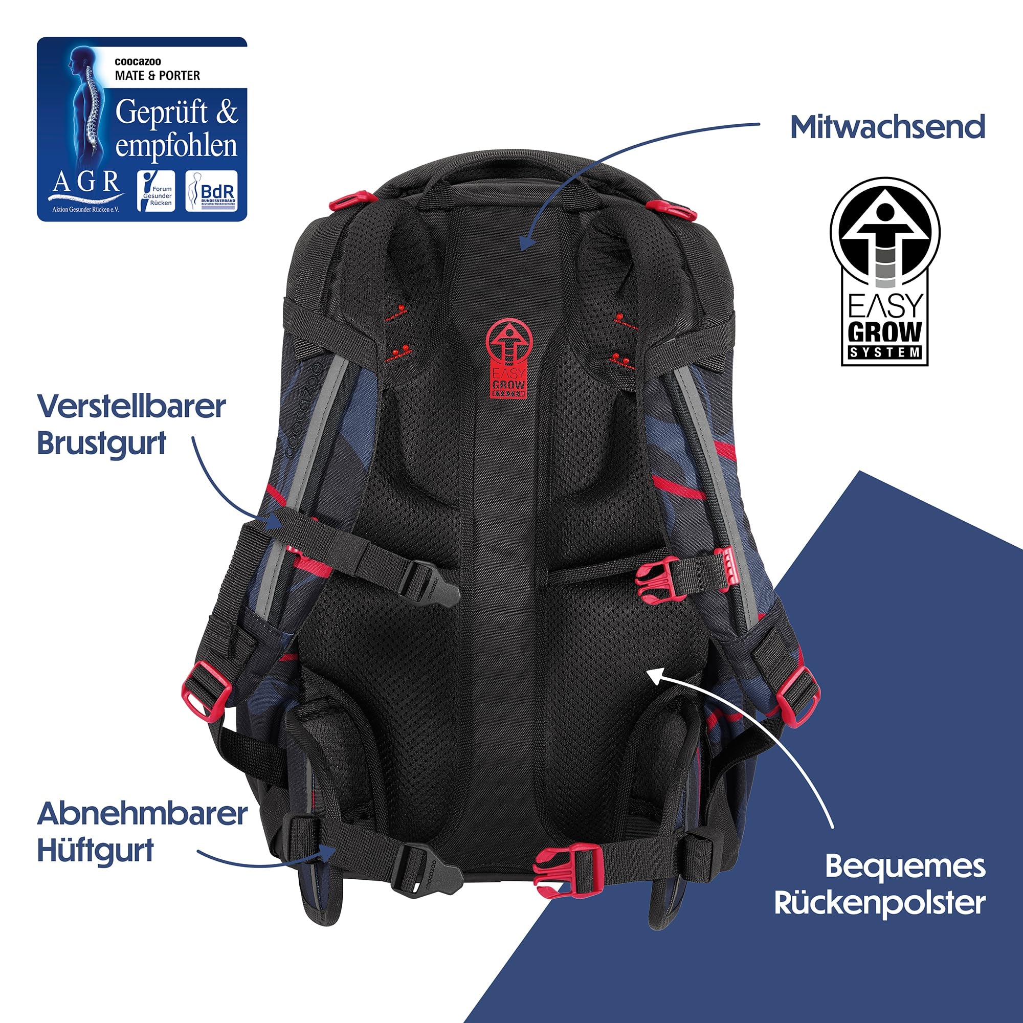 Der ideale Begleiter für alle Grundschüler und alle Teenager in der weiterführenden Schule ist mit Klett-Patches und Anhängern individualisierbar. Der MATE kommt mit einem Gratis-Patch zu euch nach Hause. Unsere separat erhältlichen COLOUR UP-Sets geben dir die Möglichkeit, den Schulrucksack deines Kindes noch einzigartiger zu gestalten. Ergonomischer Tragekomfort: Mit dem EASY GROW SYSTEM lässt er sich schnell und einfach auf die aktuelle Rückenlänge deines Kindes einstellen. Ein einfacher Drehmechanismus mit entsprechender Skala ermöglicht die Höhenverstellung der Schulterträger. Das Gewicht lässt sich durch die Riemen auf Schulterhöhe und Kompressionsriemen an der Seite nah am Rücken verteilen.Der MATE bietet viel Stauraum für Bücher, Hefte und alltägliche Dinge. Genug Platz für dein Kind garantieren vier verschiedene Fächer. Das integrierte Bücherfach ist nah am Rücken platziert. So wird die Last optimal verteilt. In der geräumigen Fronttasche ist Platz für Snack Box & Co., die beiden Seitenfächer sind perfekt für Trinkflasche und Regenschirm geeignet. Zusätzlich ist die Vorderseite mit Gurtbändern ausgestattet, die Jacke, Helm oder Skateboard sicher verstauen. Diese Features – kombiniert mit 30 Litern Stauraum und nur 1.250 Gramm Gewicht (ohne abnehmbare Elemente, Gesamtgewicht 1.350g) – machen den MATE zum grossartigen Multitalent.Die vorhandenen Leuchtstreifen und reflektierende Flächen sorgen für mehr Sichtbarkeit im Strassenverkehr. Zusätzlich kann dein Kind am Schulrucksack ein weiteres LED-Stecklicht befestigen.Ein weiterer Pluspunkt: der Schulrucksack ist klimaneutral ausgeglichen sowie sozial verträglich (unsere Partner: amfori, humedica) und verantwortungsvoll produziert (bluesign-Systempartner). Die coocazoo Modelle MATE, PORTER, JOKER sind mit dem AGR-Gütesiegel (Aktion Gesunder Rücken e.V.) ausgezeichnet.Hochwertig, praktisch und langlebig: Das ist der Schulrucksack MATE von coocazoo!