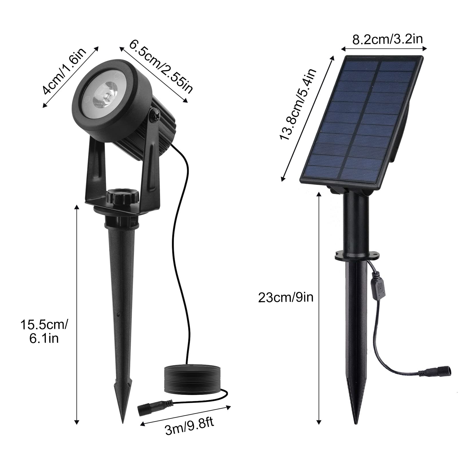 Produktinformationen: Solarpanel: 5,5 V / 3 W Polykristallines Solarpanel Material: feuerfester ABS-Kunststoff. Lithium-Ionen-Akku: 3,7 V / 2000 mAh / 18650 Lithium-Akku. 2 Modi: hohe und niedrige Helligkeit Ladezeit: ≥ 8 Stunden. Betriebszeit: 8-12 Stunden Farbtemperatur: RGB Schaltertyp: Lichtsteuerung. Verlängerungskabel: 3 Meter Lieferumfang: 1) 2 x Solar-LED-Strahler. 2) Einführung in den Boden * 3 (Eisen * 2, Kunststoff * 1) 1 x Bedienungsanleitung (evtl. nicht in deutscher Sprache). 4) Zubehörpaket: 3 x Expansionsgummistopfen 3) Befestigungsschrauben Produkteigenschaften: 1. Kein Stromanschluss nötig, Solar-Beleuchtung, Niederspannungssicherheit. 2. Hocheffiziente Polysilizium-Solarpanel, 3 W, zweistufige Dimmfunktion 3. Intelligente Lichtsteuerung, automatisches Aufladen während des Tages und automatische Beleuchtung bei Nacht. 4. Der Schutzgrad ist IP65, kann in den Boden gesteckt oder an der Wand befestigt werden und ist einfach und bequem. 5. Durch die Verwendung der superhellen LED-Lampe (Lichtquelle) hat die gesamte Lampe die Vorteile von hoher Helligkeit, hoher Helligkeit, grosser Reichweite und langer Lebensdauer.