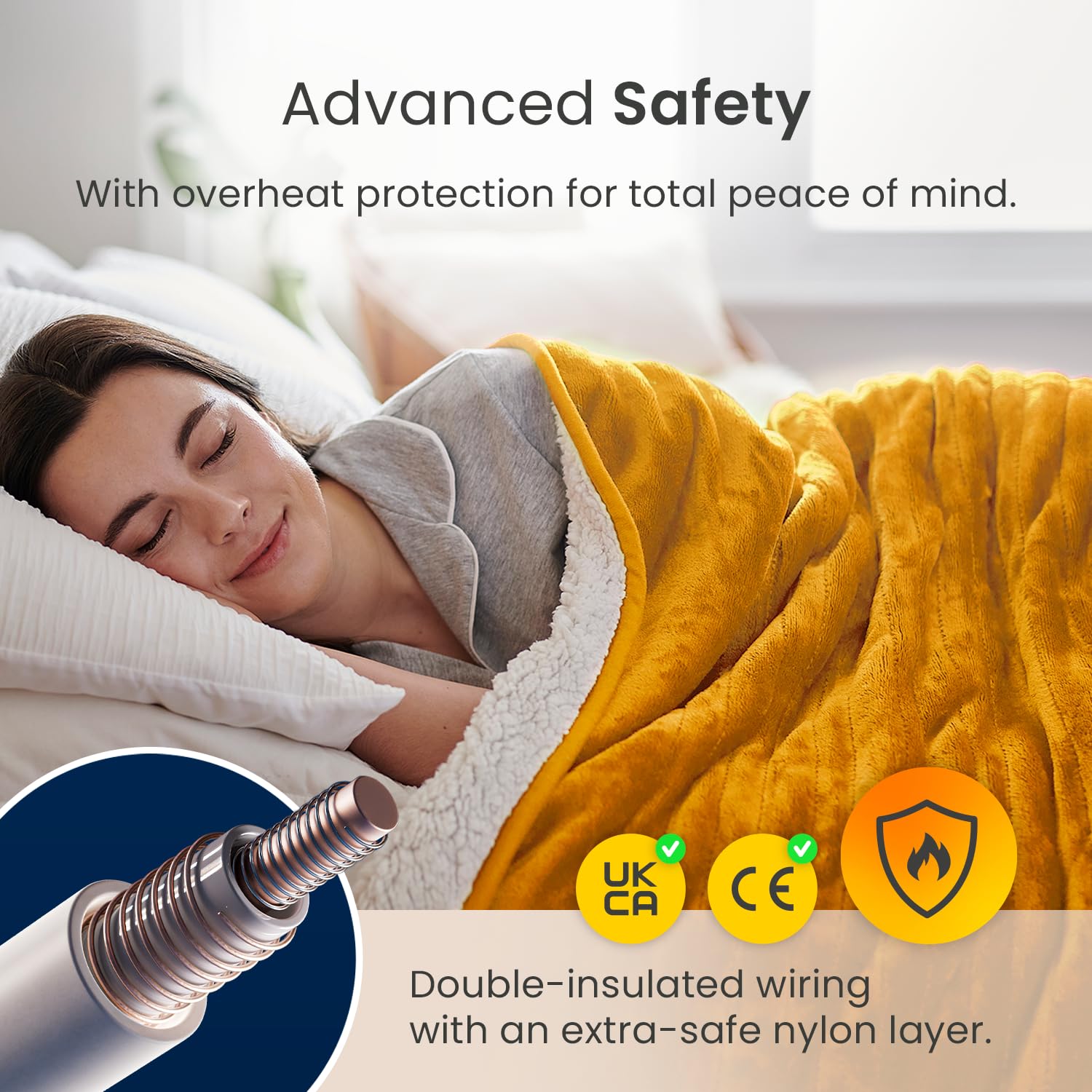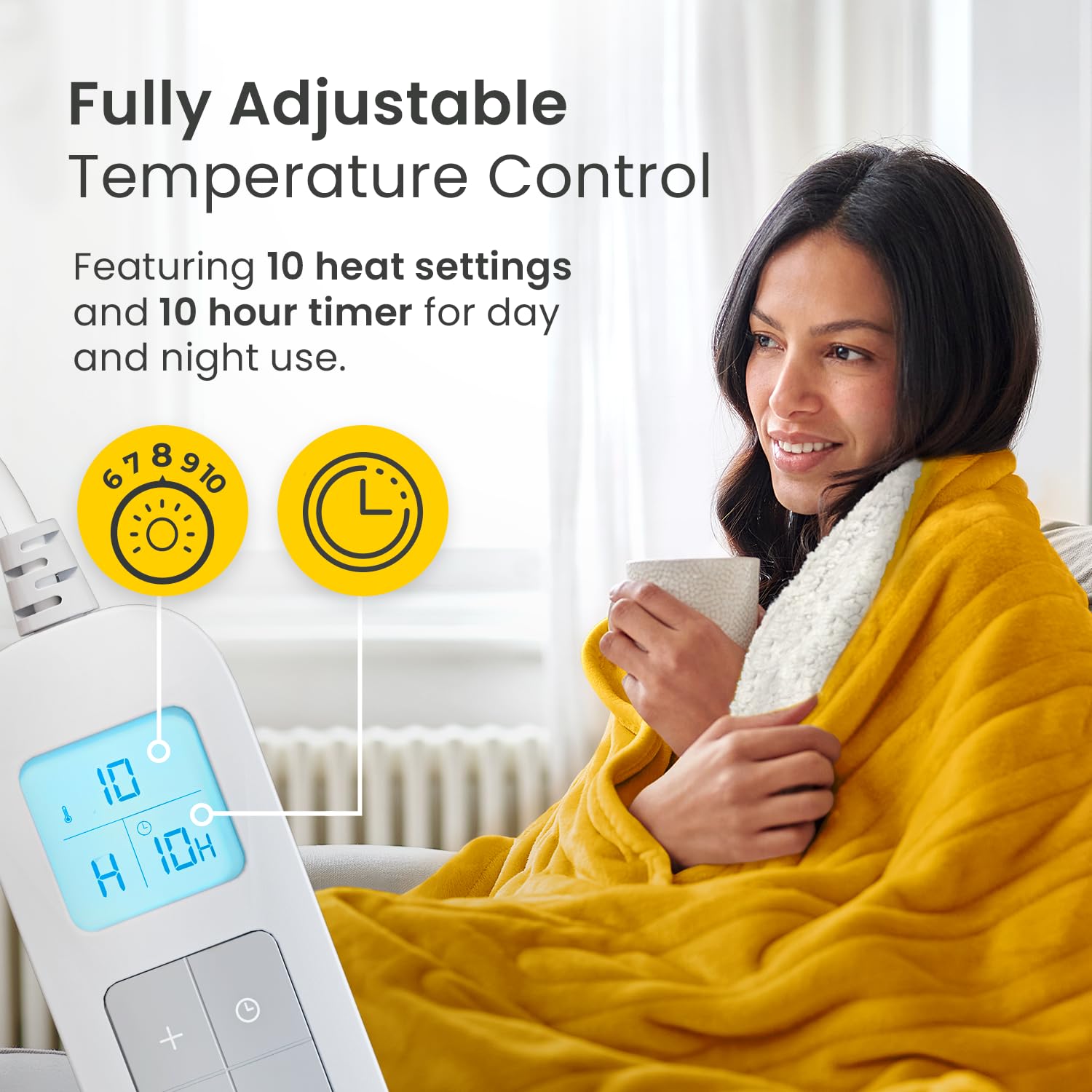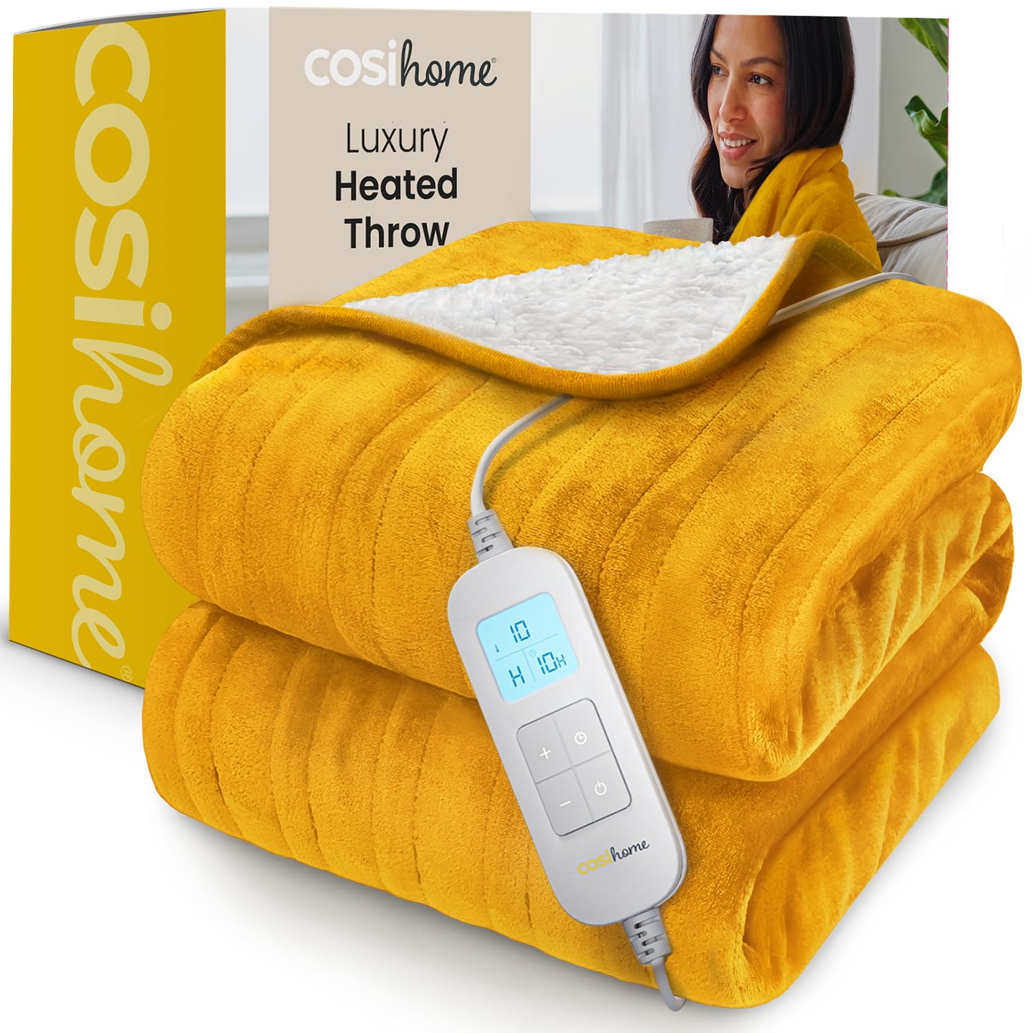 Cosi Home Heizdecke 180x130 cm - Elektrische Wärmedecke mit Abschaltautomatik, Überhitzungsschutz, Waschbar, Kuscheliges Sherpa & Fleece, 10 Heizstufen mit digitaler Fernbedienung - Senfgelb