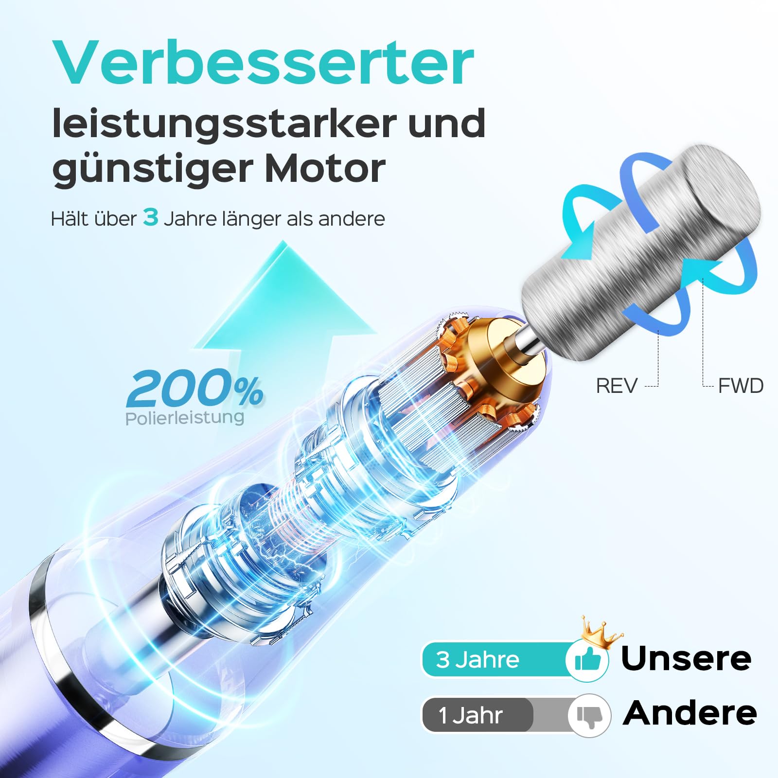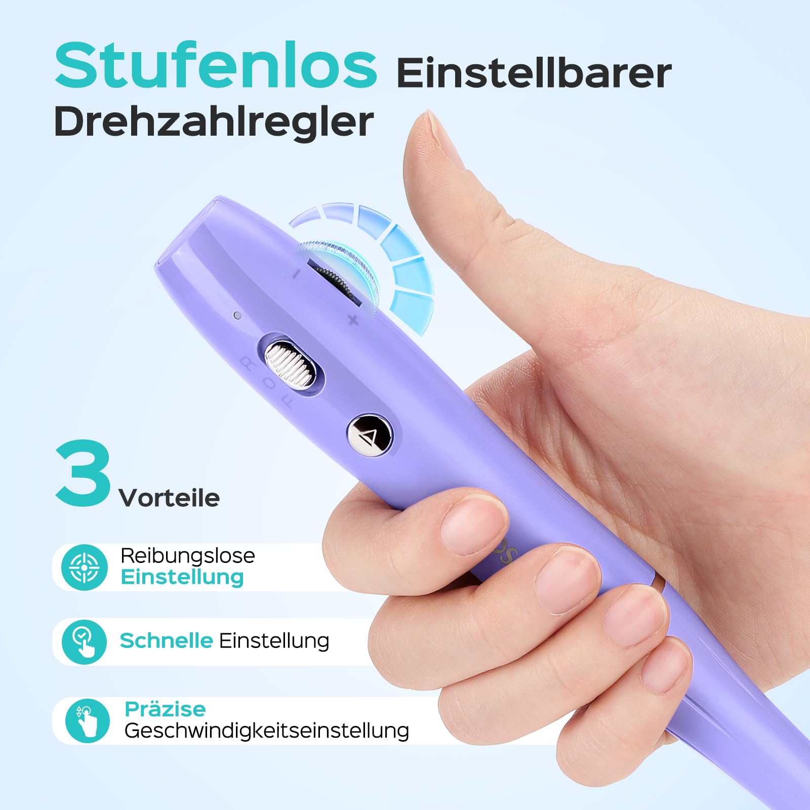 Der hochwertige Motor sorgt fuer einen ruhigen Lauf mit geringer Hitzeentwicklung und minimalen Vibrationen. Dadurch laesst sich der Nagelfraeser kontrolliert und schonend einsetzen. Die stufenlos einstellbare Geschwindigkeit erlaubt eine praezise Anpassung an unterschiedliche Nagelhaerten und Schleifsituationen.
