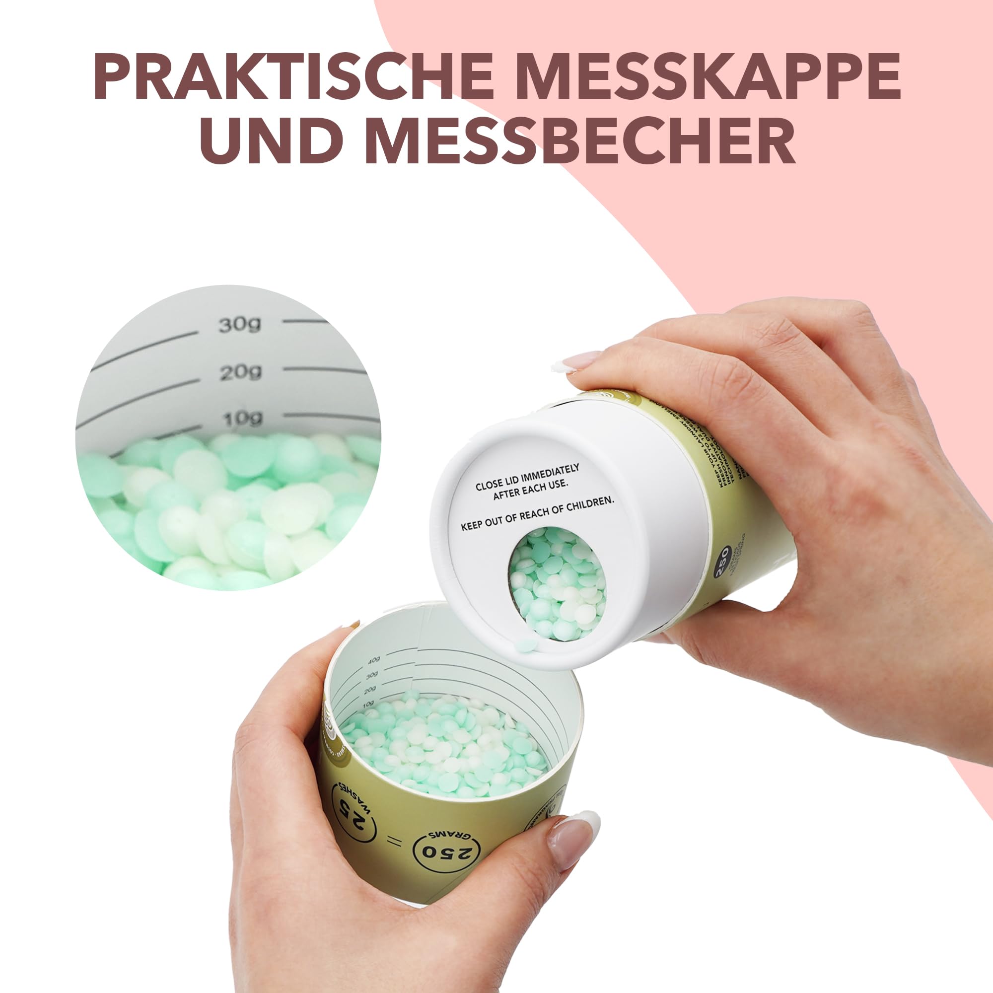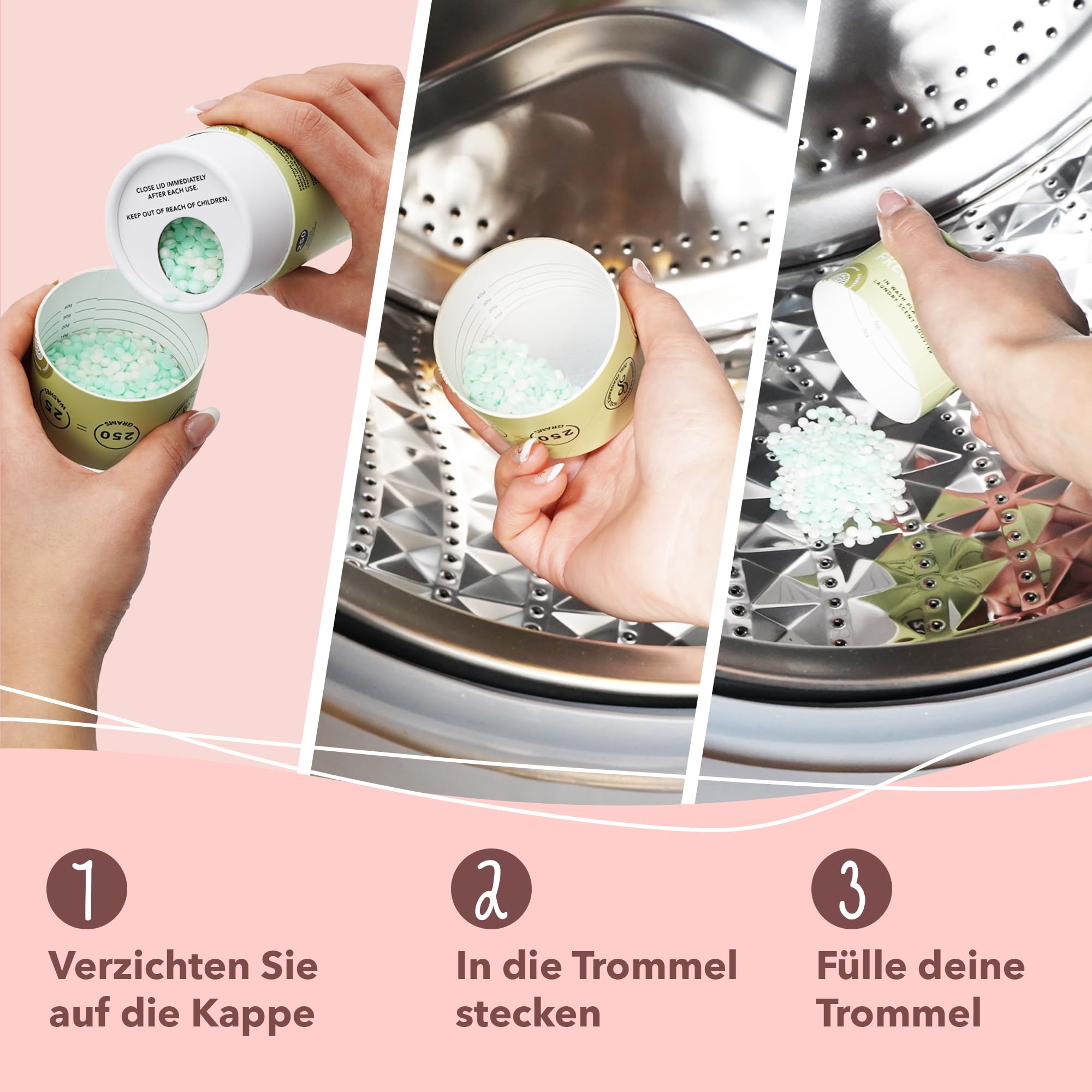 • [ SUPER EINFACH ] Gib 10g Perlen in den Deckel und verwende die Linien in der Dosierkappe. Fülle die Perlen in die Trommel, bevor du die Wäsche hinzufügst. Lege die Wäsche hinein und starte die Waschmaschine! Tipp: Verwende Cosmeau Waschmittelblätter für den umweltfreundlichsten Waschgang.