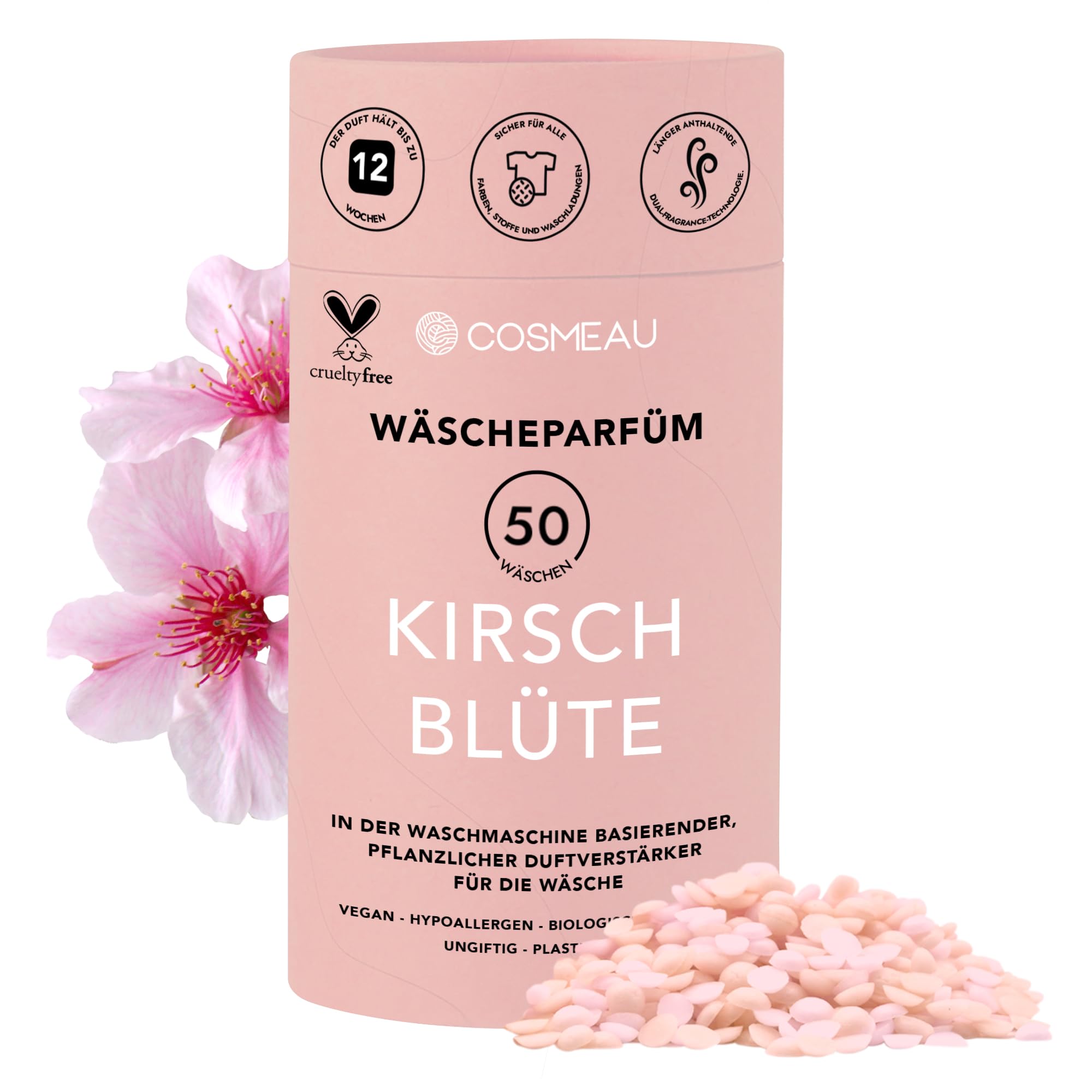 Cosmeau Wäscheparfüm Perlen Kirschblüte - Nachhaltige Duftperlen für Waschmaschine - Bis zu 50 Waschladungen und 24 Wochen Frische - Plästik Frei, Vegan & Zero Waste