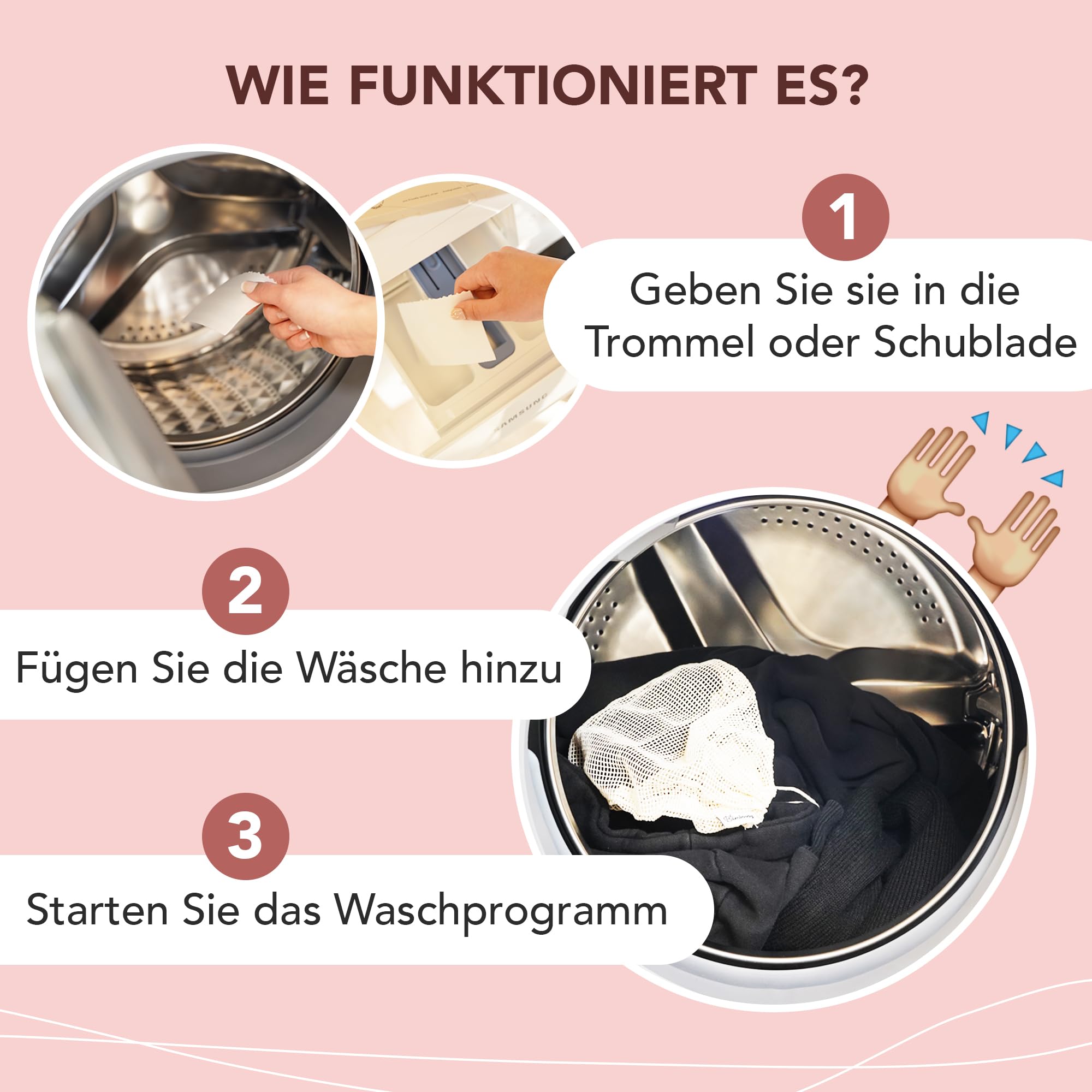 Ein Wäscheblatt besteht aus hochkonzentriertem umweltfreundlichem Waschmittel und hat einen leichten Naturduft. Natürlich sind die Wäscheblätter vegan und tierversuchsfrei. Dosierung Für Waschladungen mit weniger als 3,5-4 kg Wäsche (was dem europäischen Standard entspricht) empfehlen wir einen Streifen, und für mehr als 3,5-4 kg empfehlen wir 2 Streifen. Farbtauglichkeit Geeignet für weisse, bunte und dunkle Wäsche. Es ist auch sicher für Materialien mit Silberfäden. Temperatur Die Waschstreifen können bei Temperaturen zwischen 30 und 60 Grad gewaschen werden, sogar mit kaltem Wasser und Handwäsche. Leicht zu transportieren Da es nicht flüssig ist, lässt sich ein Waschstreifen leicht auf Reisen oder für ein Wochenende mitnehmen. Wie stark ist der Duft nach dem Waschen? Waschstreifen haben nicht einen so starken Duft wie zum Beispiel Waschpods. Ein Streifen wiegt ungefähr 4 Gramm, während ein Pod schnell 25 Gramm wiegen kann. Aufgrund von mehr Chemikalien und einem schwereren Produkt ist es nicht möglich, so viel Duft wie ein Pod zu hinterlassen. Ist Weichspüler im Waschstreifen enthalten? Nein. Der Vergleich, den wir mit Weichspüler ziehen, bezieht sich rein darauf, dass du für Weichheit keinen Weichspüler mehr benötigst. Weniger Chemikalien in den Waschstreifen sorgen dafür, dass deine Wäsche weicher wird als mit herkömmlichem Waschmittel. Umweltfreundlich Unsere Waschstreifen sind biologisch abbaubar, ebenso wie die Verpackung. Ausserdem sparst du auch CO2-Emissionen, da Waschstreifen viel kompakter und leichter zu transportieren sind als flüssiges Waschmittel.