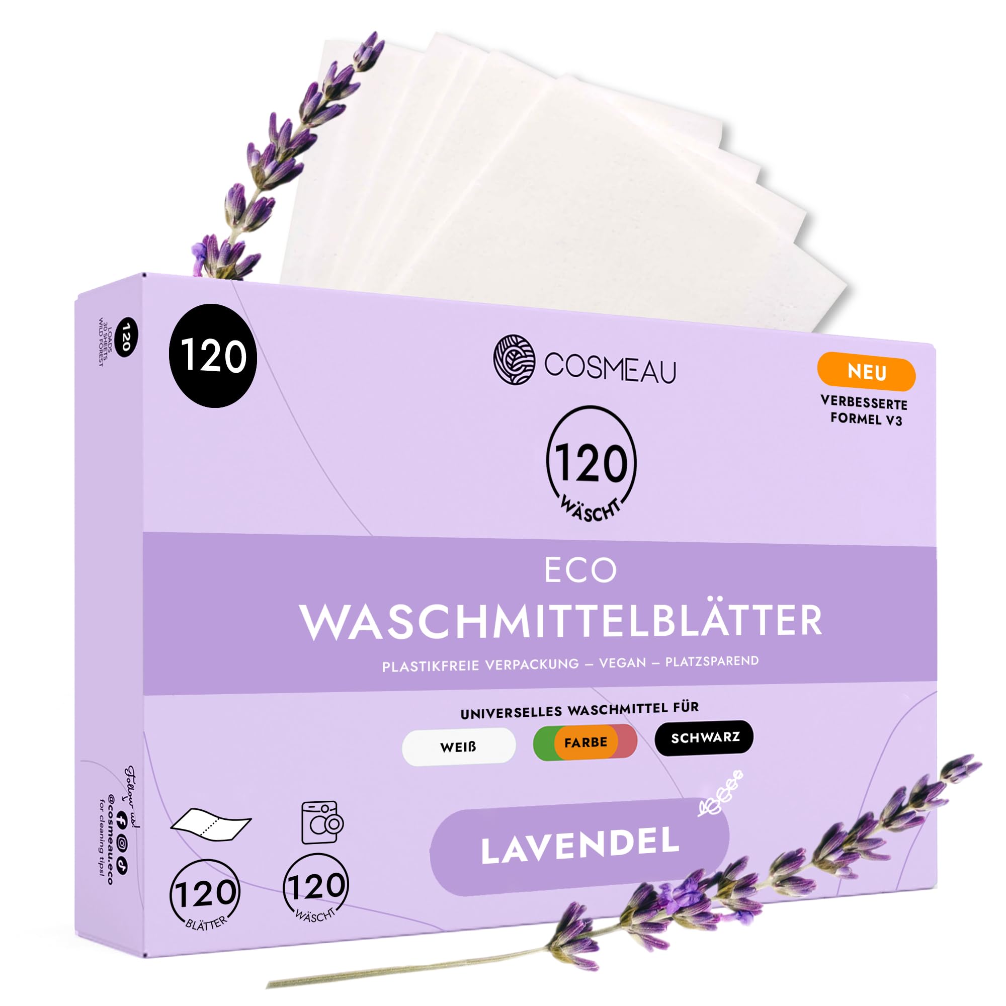 Cosmeau Waschmittel Blätter Lavendel – bis zu 120 Waschgänge (120 Blätter) – Nachhaltiges Waschmittel für Weiss, Farbe und Schwarz – Abbaubar & Perfektes Reisewaschmittel