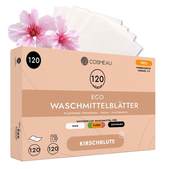 Mindestanzahl für die Bestellung von "Cosmeau Waschmittel Blätter Kirschblüte - bis zu 120 Waschgänge (120 Blätter) - Nachhaltiges Waschmittel für Weiss, Farbe und Schwarz - Plastikfrei, Abbaubar & Perfektes Reisewaschmittel" ist 1.