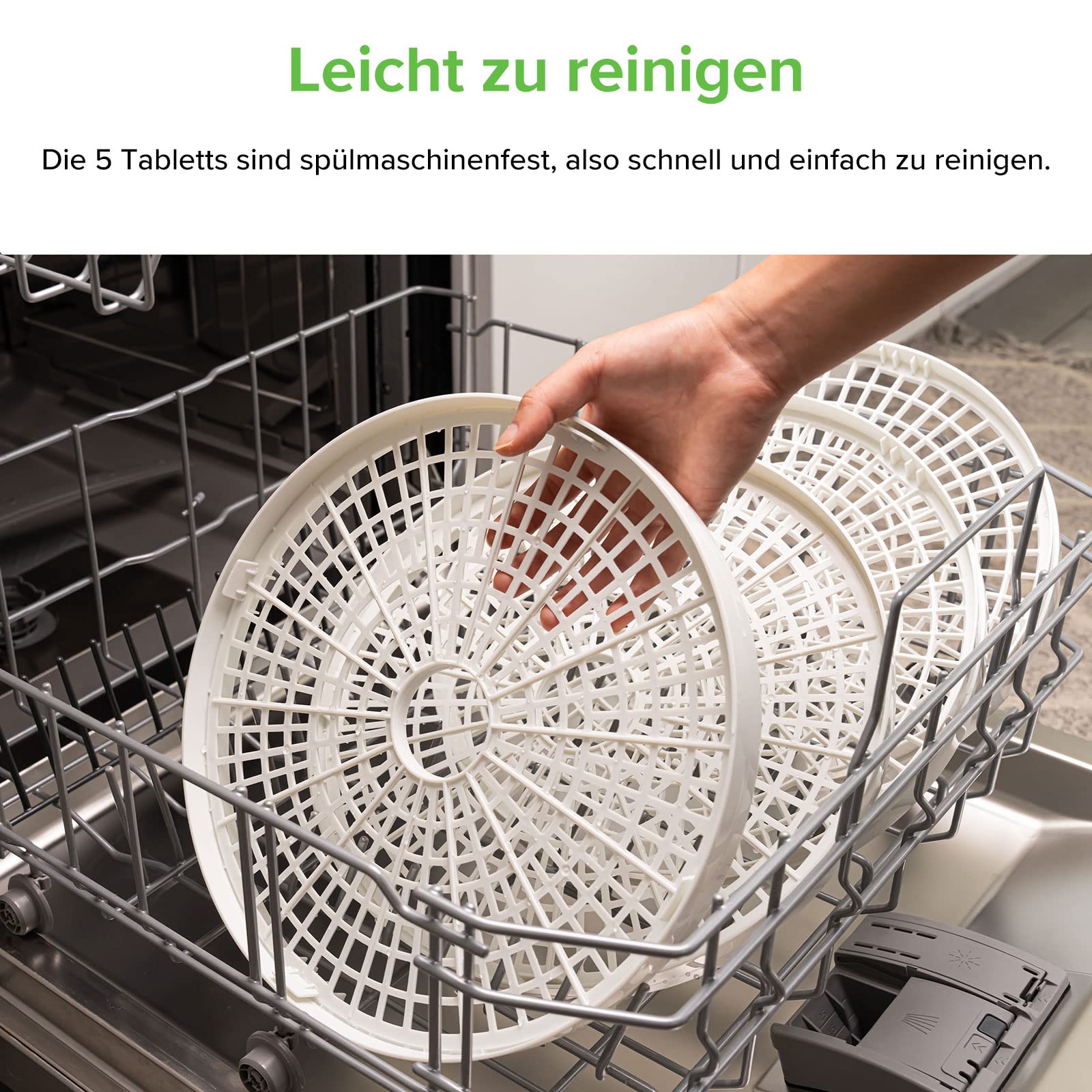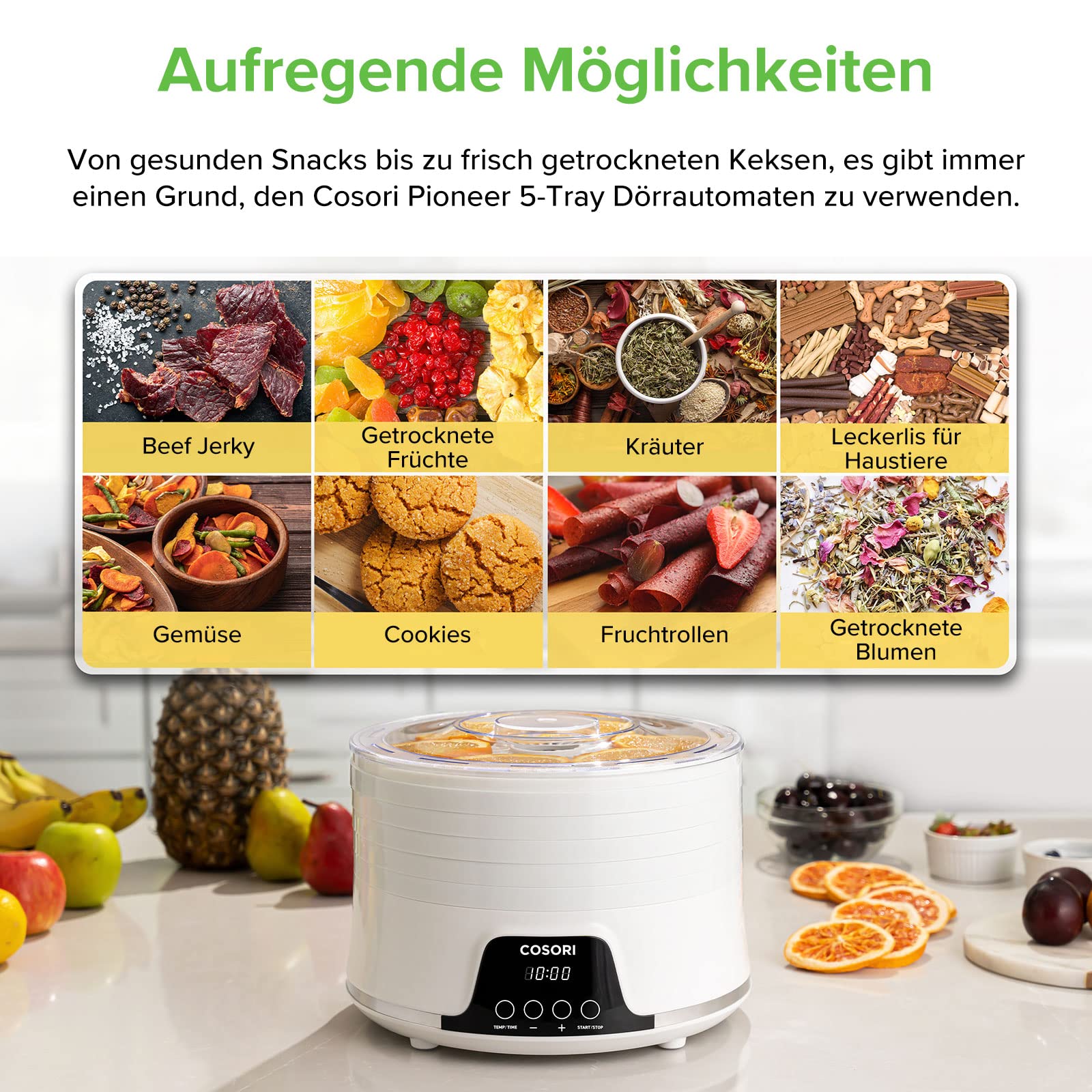 COSORI Dörrautomat für mehr Möglichkeiten, Food Dehydrator mit 5 stapelbaren und herausnehmbaren Tabletts, Einstellbare Höhe, Temperaturregelung(35-75℃), BPA-frei, 350W,Weiss