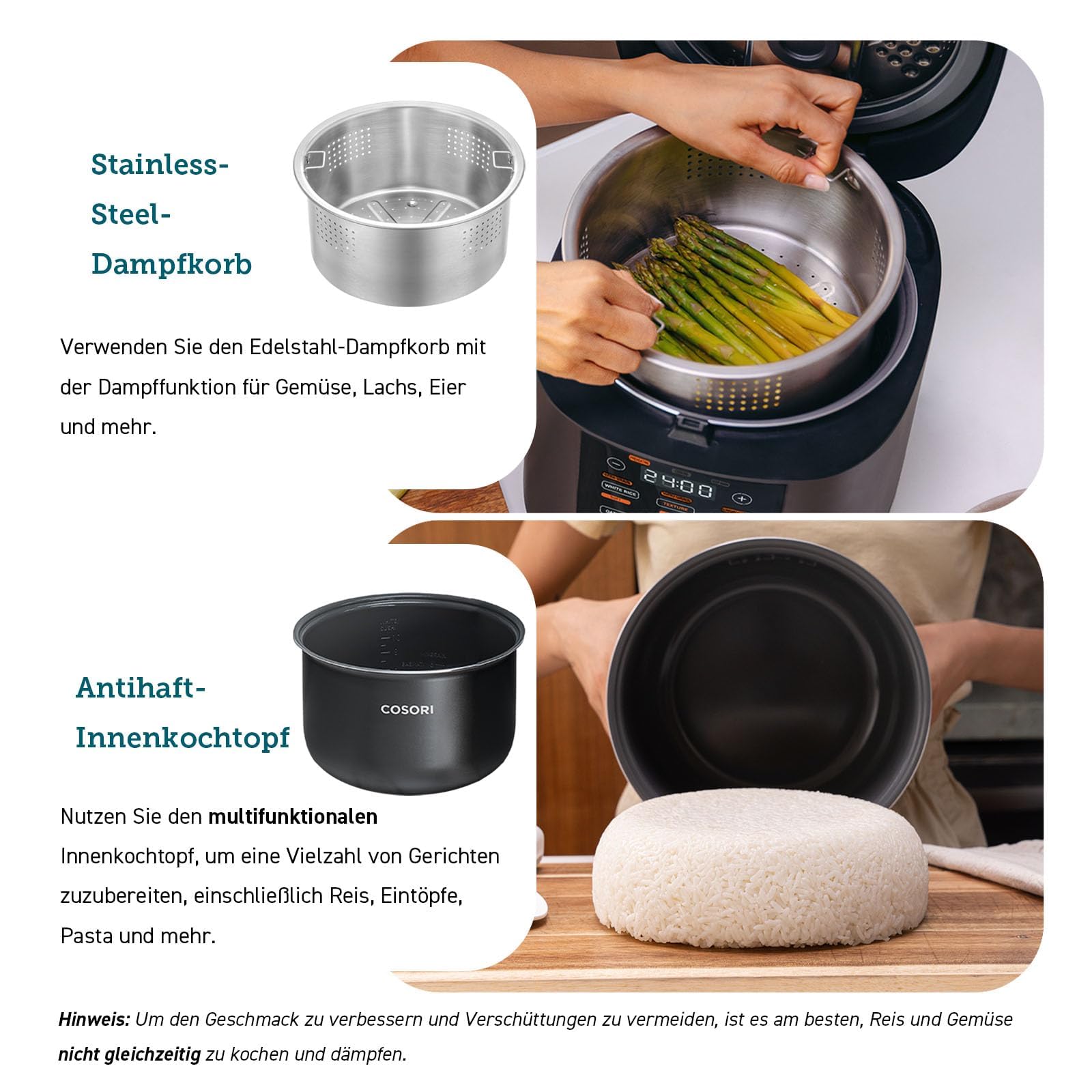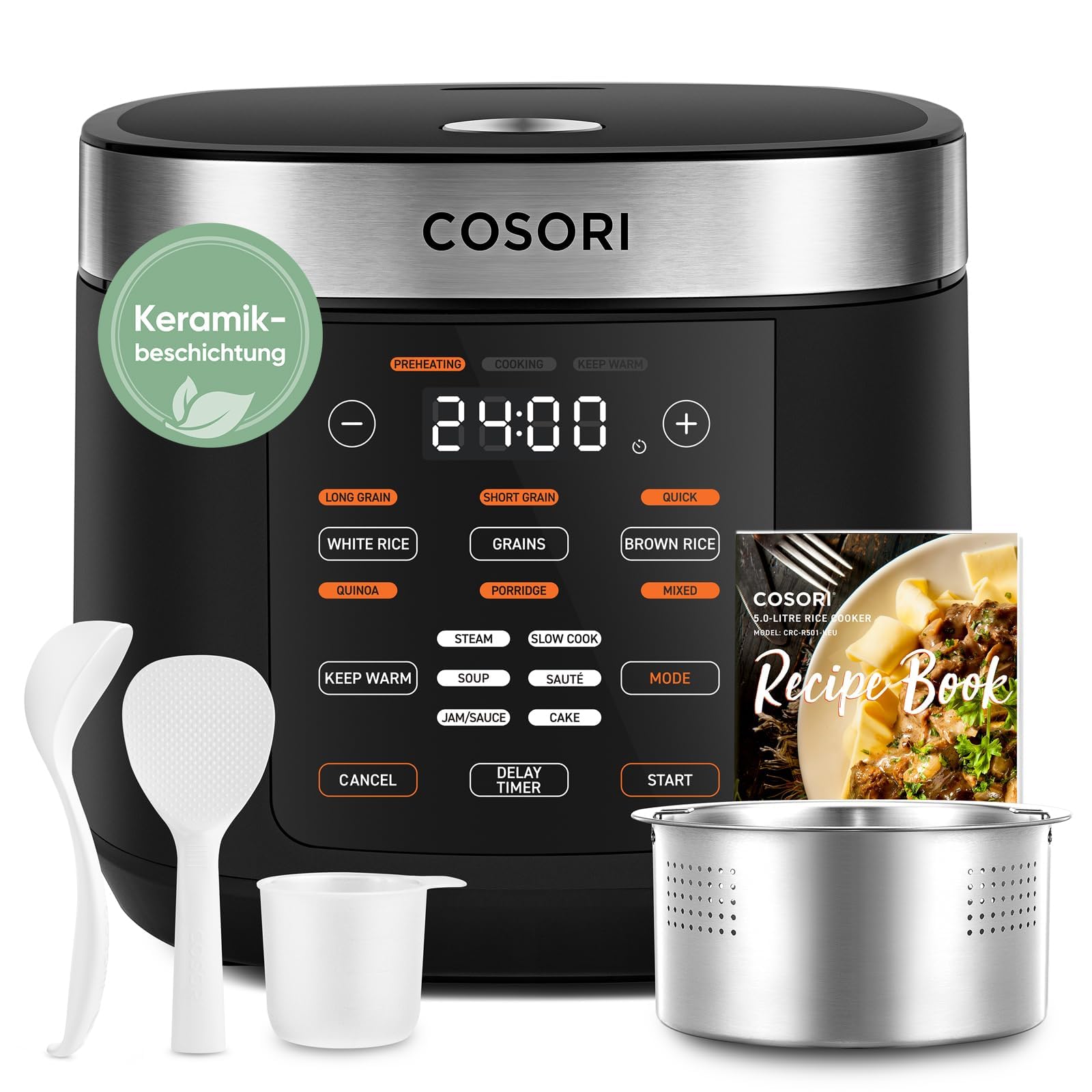 COSORI Reiskocher, Keramikbeschichtung, Rice Cooker 5 L, Multikocher mit 17 Programme, Fuzzy-Logik, Dampfgarer mit Edestahleinsatz, Warmhaltefunktion, Timer, Schwarz