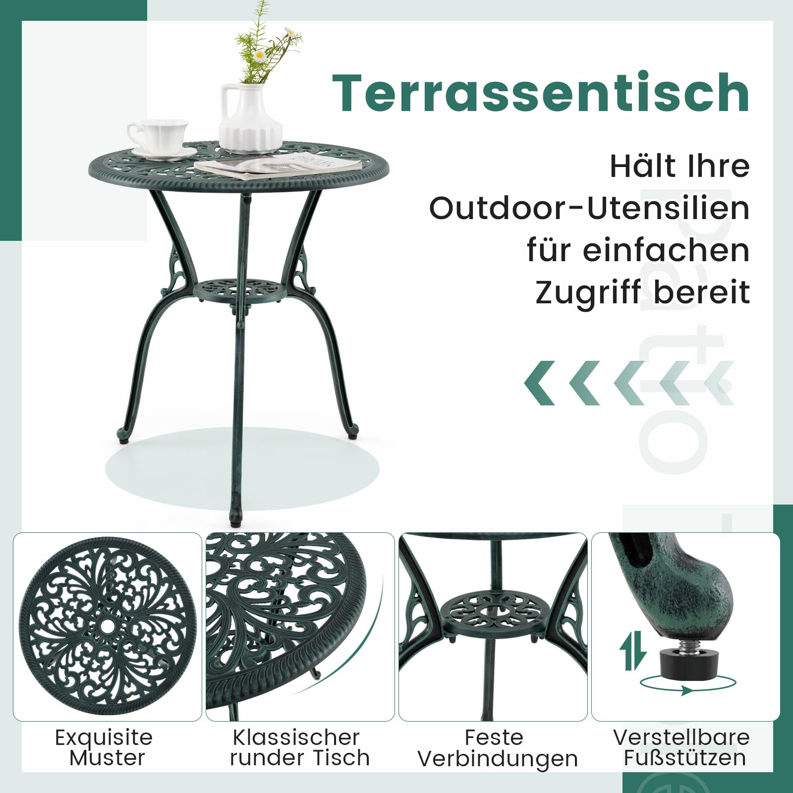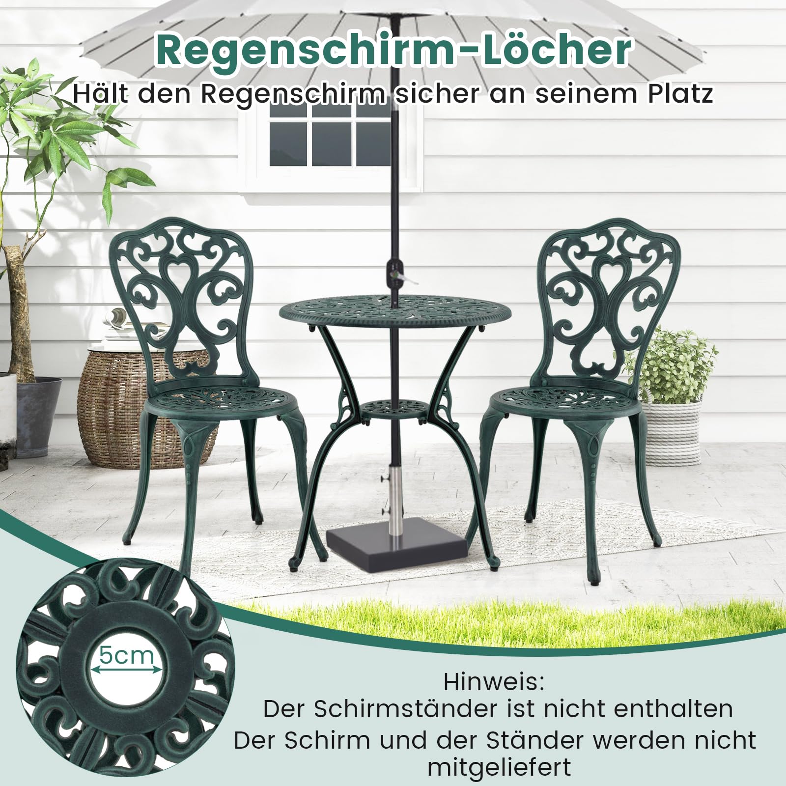 Eigenschaften:Wetterbeständiges Aluminiumgussmaterial für lange Lebensdauer5 cm grosse Schirmlöcher sorgen für sicheren HaltDer Terrassentisch bietet Platz für Ihre Outdoor-Utensilien und ist leicht zugänglichBequemes Sitzen dank geneigter Rückenlehne und geräumiger SitzflächeVerstellbare Fusspolster für zusätzlichen Halt auf unebenem BodenEdle Muster machen die Stühle noch attraktiverGeeignet für Terrasse, Garten, Pool und mehr