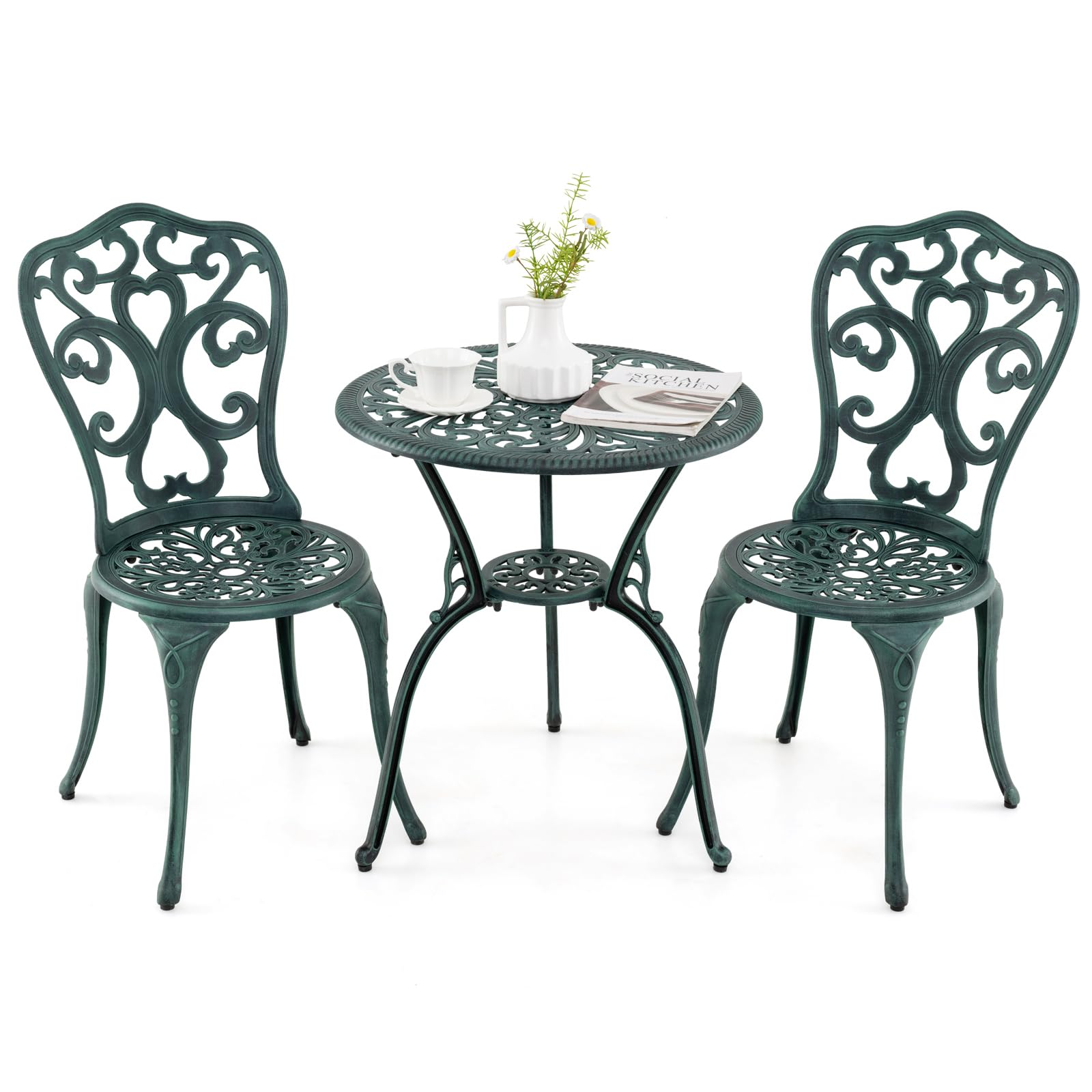 COSTWAY 3-TLG. Gartenmöbel Set, Bistrotisch mit 2 Stühlen, wetterfestes Balkonset, Balkonmöbel aus Aluminiumguss, Terrassenmöbel, Gartengarnitur, Sitzgruppe für Terrasse, Balkon, Garten (Grün)