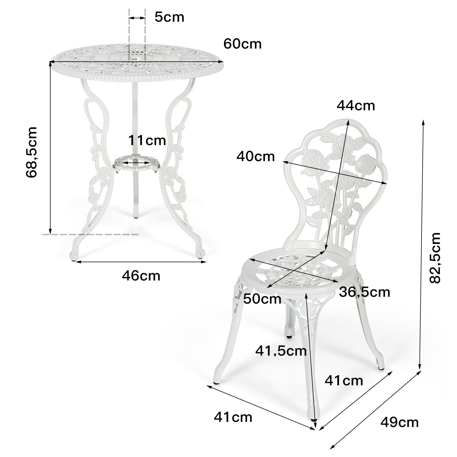 Technische Daten:Material: Aluminiumguss, GusseisenAbmessung des Tisches: 60 x 68,5 cm (Durchmesser x H)Abmessung des Stuhls: 41 x 49 x 82,5 cm (L x B x H)Tragfähigkeit des Tisches: 90 kgTragfähigkeit des Stuhls: 120 kg