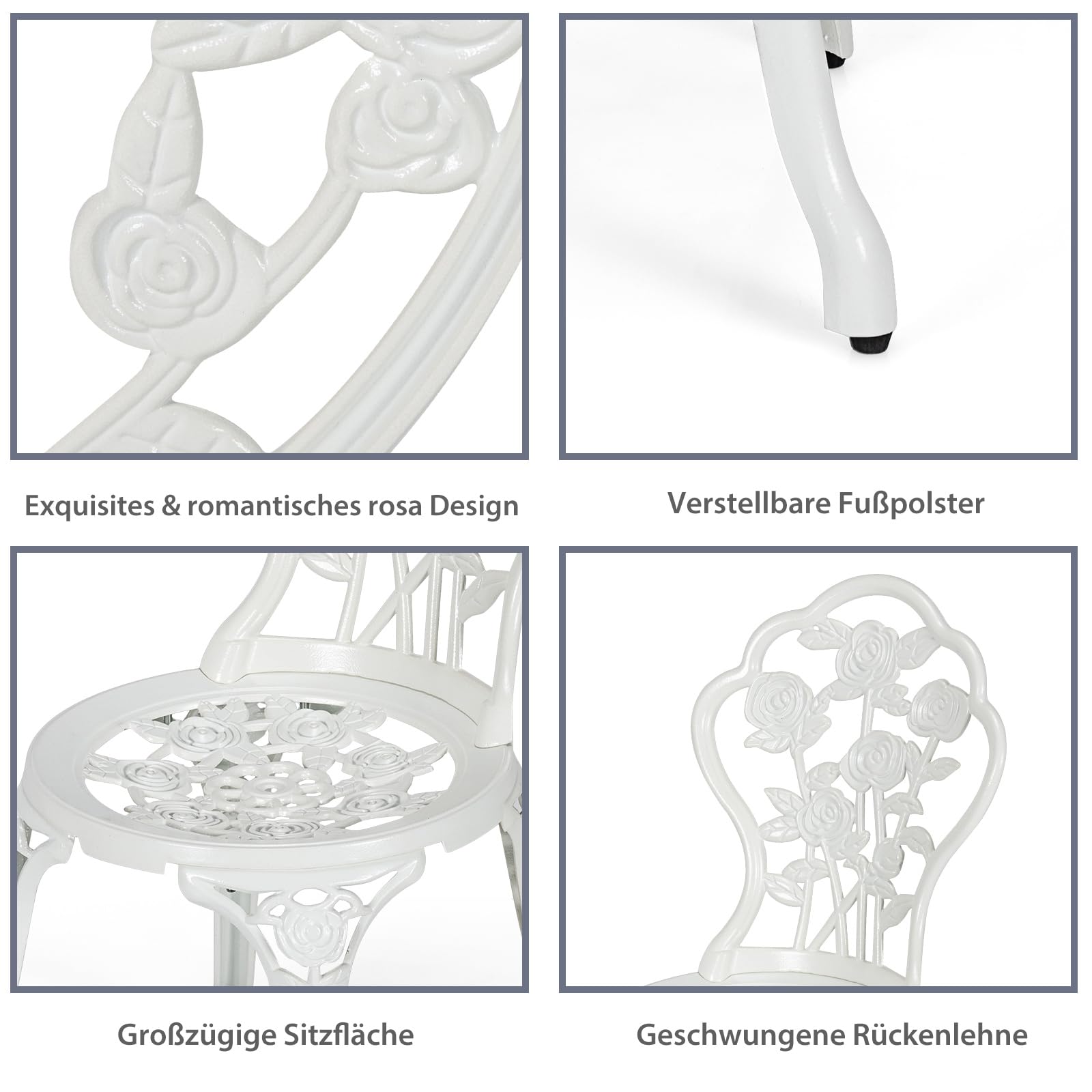 Beschreibung:Geniessen Sie Ihre Freizeit im Freien mit unserem schönen und praktischen 3-teiligen Bistroset. Hergestellt aus rostfreiem Aluminium- und Gusseisenguss, hält dieses Set den verschiedenen Jahreszeiten stand. Das Besondere an diesem Bistroset ist sein antikes und exquisites Aussehen. Dieses Bistro-Set ist eine wunderbare Dekoration für Ihren Garten und hinterlässt einen tiefen Eindruck bei Ihren Gästen. Der Gartentisch mit der runden Tischplatte hat ein Sonnenschirmloch, so dass ein Sonnenschirm am Tisch befestigt werden kann, der bei Sonne Schatten spendet und bei Regen schützt. So können Sie Ihre Freizeit wetterunabhängig geniessen. Kaufen Sie das Set jetzt, es wird Sie nie im Stich lassen.