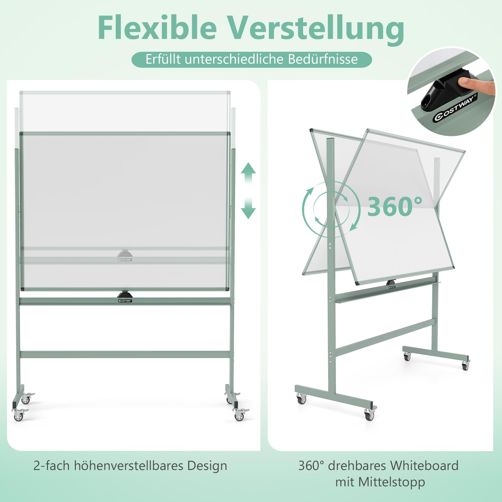Beschreibung:Dieses doppelseitige Whiteboard mit einstellbarer Höhe kann auf 160 cm oder 180 cm angepasst werden und erfüllt die Bedürfnisse von Erwachsenen und Kindern.Darüber hinaus werden Präsentationen, interaktiver Unterricht oder Eltern-Kind-Aktivitäten mit diesem mobilen stehenden Whiteboard effizienter.Die grosse Schreibfläche ermöglicht das gleichzeitige Ausführen mehrerer Projekte, ohne vorherige Notizen löschen zu müssen.Drücken Sie einfach auf den Stopper, um zwischen 2 Whiteboards zu wechseln und stressfrei mit Ihrer Präsentation fortzufahren.Mit 4 Rollen mit Bremse können Sie das doppelseitige Whiteboard nach Bedarf einfach bewegen und befestigen.