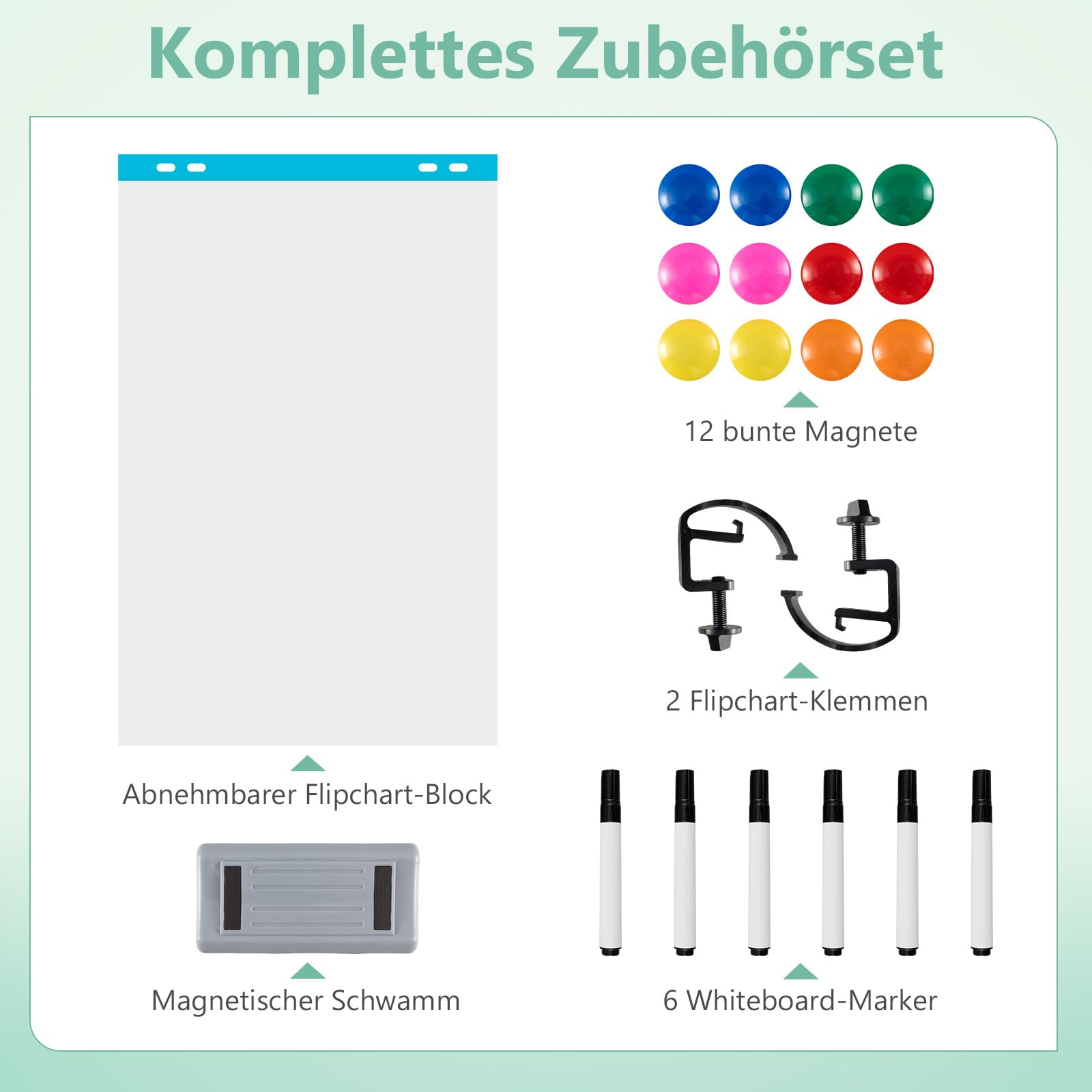 Lieferungsumfang:1 x Doppelseitiges mobiles Whiteboard1 x Radierer1 x Anleitung1 x Flipchart Block2 x Clips6 x Marker12 x Magneten