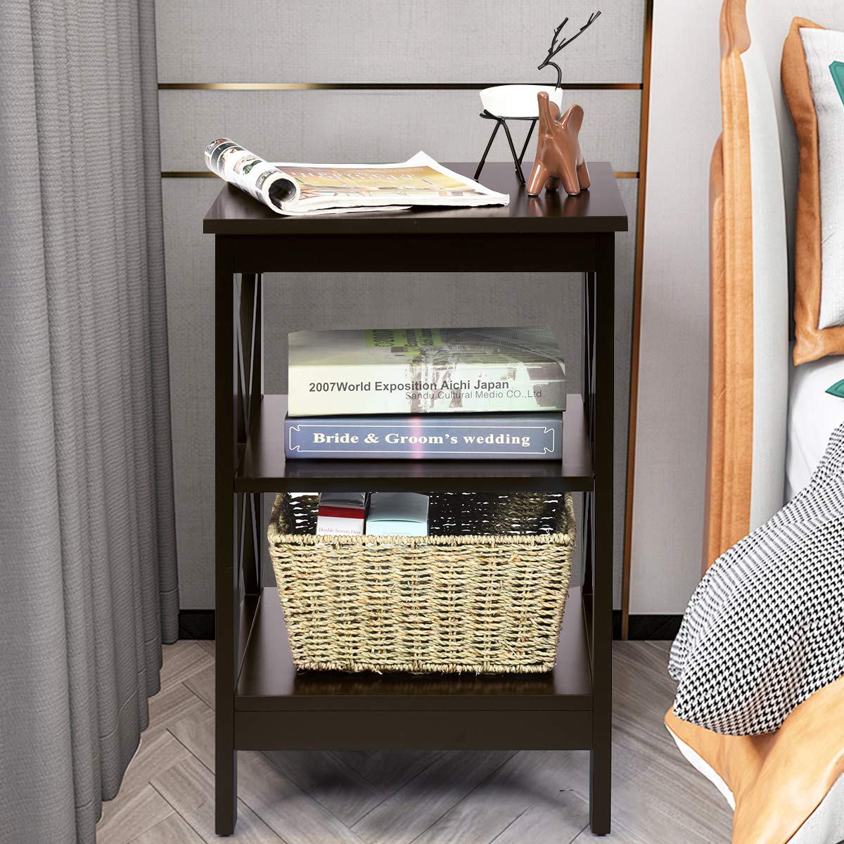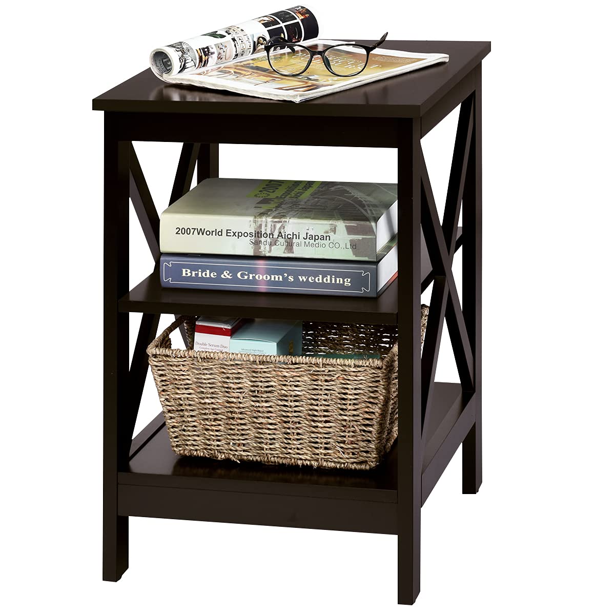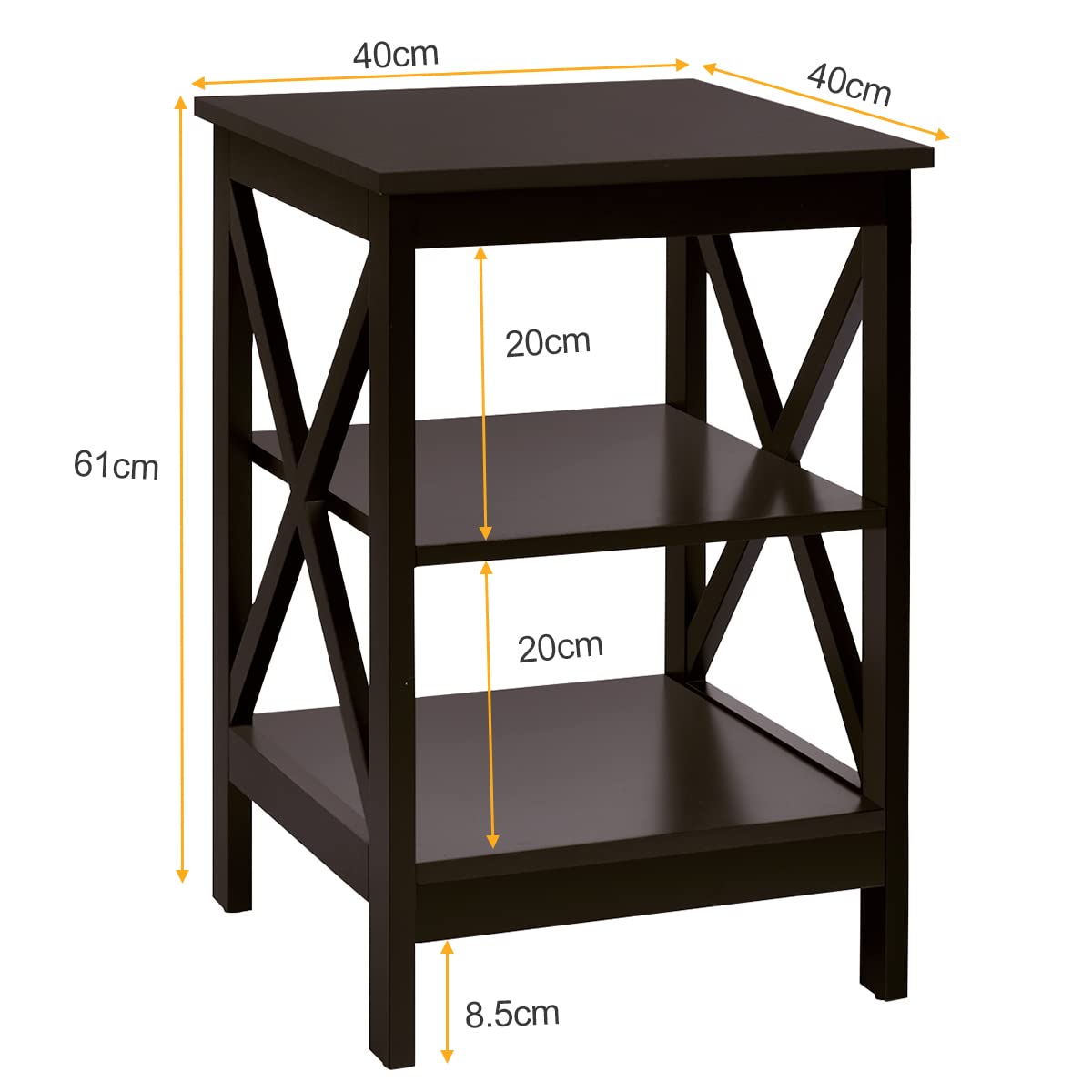 COSTWAY Nachttisch 3 Ebenen, Beistelltisch Nachtschrank, Sofatisch Couchtisch für Schlafzimmer, Wohnzimmer 40x40x61cm (X-förmig, Braun)