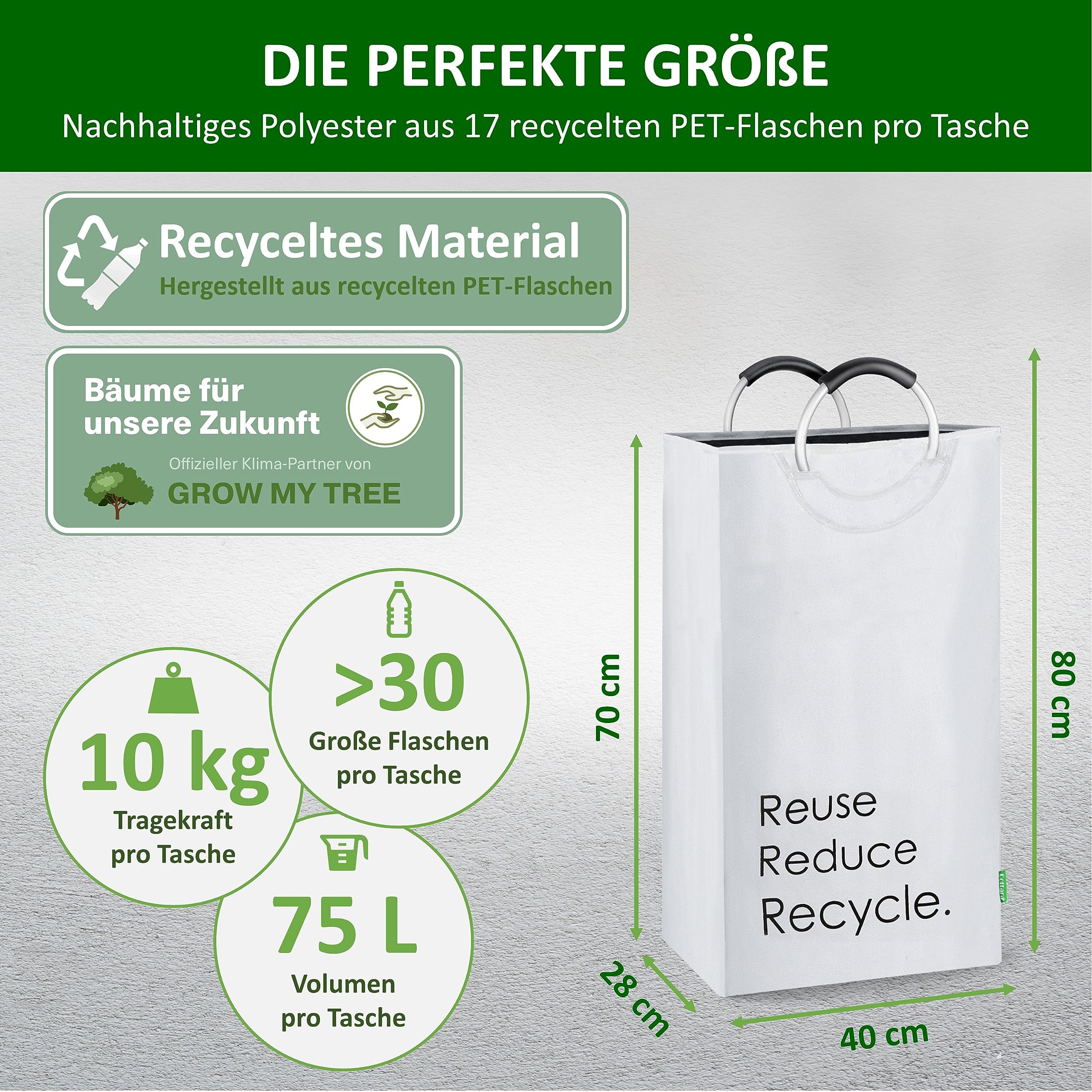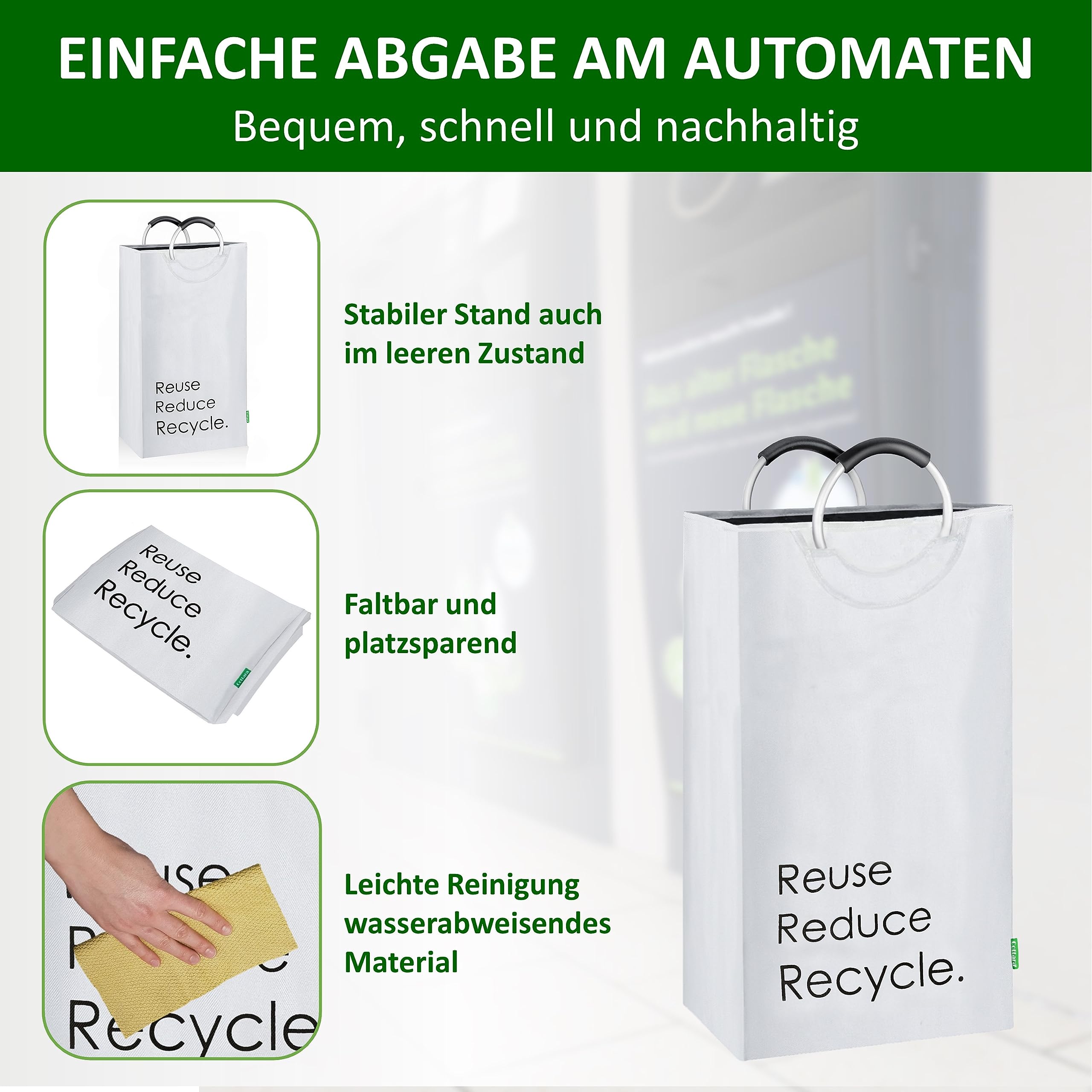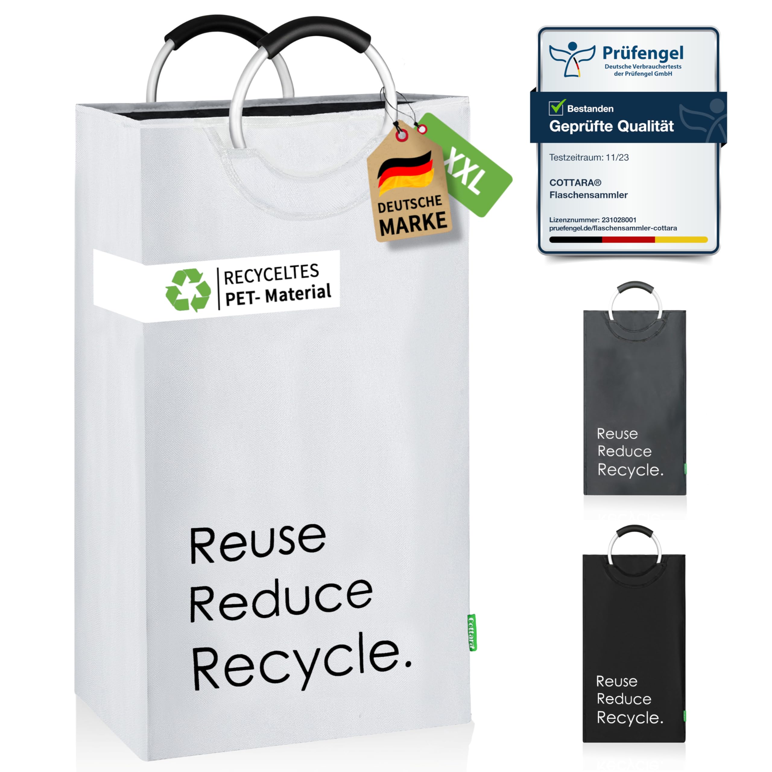 Der Cottara Flaschensammler. Die optimale und schicke Lösung zur Aufbewahrung und Sammeln von Pfandflaschen, Leergut, Altglas oder Dosen. Endlich keine alten Einkaufstüten mehr die überquellen oder unschöne gelbe oder blaue Säcke zum Aufbewahren der Pfandflaschen. Im Durchschnitt verbraucht jeder Deutsche im Jahr knapp 200 Pfandflaschen. Diese Pfandflaschen müssen alle gesammelt, aufbewahrt und dann im Supermarkt zurückgegeben werden. Dafür haben wir jetzt die optimale Lösung für dich. Der Cottara Flaschensammler!Aber warum solltest du dich für genau unseren Flaschensammler entscheiden? Das ist ganz einfach:STABILE GRIFFE:Unsere Flaschentasche hat 2 Soft Grip Aluminium Griffe, die mit Nieten gesichert sind, um auch schweren Lasten Stand zu halten und dabei ein angenehmes Tragegefühl zu bieten. TOP QUALITÄT:Unser Flaschen Sammelbehälter ist aus hochwertigen Materialien, die für eine lange Lebensdauer garantieren. Der Flaschen Behälter ist aus flexiblem, stabilen und abwaschbarem Polyester Gewebe mit einem verstärkten Boden und steht deshalb von allein aufrecht auch ohne FüllungSMARTES DESIGN:Die Pfandflaschen Tasche hat einen stylischen Aufdruck, kann einfach flexibel zusammengefaltet werden und bei Bedarf einfach gereinigt werden. Das Polyester ist wasserabweisend und Verschmutzungen können so einfach weggewischt werdenFLEXIBLER EINSATZ:Der Flaschensammler ist perfekt für die Aufbewahrung von Pfandflaschen, Leergut, Altglas, Glasflaschen, Plastikflaschen oder Dosen. Auch andere Haushaltsgegenstände können einfach verstaut und organized werdenPreis exkl. USt. da Kleinunternehmer gemäss § 1