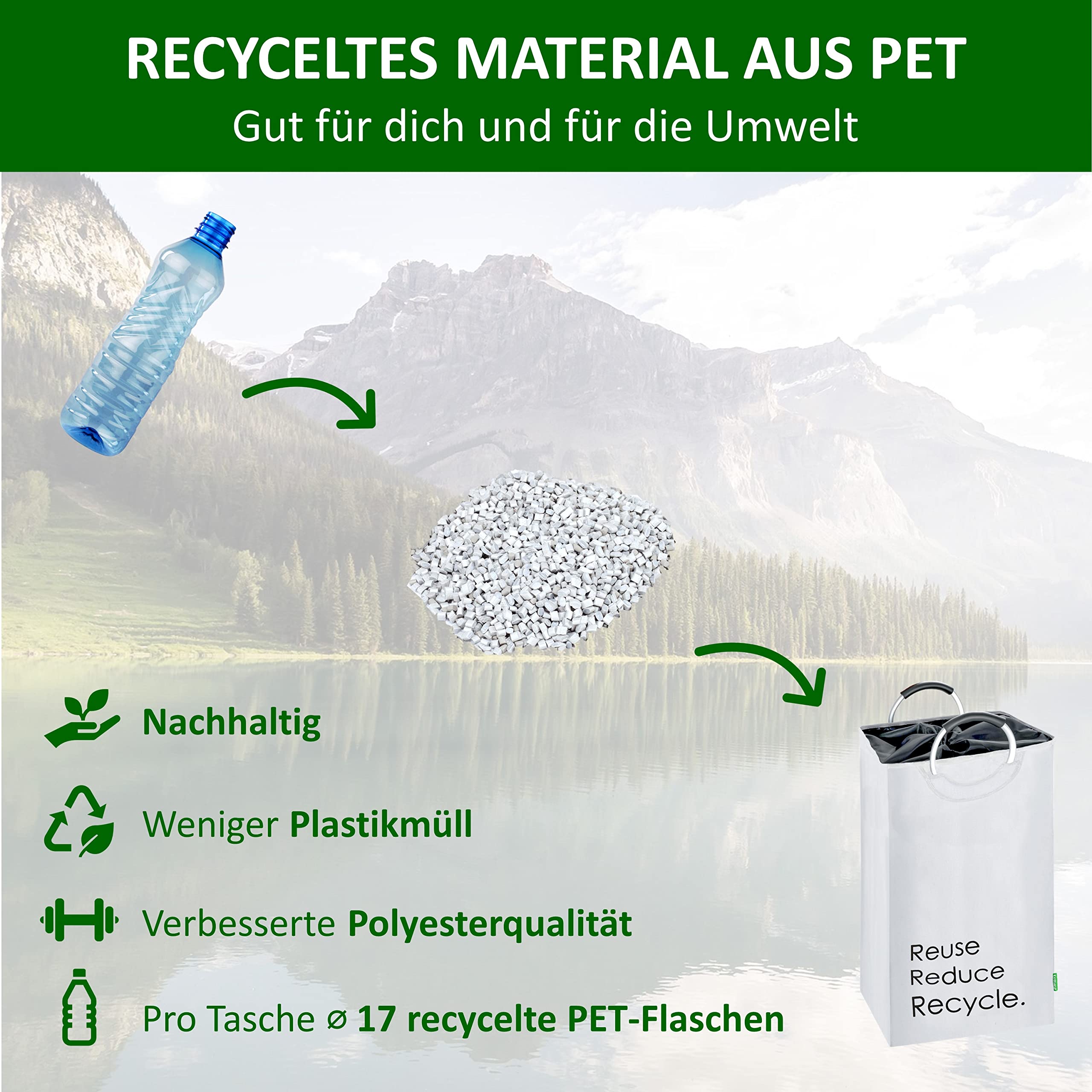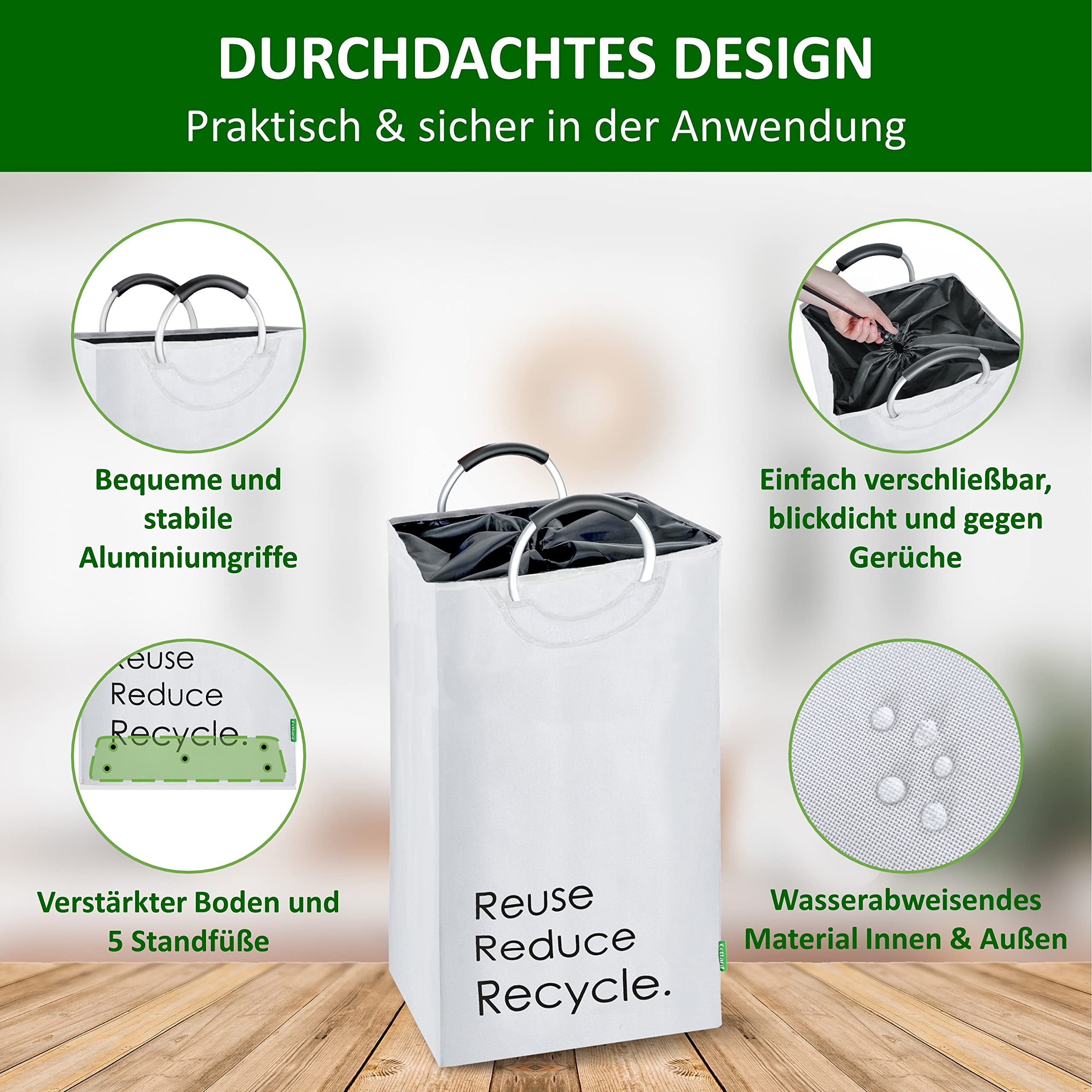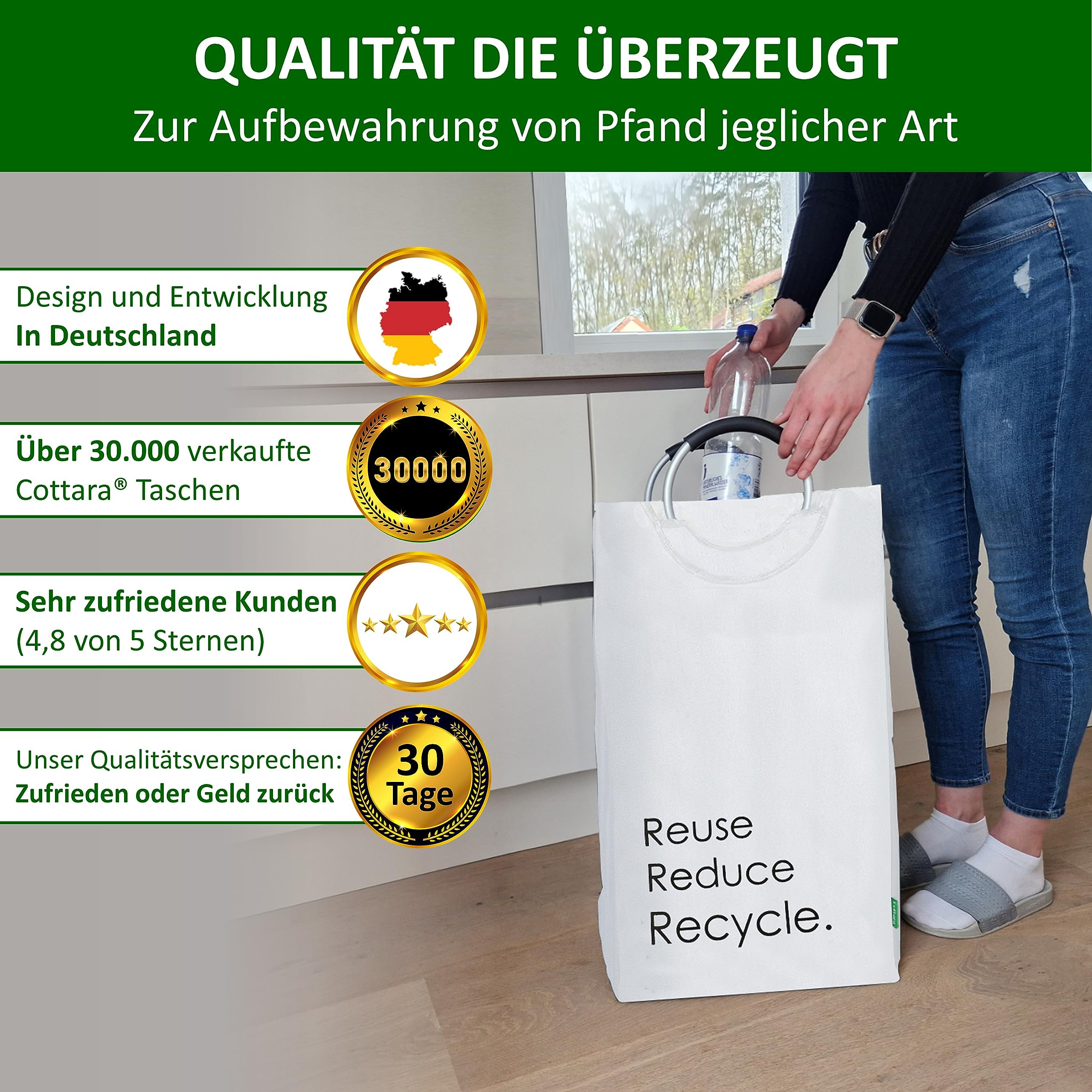Der Cottara Flaschensammler. Die optimale und schicke Lösung zur Aufbewahrung und Sammeln von Pfandflaschen, Leergut, Altglas oder Dosen. Endlich keine alten Einkaufstüten mehr die überquellen oder unschöne gelbe oder blaue Säcke zum Aufbewahren der Pfandflaschen. Im Durchschnitt verbraucht jeder Deutsche im Jahr knapp 200 Pfandflaschen. Diese Pfandflaschen müssen alle gesammelt, aufbewahrt und dann im Supermarkt zurückgegeben werden. Dafür haben wir jetzt die optimale Lösung für dich. Der Cottara Flaschensammler!Aber warum solltest du dich für genau unseren Flaschensammler entscheiden? Das ist ganz einfach:STABILE GRIFFE:Unsere Flaschentasche hat 2 Soft Grip Aluminium Griffe, die mit Nieten gesichert sind, um auch schweren Lasten Stand zu halten und dabei ein angenehmes Tragegefühl zu bieten. TOP QUALITÄT:Unser Flaschen Sammelbehälter ist aus hochwertigen Materialien, die für eine lange Lebensdauer garantieren. Der Flaschen Behälter ist aus flexiblem, stabilen und abwaschbarem Polyester Gewebe mit einem verstärkten Boden und steht deshalb von allein aufrecht auch ohne FüllungSMARTES DESIGN:Die Pfandflaschen Tasche hat einen stylischen Aufdruck, kann einfach flexibel zusammengefaltet werden und bei Bedarf einfach gereinigt werden. Das Polyester ist wasserabweisend und Verschmutzungen können so einfach weggewischt werdenFLEXIBLER EINSATZ:Der Flaschensammler ist perfekt für die Aufbewahrung von Pfandflaschen, Leergut, Altglas, Glasflaschen, Plastikflaschen oder Dosen. Auch andere Haushaltsgegenstände können einfach verstaut und organized werdenPreis exkl. USt. da Kleinunternehmer gemäss § 1