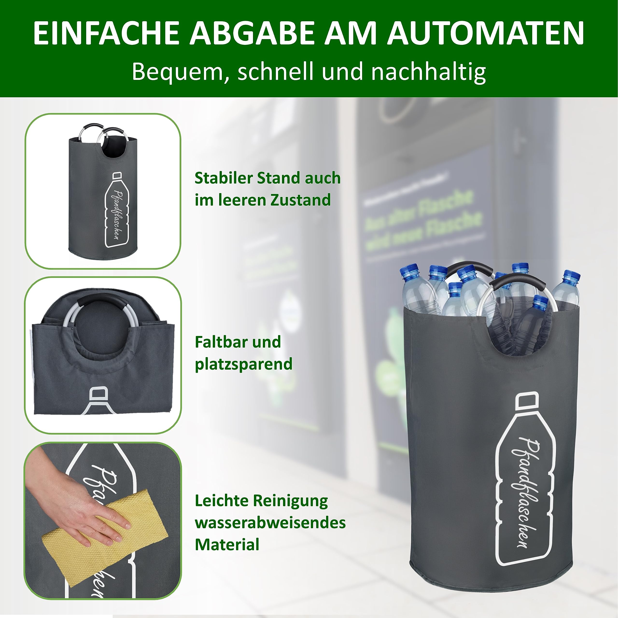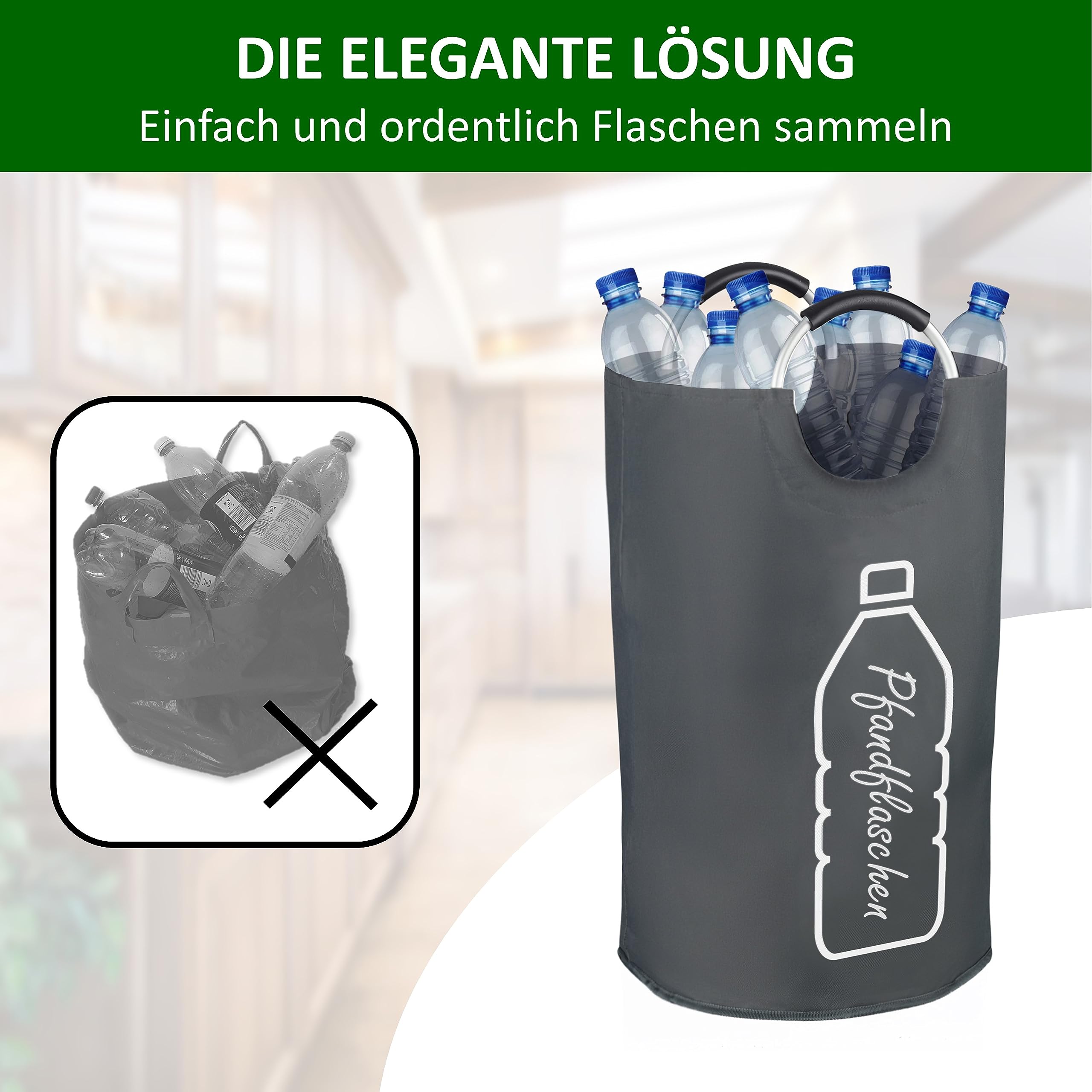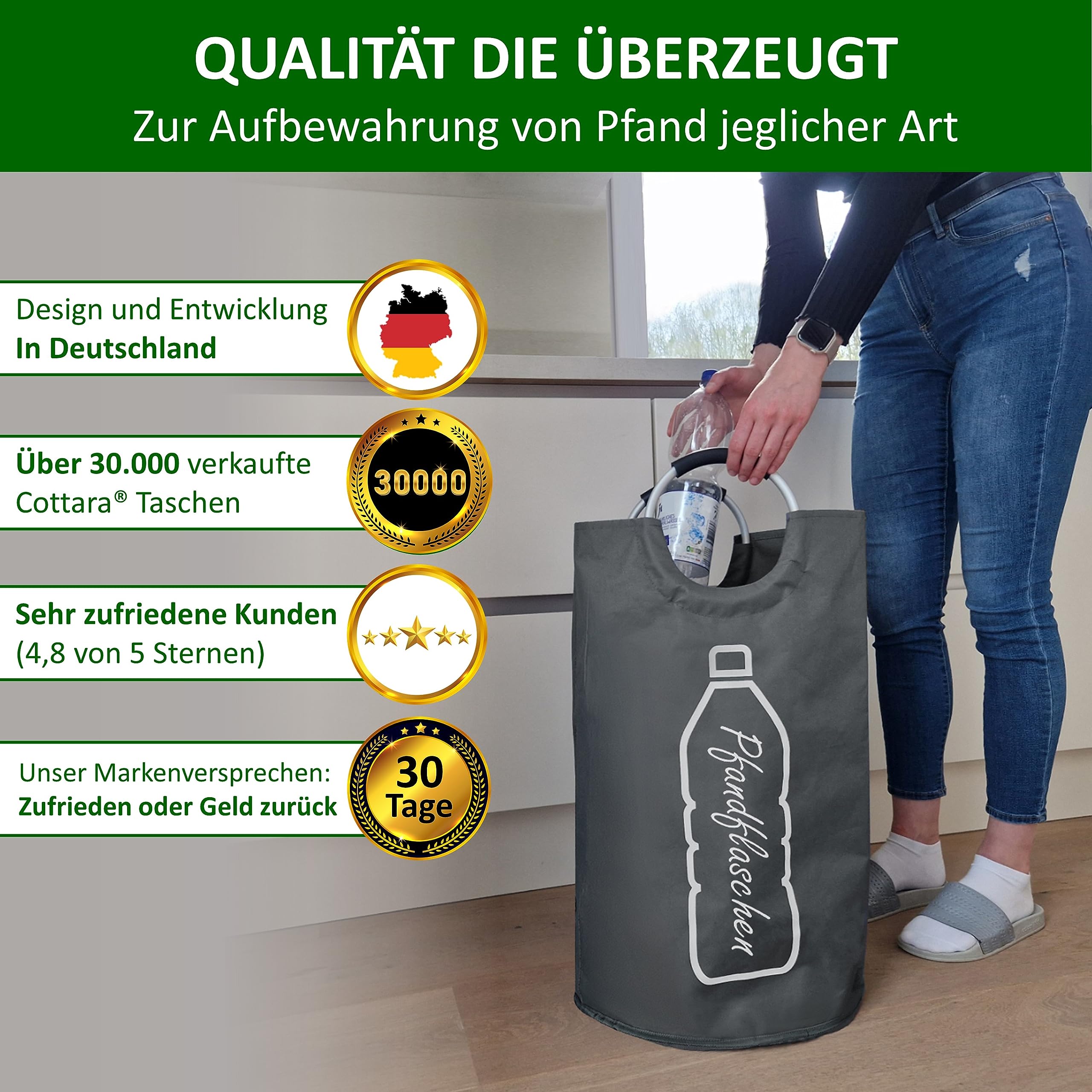 Der Cottara Flaschensammler. Die optimale und schicke Lösung zur Aufbewahrung und Sammeln von Pfandflaschen, Leergut, Altglas oder Dosen. Endlich keine alten Einkaufstüten mehr die überquellen oder unschöne gelbe oder blaue Säcke zum Aufbewahren der Pfandflaschen. Im Durchschnitt verbraucht jeder Deutsche im Jahr knapp 200 Pfandflaschen. Diese Pfandflaschen müssen alle gesammelt, aufbewahrt und dann im Supermarkt zurückgegeben werden. Dafür haben wir jetzt die optimale Lösung für dich. Der Cottara Flaschensammler!Aber warum solltest du dich für genau unseren Flaschensammler entscheiden? Das ist ganz einfach:STABILE GRIFFE:Unsere Flaschentasche hat 2 Soft Grip Aluminium Griffe, die mit Nieten gesichert sind, um auch schweren Lasten Stand zu halten und dabei ein angenehmes Tragegefühl zu bieten. TOP QUALITÄT:Unser Flaschen Sammelbehälter ist aus hochwertigen Materialien, die für eine lange Lebensdauer garantieren. Der Flaschen Behälter ist aus flexiblem, stabilen und abwaschbarem Polyester Gewebe mit einem verstärkten Boden und steht deshalb von allein aufrecht auch ohne FüllungSMARTES DESIGN:Die Pfandflaschen Tasche hat einen stylischen Aufdruck, kann einfach flexibel zusammengefaltet werden und bei Bedarf einfach gereinigt werden. Das Polyester ist wasserabweisend und Verschmutzungen können so einfach weggewischt werdenFLEXIBLER EINSATZ:Der Flaschensammler ist perfekt für die Aufbewahrung von Pfandflaschen, Leergut, Altglas, Glasflaschen, Plastikflaschen oder Dosen. Auch andere Haushaltsgegenstände können einfach verstaut und organized werdenPreis exkl. USt. da Kleinunternehmer gemäss § 1