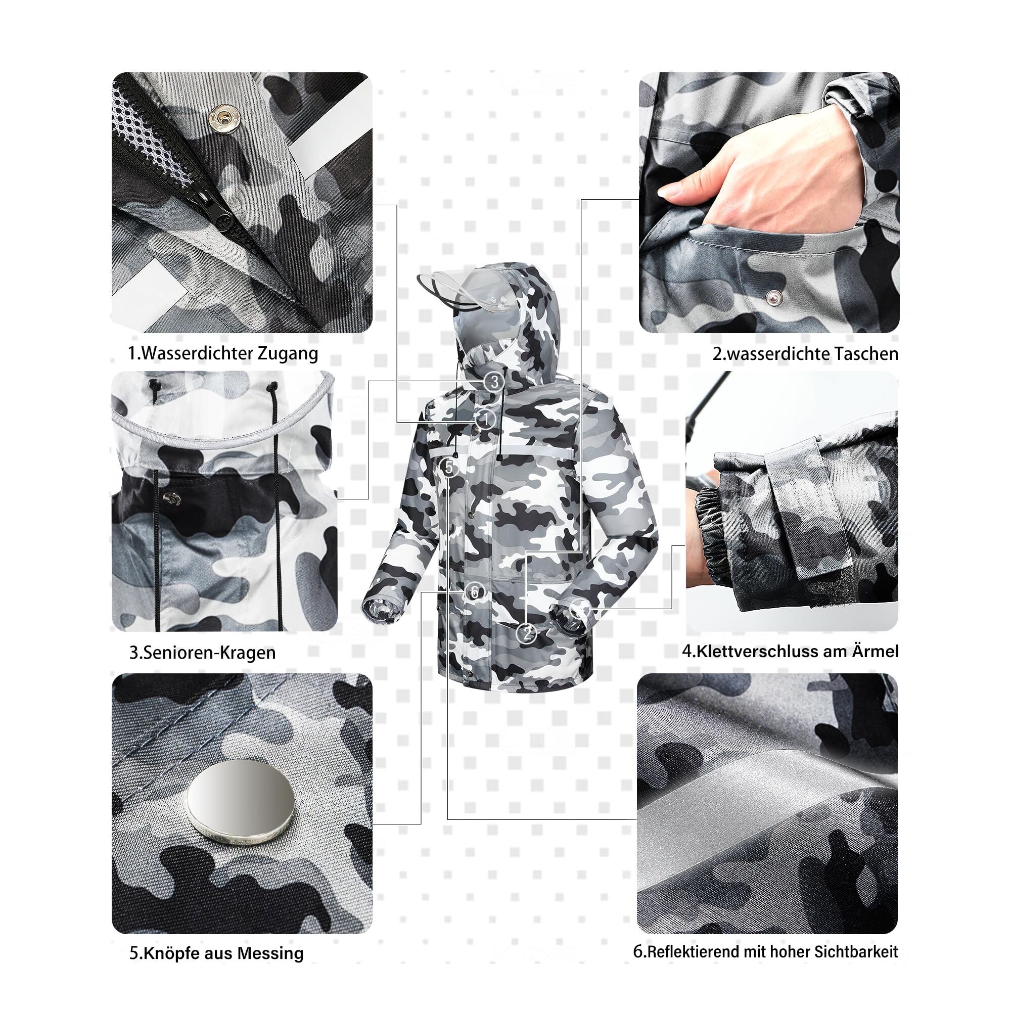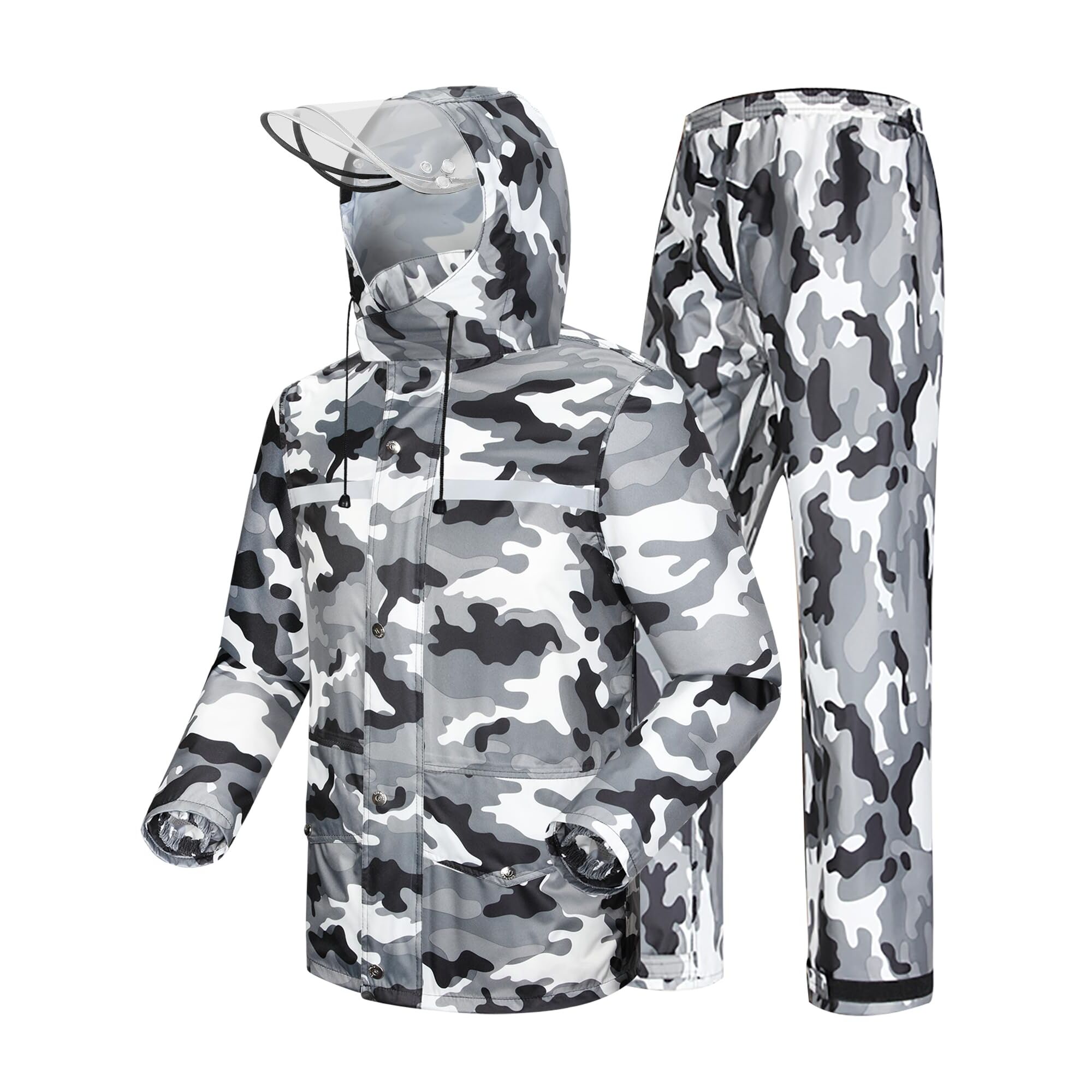 Coutyuyi Herren- und Damen-Regenanzug, reflektierend, 100 % wasserdicht, Outdoor-Regenmantel, winddicht, Regenjacke, graue Tarnung, L. Material: besteht aus wasserfestem und umweltfreundlichem Nano-Gewebe, das sehr regenfest, wasser- und winddicht ist. Und das Lotusblatt ist wasserdicht, geruchlos, weich, angenehm, antioxidativ, entschleimt nicht und so weiter. Diese Funktionen sind auf eine hohe Langlebigkeit ausgelegt. Die Grösse des Regenmantels fällt locker aus. Wenn Ihnen die Passform gefällt, können Sie eine Nummer kleiner bestellen. Wasserdicht: Jede Naht ist mit einer speziellen Imprägnierung behandelt, um sicherzustellen, dass an der Naht kein Tropfen austritt. Selbst bei besonders starkem Regen müssen Sie keine Angst haben, nass zu werden. Regenhosen können sogar als Aquarium zur Fischzucht genutzt werden. Transparente Maske: Vor dem Hut befindet sich eine abnehmbare doppelschichtige wasserdichte und regensichere transparente Maske, die den Regen abhält, aber dennoch eine klare Sicht bietet. Sicherheit: Um Ihre Sicherheit nachts im Regen zu gewährleisten, haben wir hochfeste reflektierende Streifen vor und nach dem Regenmantel entwickelt, die eine verschwommene Sicht auf die regnerischen Tage ermöglichen und es anderen ermöglichen, Ihre Existenz in der Ferne zu entdecken. Funktion: Auf der Vorderseite befinden sich zwei übergrosse wasserdichte Taschen, die es Ihnen ermöglichen, an regnerischen Tagen mehr Dinge mitzunehmen, und es verfügt über einen wasserdichten Deckel, der den Inhalt der Tasche nicht durchnässt.