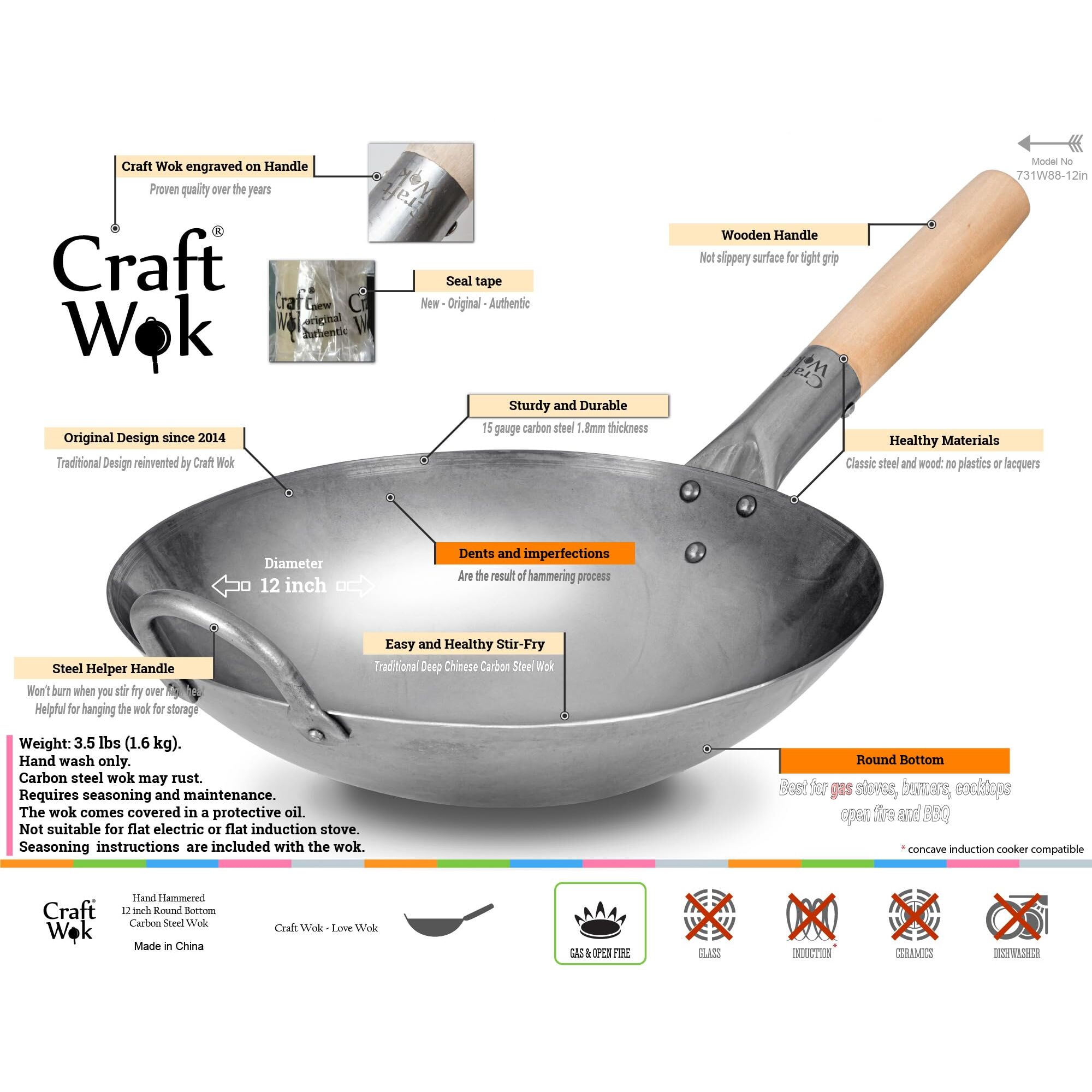 Wichtige Dinge zu beachten: dieser Wok hat einen runden Boden: nicht geeignet für flache elektrische oder flache Induktionsbereiche. Dieser Wok ist schwer und stabil. Wok Gewicht:3.5 Pfund (1.6kg) Ø 30,5 cm Dieser Wok muss vor Gebrauch eingebrannt werden. Jeder Wok aus Karbonstahl, einschliesslich diesem, kann rosten, wenn er nicht richtig gepflegt wird. Es kann einige Zeit dauern, um zu lernen, wie man den Wok aus Karbonstahl pflegt. Der Hauptzweck des Woks ist das "Rühren" – schnelles Braten mit häufigem Rühren auf einer heissen Pfanne, aber zusätzlich kann die Wokpfanne als Gefäss zum Frittieren von Speisen in heissem Öl und zur Zubereitung verschiedener Suppen verwendet werden. Es kann auch als Dampfgarer und sogar als Smoker verwendet werden. Der Wok aus Stahl eignet sich für offenes Feuer, und Sie können ihn sogar ausserhalb des Hauses mitnehmen und Freunde mit unglaublichen chinesischen Gerichten überraschen. Denken Sie immer daran, einen Wok aus Karbonstahl zu würzen! Anleitungen dazu finden Sie im Internet und auch mit dem Wok. Runder Boden: nicht geeignet für flache Elektro- und Flachinduktionsherde. Einfache Rückerstattung: Wenn etwas nicht stimmt, zögern Sie nicht, uns zu kontaktieren. Denken Sie immer daran, einen Wok aus Karbonstahl zu würzen! Anleitungen dazu finden Sie im Internet und auch mit dem Wok. Küchenutensilien aus Karbonstahl müssen gewürzt und gewartet werden, um Rost zu vermeiden. Tipp: trocknen und Wok jederzeit geölt halten, besonders nach dem Waschen. Waschroutine: Waschen – Trocknen – Öl – Feuer (wo trocken bedeutet trocken mit Papier- oder Stofftüchern)