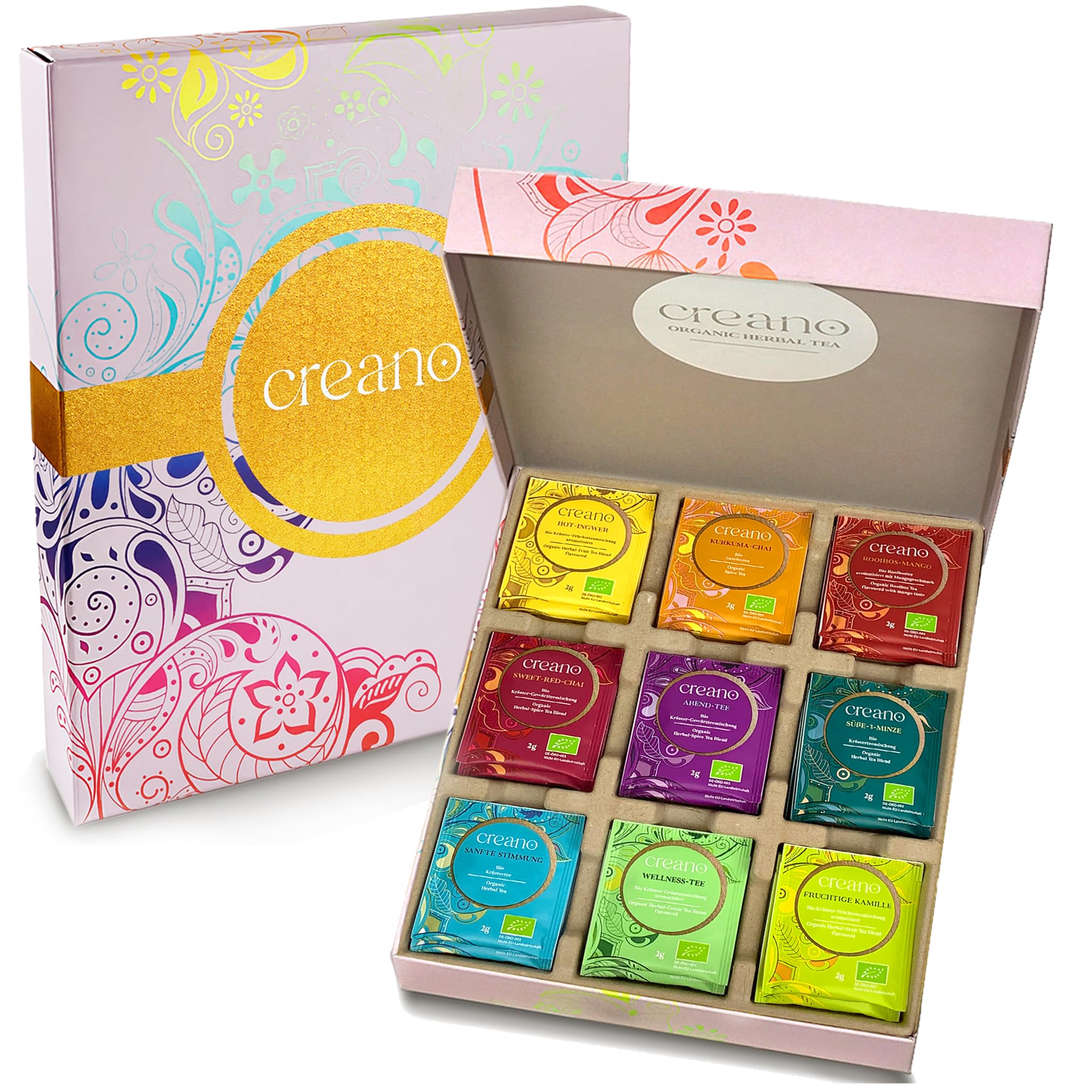 • Creano Bio-Kräuter-Früchte-Gewürztee Mix Geschenkset „Organic Herbal Tea“ ist eine einzigartige Mischung aus den unterschiedlichen Bio-Tee-Sorten: Fruchtige-Kamille, Hot-Ingwer, Kurkuma-Chai, Rooibos-Mango, Sweet-Red-Chai, Abend-Tee, Süsse-Minze, Sanfte-Stimmung und Wellness-Tee; 100% Bio, 9 x 5 Teebeutel