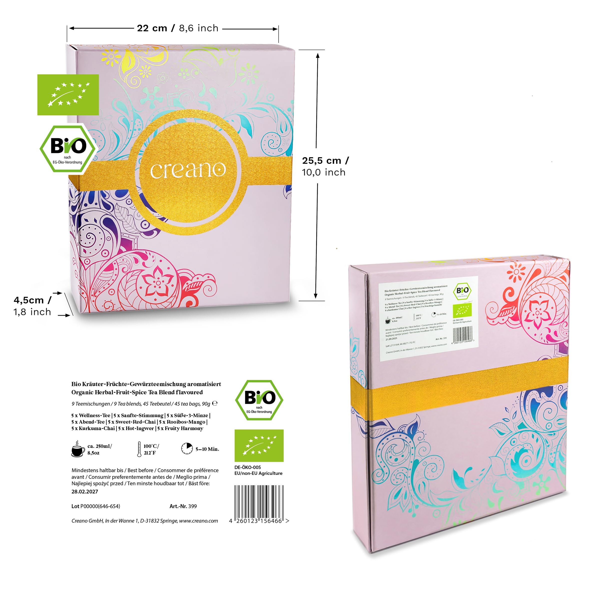 Geniessen Sie die Geschmacksvielfalt von Creano's Organic Kräutertea, einer einzigartigen Mischung aus 9 Bio-Tees in 45 Teebeuteln. Jeder Geschmack ist zu 100% biologisch und enthält eine einzigartige Kombination aus Kräutern, Früchten und Gewürzen mit oder ohne fruchtige Aromen. Der Tee ist natürlich entkoffeiniert und enthält Zutaten wie Rooibos, Kamille, Pfefferminze, Kreuzminze, Apfelminze, Zitronengras, Brennnesselblätter, Melisse, Fenchel, Apfel, Zitronenverbene, Lavendelblüten, Hagebuttenschale, Silberlindenblüten, Süssholzwurzel, Ingwer, Kurkuma, Zimt, Pfeffer, Orange, Zitrone, Grapefruit und Mango. Die Teebeutel sind perfekt für den Einsatz überall und zu jeder Tageszeit, von der Entspannung über Stressabbau bis hin zu besserem Schlaf. Halten Sie die Teebeutel trocken und kühl zu lagern und giessen Sie sie mit frisch gekochtem Wasser, um sie mindestens 5 (max. 10) Minuten ziehen lassen. Ideal als Geburtstagsgeschenk, Weihnachtsgeschenk, Firmengeschenk, Geschenk zum Jubiläum, Ostern oder als Geschenk für Frauen und Männer.