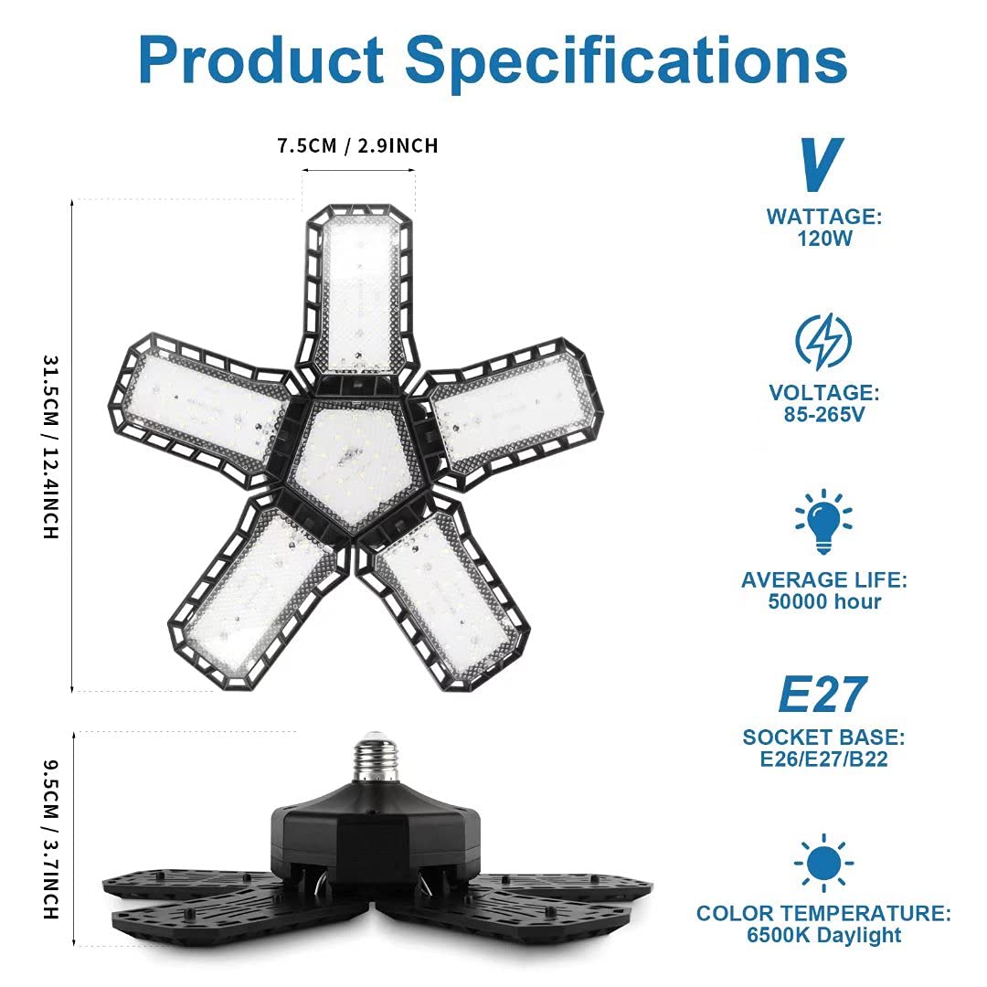 1,CREATESTAR 12000 Lumen Superhelles Garagenlicht.Diese LED Garagenleuchte verfügt über 5 superhelle,einstellbare LED-Köpfe mit 148 hochwertigen LED-Lampen12.000 Lumen,6500 K Tageslicht und 120 W LED-Leuchten können Ihre Garage oder Ihren Keller hell genug machen und Energie sparen, bequem und langlebig.