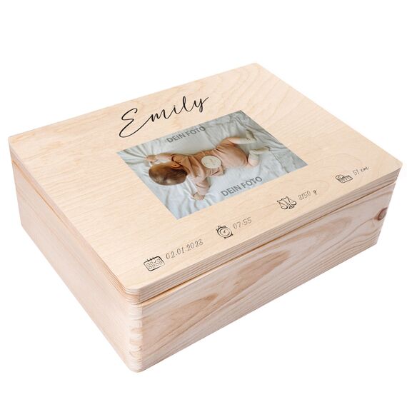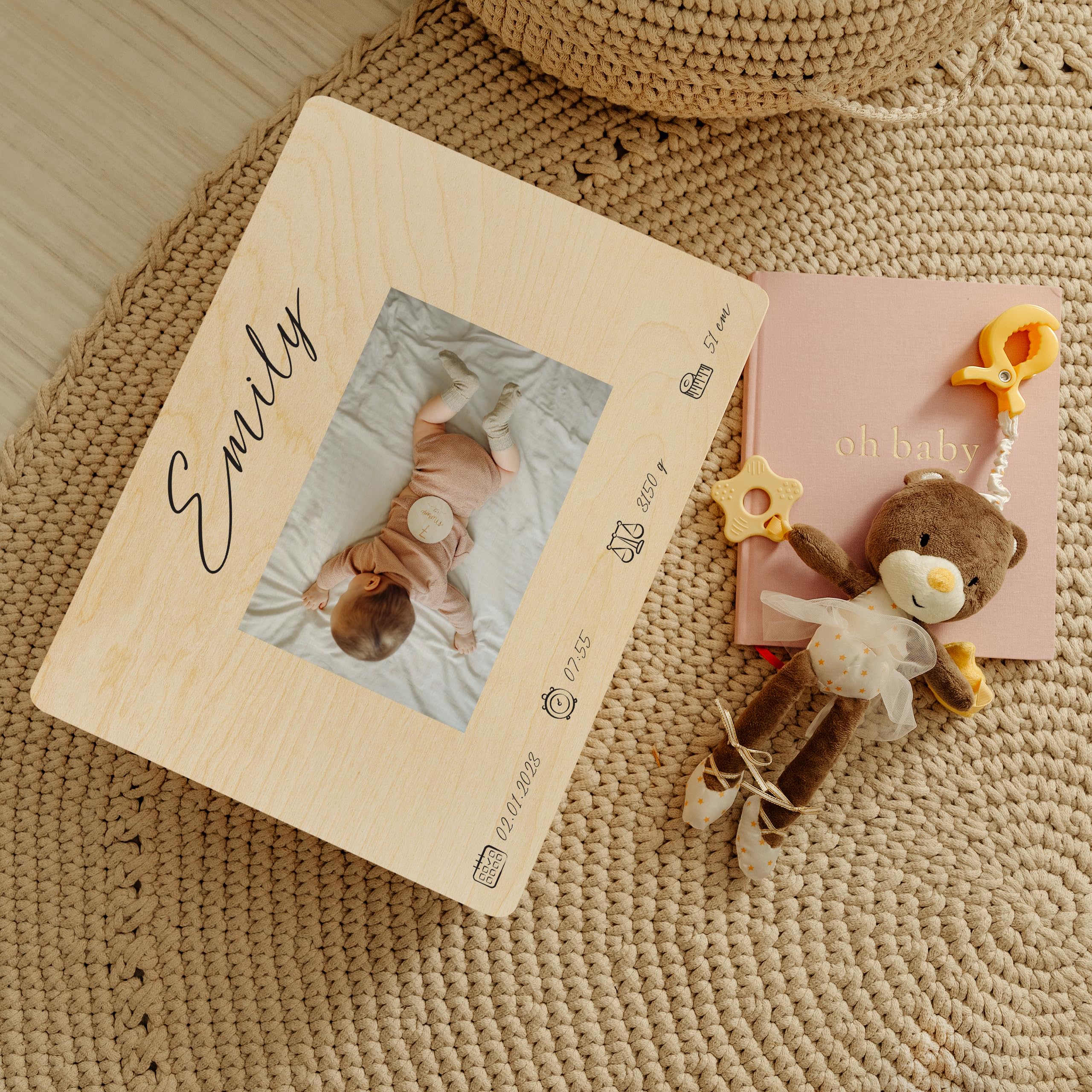 - 6 ANPASSUNGSDETAILS – Passen Sie alle 6 Geburtsdaten an, die auf die Erinnerungsbox gedruckt werden: Name, Foto, Geburtsdatum, Geburtszeit, Gewicht und Grösse.