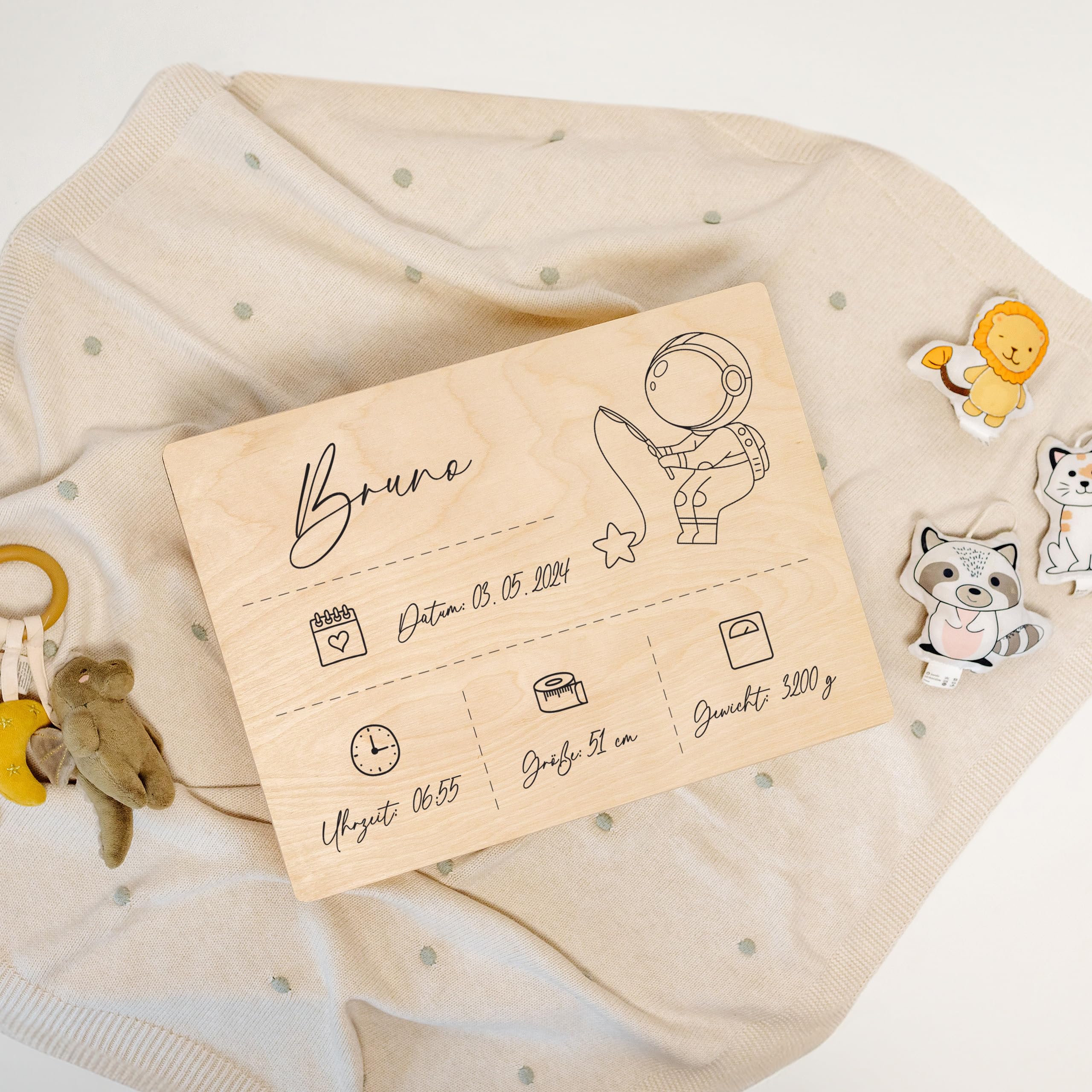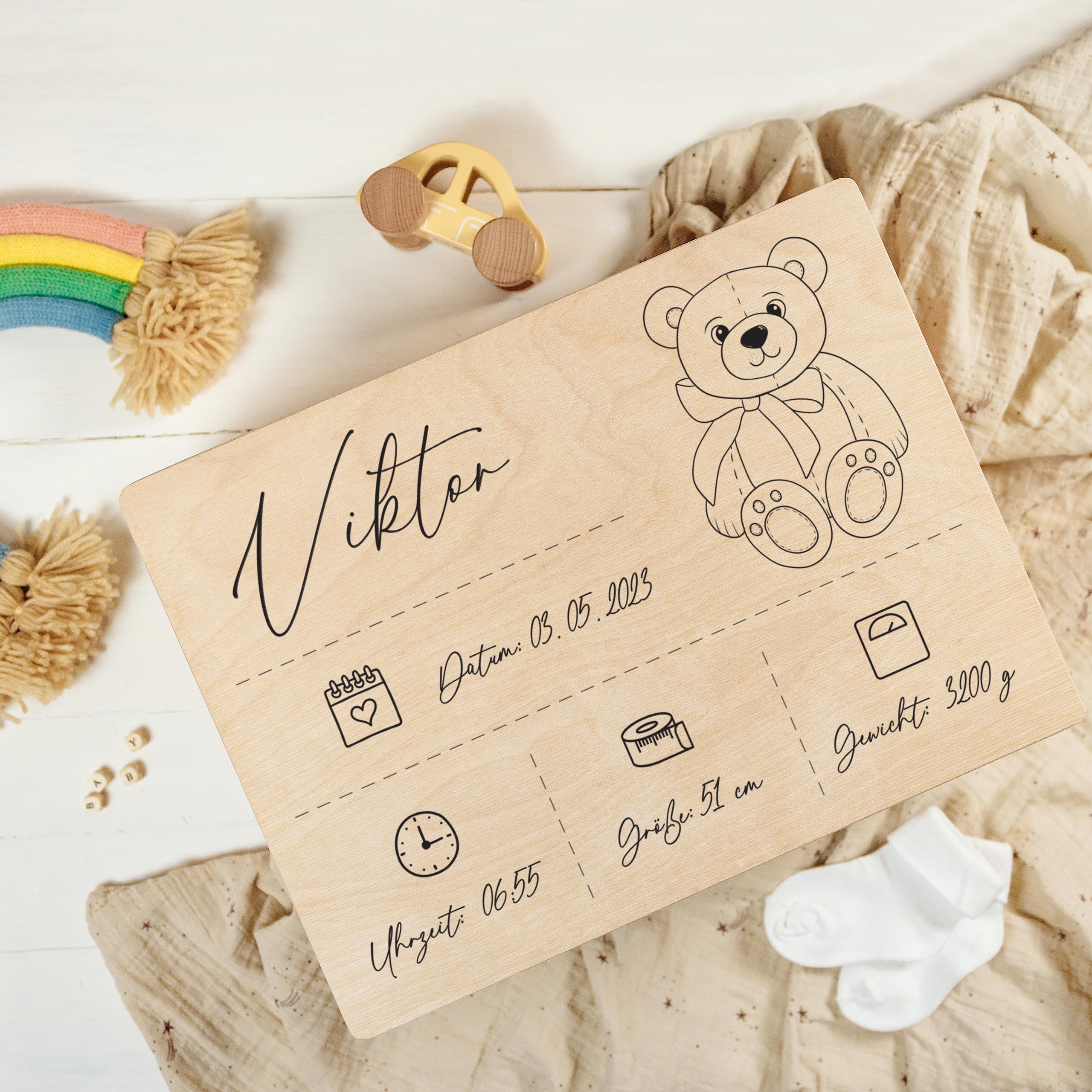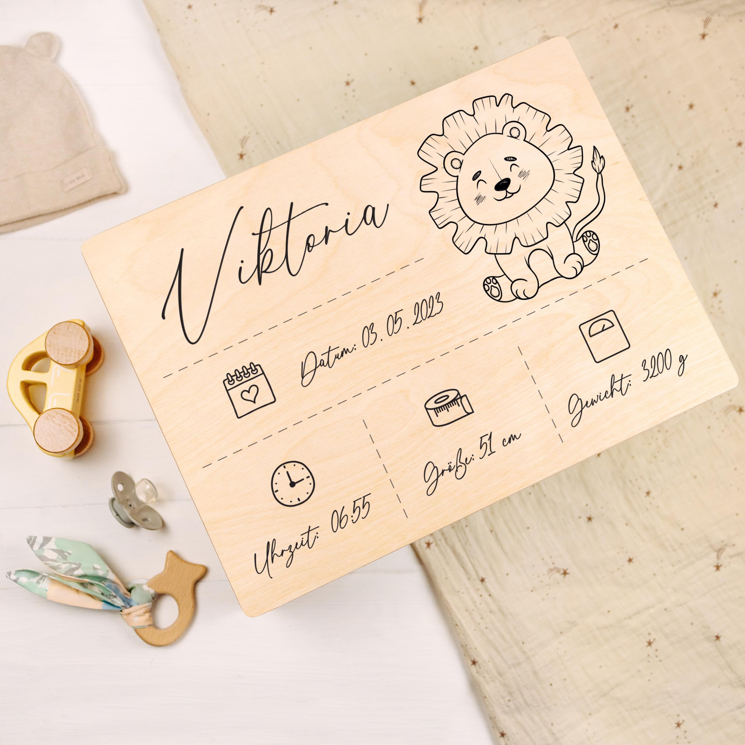 - 5 ANPASSUNGSDETAILS – Passen Sie alle 5 Geburtsdaten an, die auf die Erinnerungsbox gedruckt werden: Name, Geburtsdatum, Geburtszeit, Gewicht und Grösse.