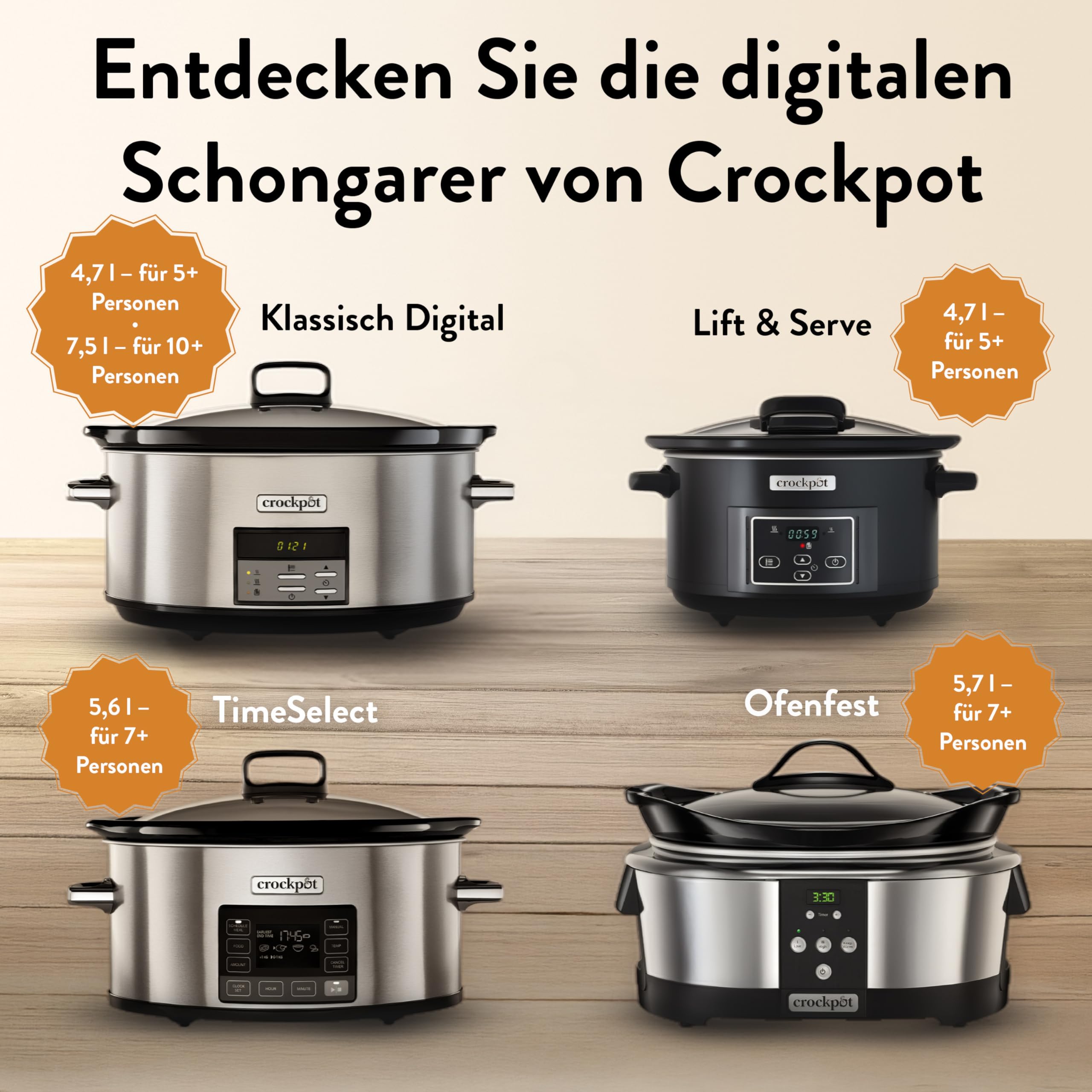 Mit diesem extra grossen digitalen Crockpot Schongarer können Sie köstliche Gerichte für die ganze Familie zubereiten oder Ihre Freunde zu einer Dinnerparty einladen. Das extra grosse Fassungsvermögen von 7,5 l ist ideal für grössere Familien und Dinner. Durch die dunkle Edelstahloberfläche mit gebürsteter Metalloptik ist der Schongarer ein stilvolles Element für jede Küche. Mit nur kurzer Vorbereitung übernimmt der Crockpot das Kochen, damit Sie Zeit für Ihre alltäglichen Aufgaben und mehr Zeit für Ihre Familie und Ihre Freunde haben. Wählen Sie die Temperatureinstellung (hoch oder niedrig) passend zum jeweiligen Gericht und legen Sie mit den One-Touch-Timer-Funktionen die gewünschte Kochzeit fest. Nach dem Kochen wechselt der Schongarer automatisch in die Warmhaltefunktion.