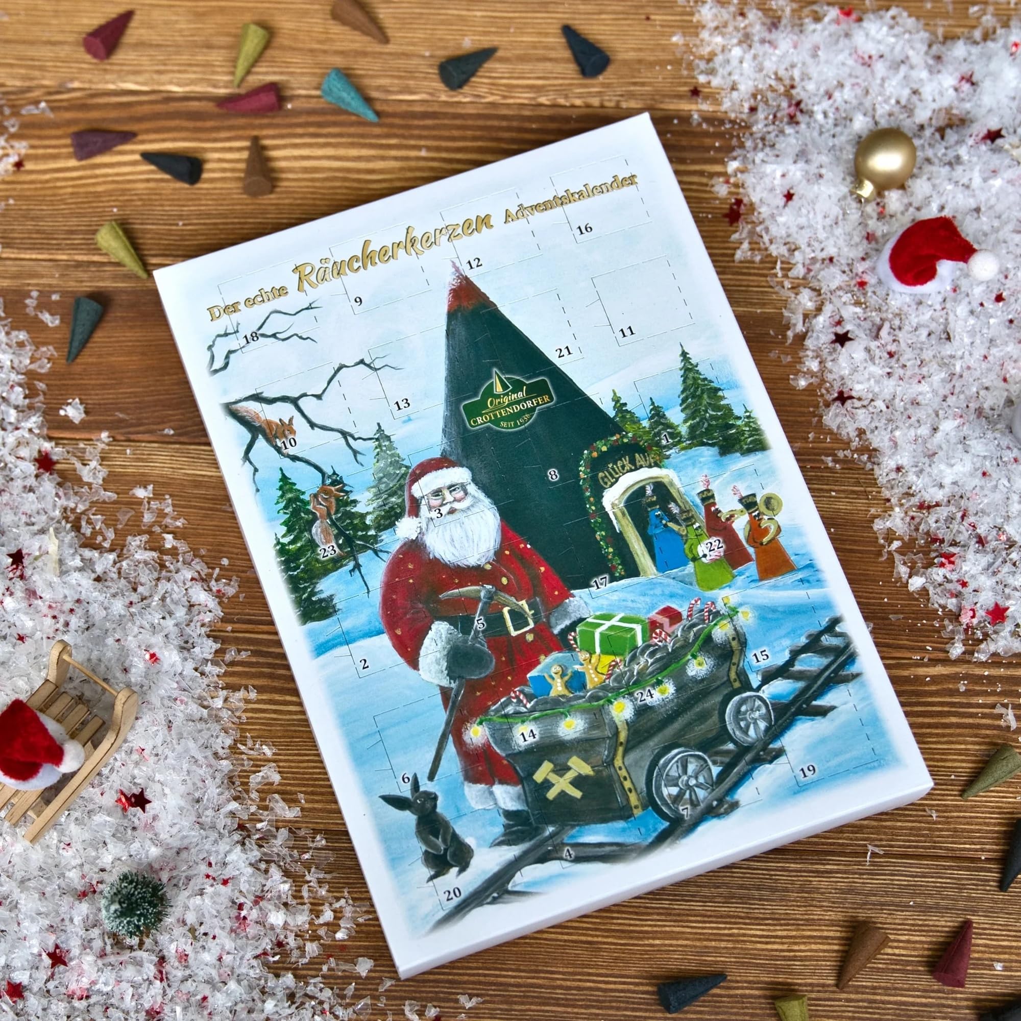 Crottendorfer Adventskalender - 24 Düfte - Hochformat (21x30cm) - Crottendorfer Räucherkerzen für Weihnachten - Räuchermännchen Zubehör - Mit Weihrauch, Myrrhe, Zimt, Vanille, Tanne - Made in Germany