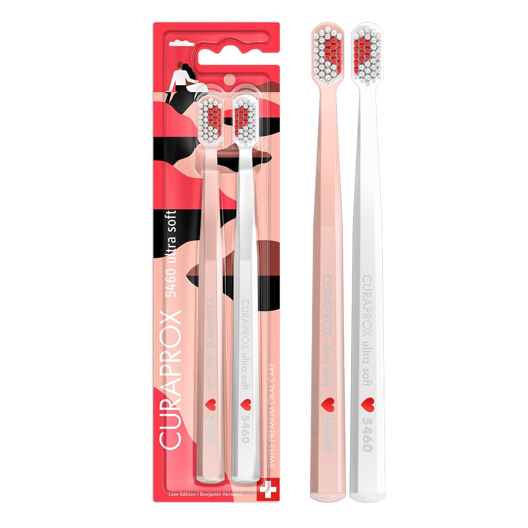 Curaprox Handzahnbürste - Love Edition 2025 / Ultraweich für empfindliche Zähne und Zahnfleisch | 2er Pack, Weiss und Pink/Hergestellt in der Schweiz