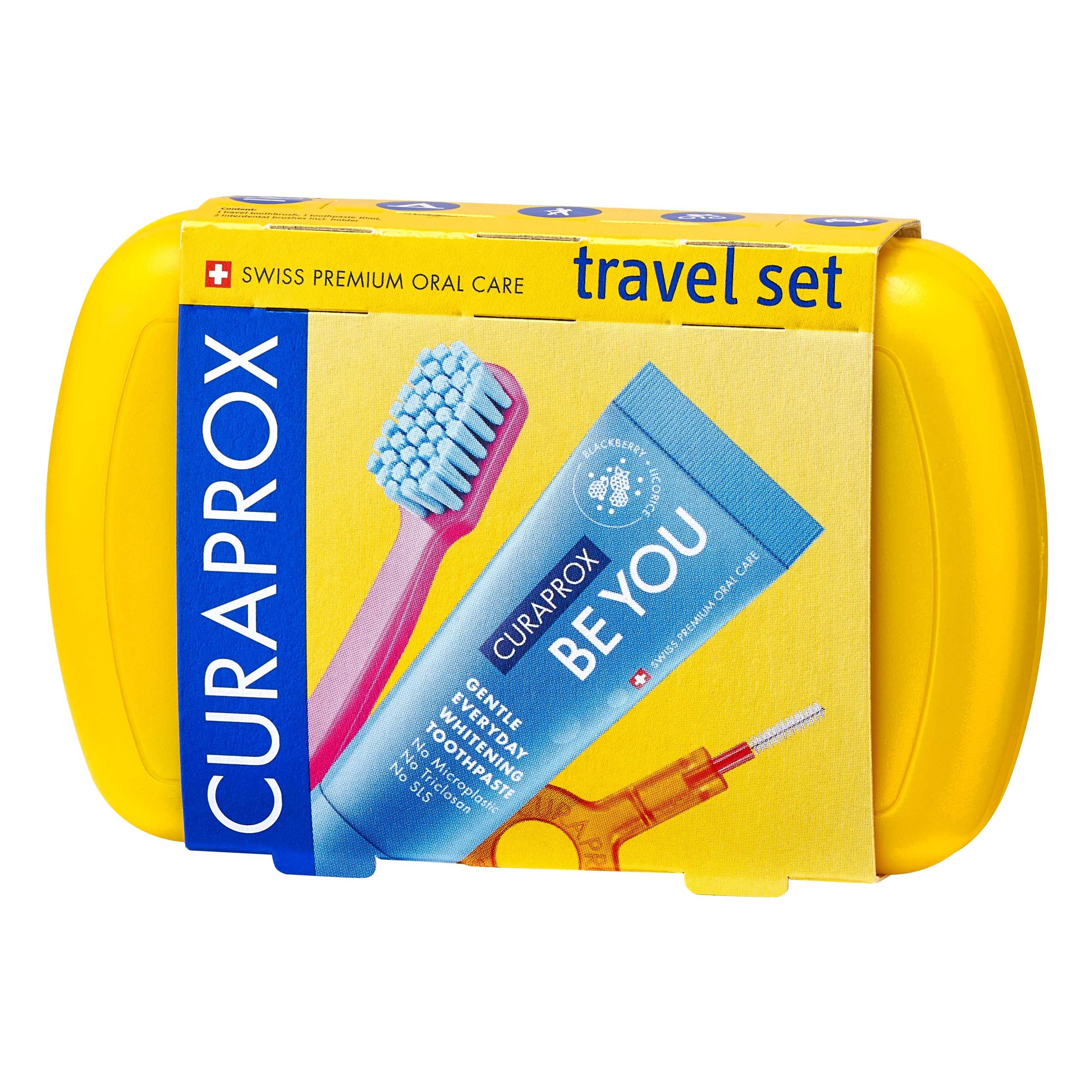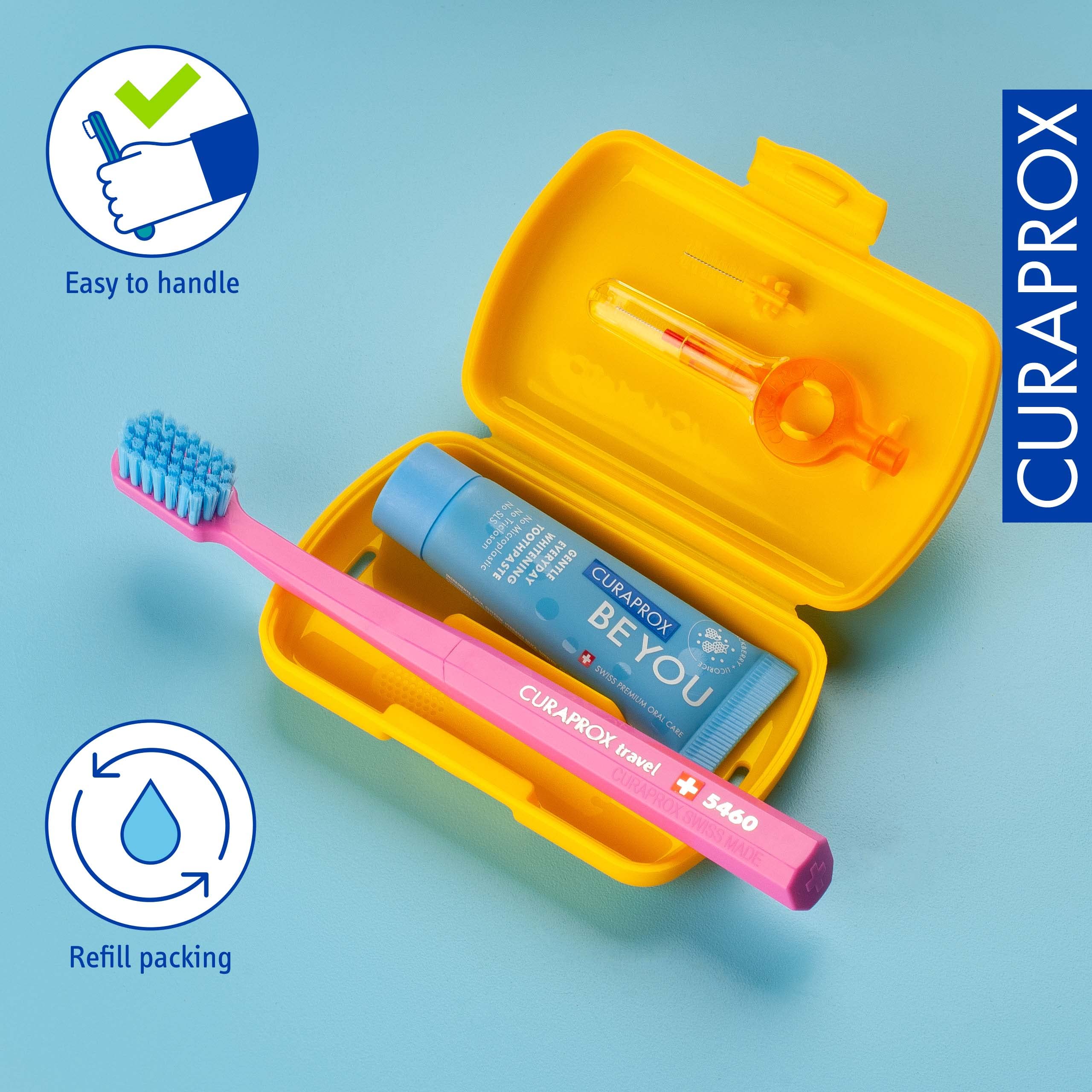 Curaprox Reiseset - CS 5460 Zahnbürste mit 'Be You' Zahnpasta | 2 CPS Prime Interdentalbürsten 07 und 09 / Zahnpflegeset 9,5 cm x 6 cm/Gelb/Hergestellt in der Schweiz