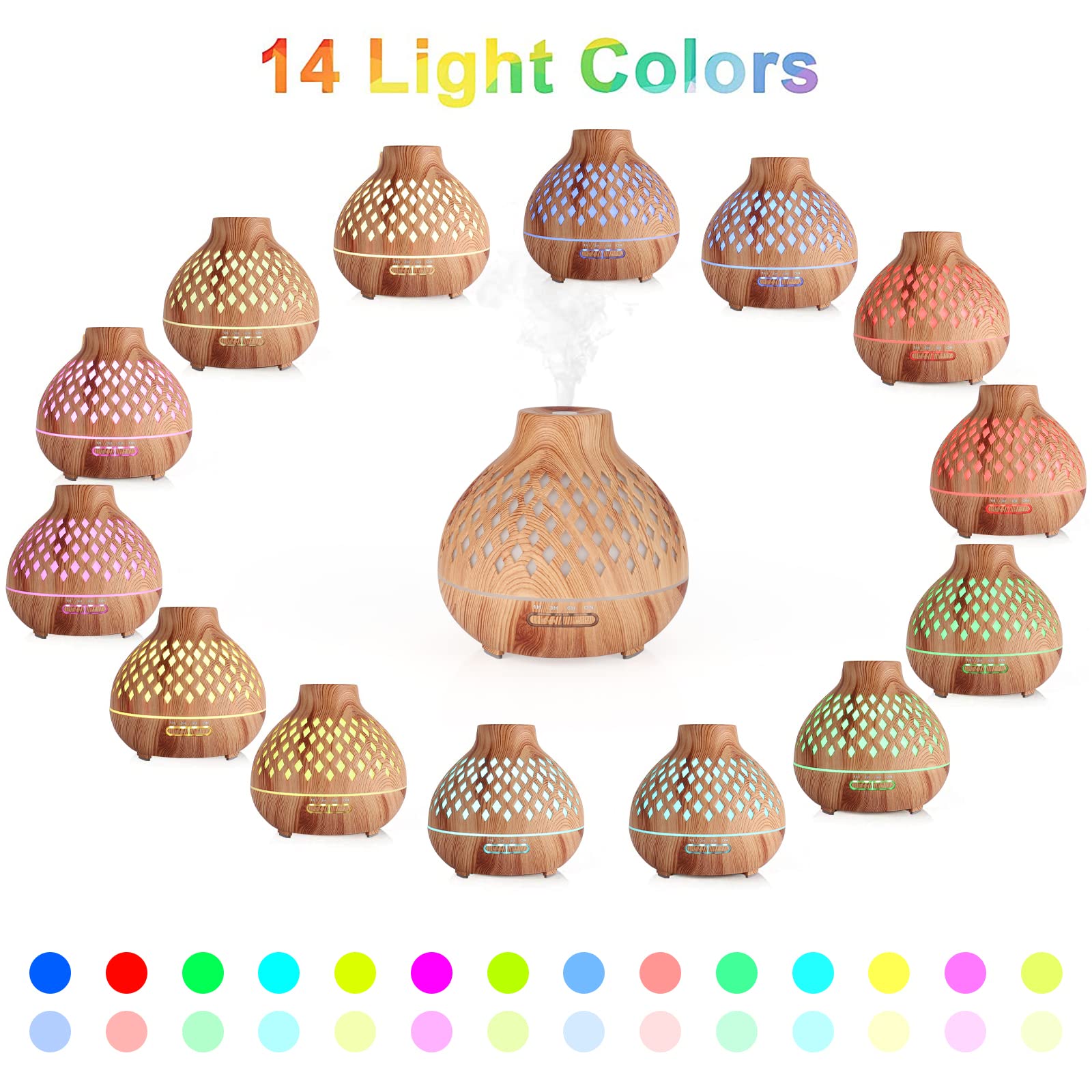 • 14 Lichtfarben und geringes Rauschen – Sie können die Lichter so ändern, wie Sie es gerade fühlen, auf eine Farbe oder eine Drehung von 14 Farben festlegen. Ultraleise 23dB für jede zarte aromatische Nacht.