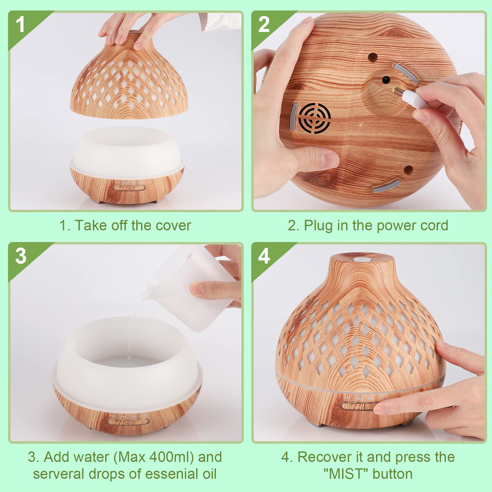• Luft reinigen und befeuchten – Schaffen Sie eine wohlriechende, angenehme und gesunde Atmosphäre in Ihrem Zuhause. Nicht nur ein Öldiffusor, sondern ein Nebelbefeuchter. Geniessen Sie frische und perfekt ausgewogene Luft!