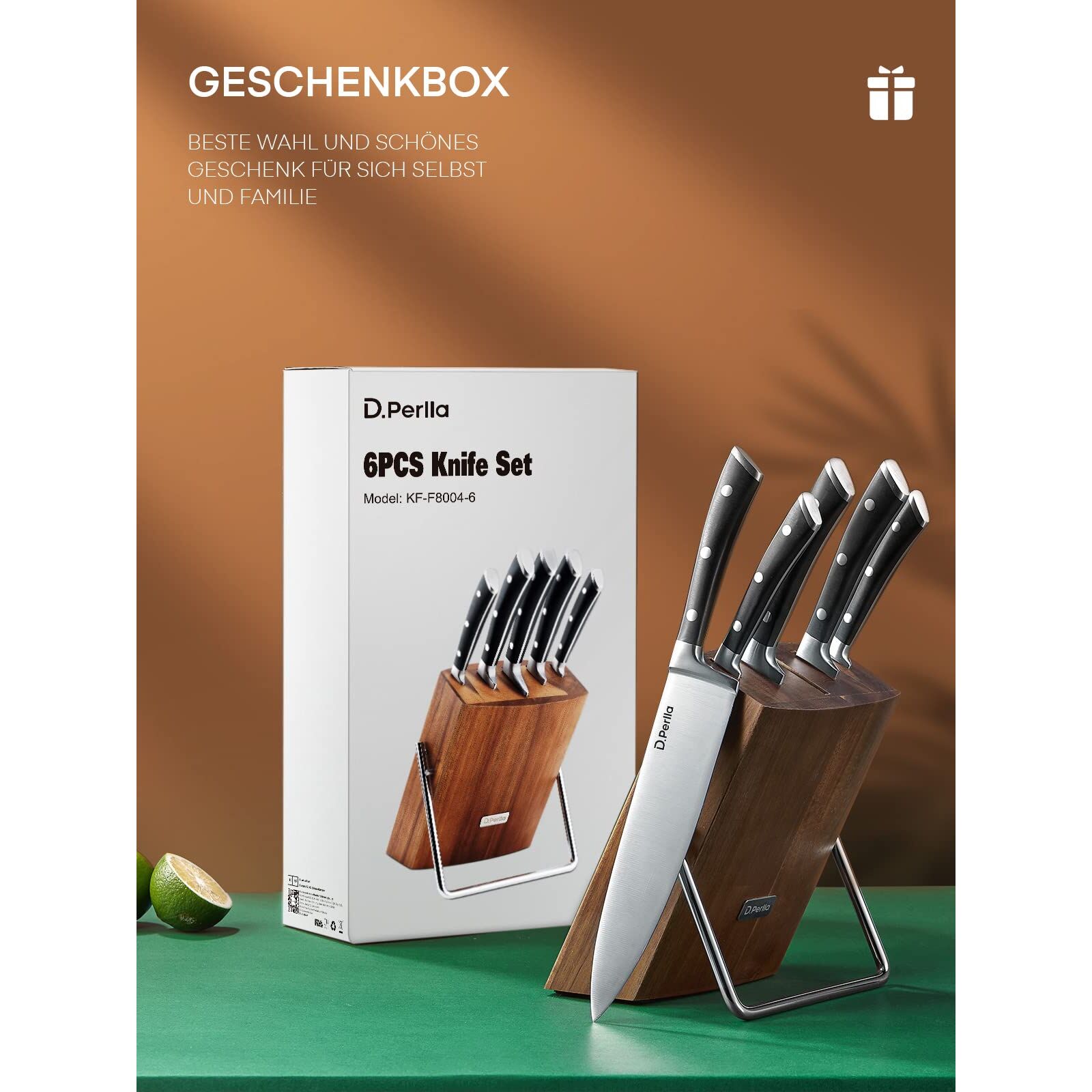 D.Perlla Messerblock Set, 6 teilig Messerset mit Holzblock, Kochmesser Set mit Scharfe Klingen, Edelstahl mit Hohem Kohlenstoffgehalt, Braun