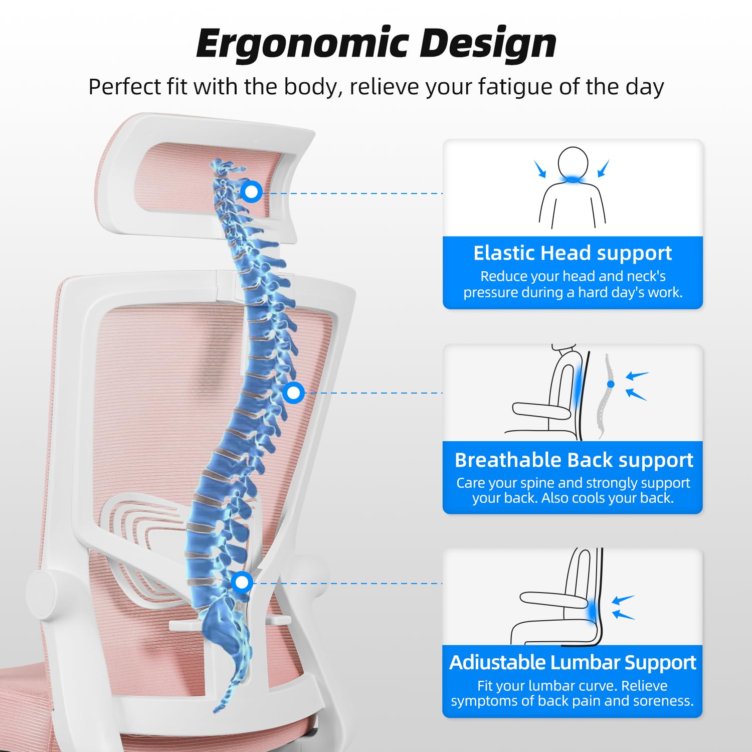Daccormax Bürostuhl, Bürostuhl Ergonomisch mit Einstellbarer Kopfstütze, Weiche Lendenwirbelstütze und Klappbare Armlehnen Schreibtischstuhl Drehstuhl Wippfunktion, Chefsessel, Rückenschonend