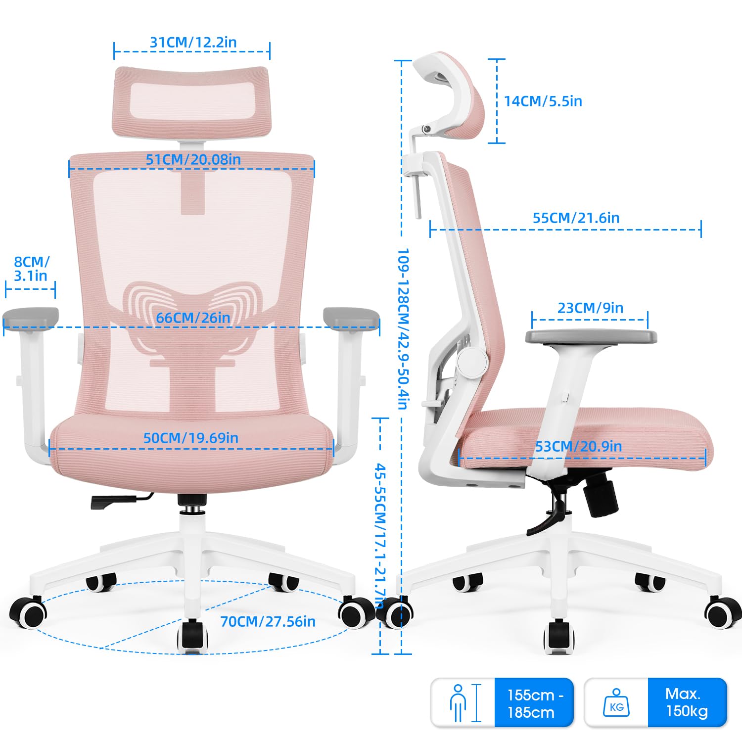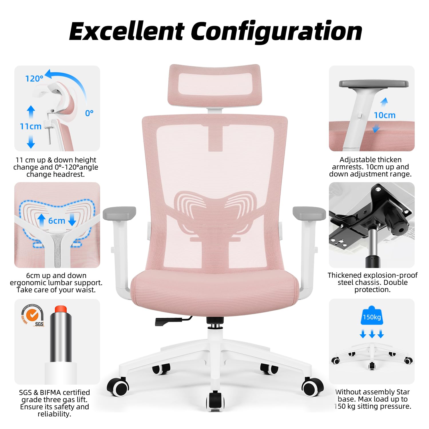 Daccormax Bürostuhl, ergonomisch mit Kopfstütze, Lendenwirbelstütze und Armlehnen, drehergonomischer Schreibtischstuhl, Wippfunktion, Chefsessel, Rückenschonend, 150kg