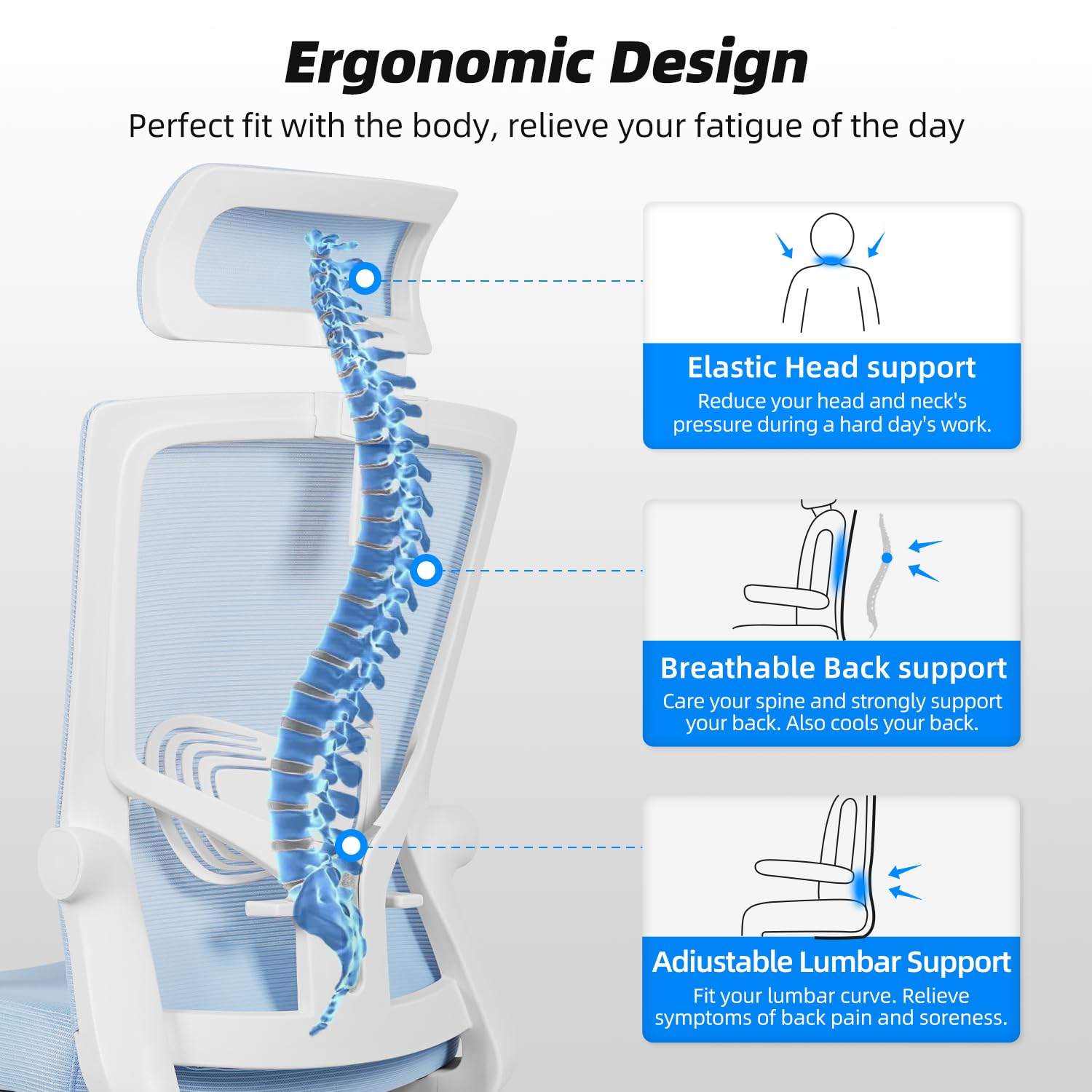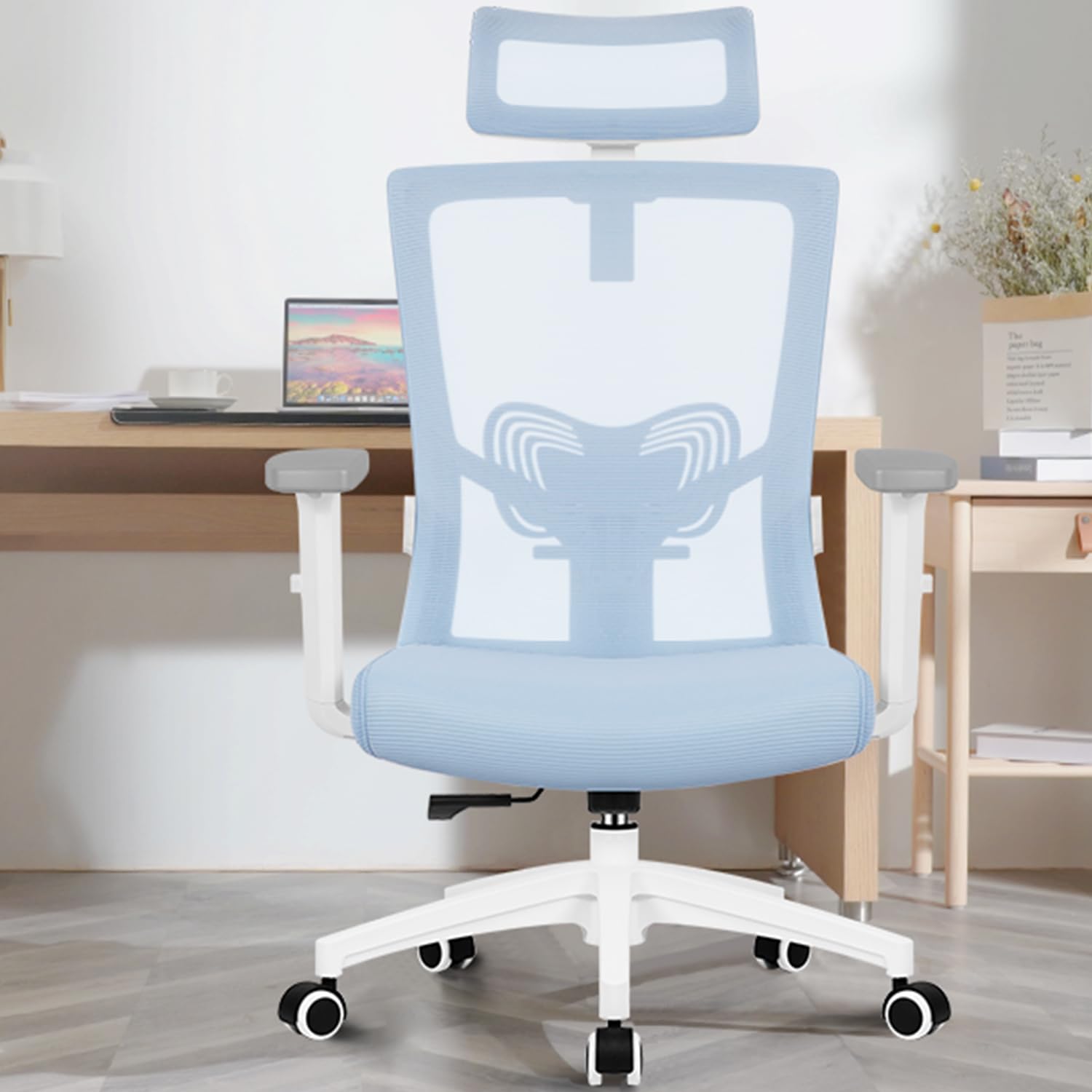 Daccormax Bürostuhl, Bürostuhl Ergonomisch mit Einstellbarer Kopfstütze, Weiche Lendenwirbelstütze und Klappbare Armlehnen Schreibtischstuhl Drehstuhl Wippfunktion, Chefsessel, Rückenschonend