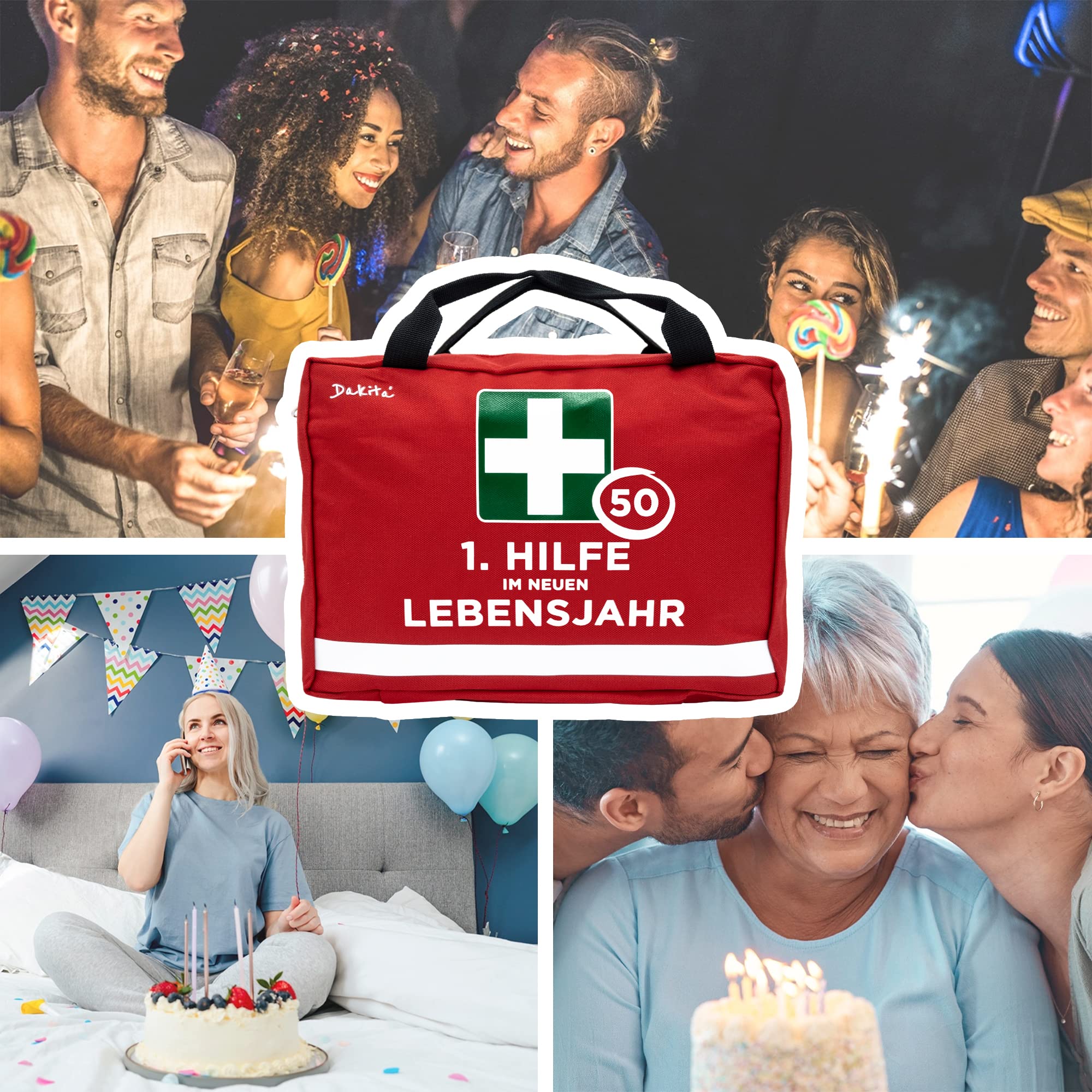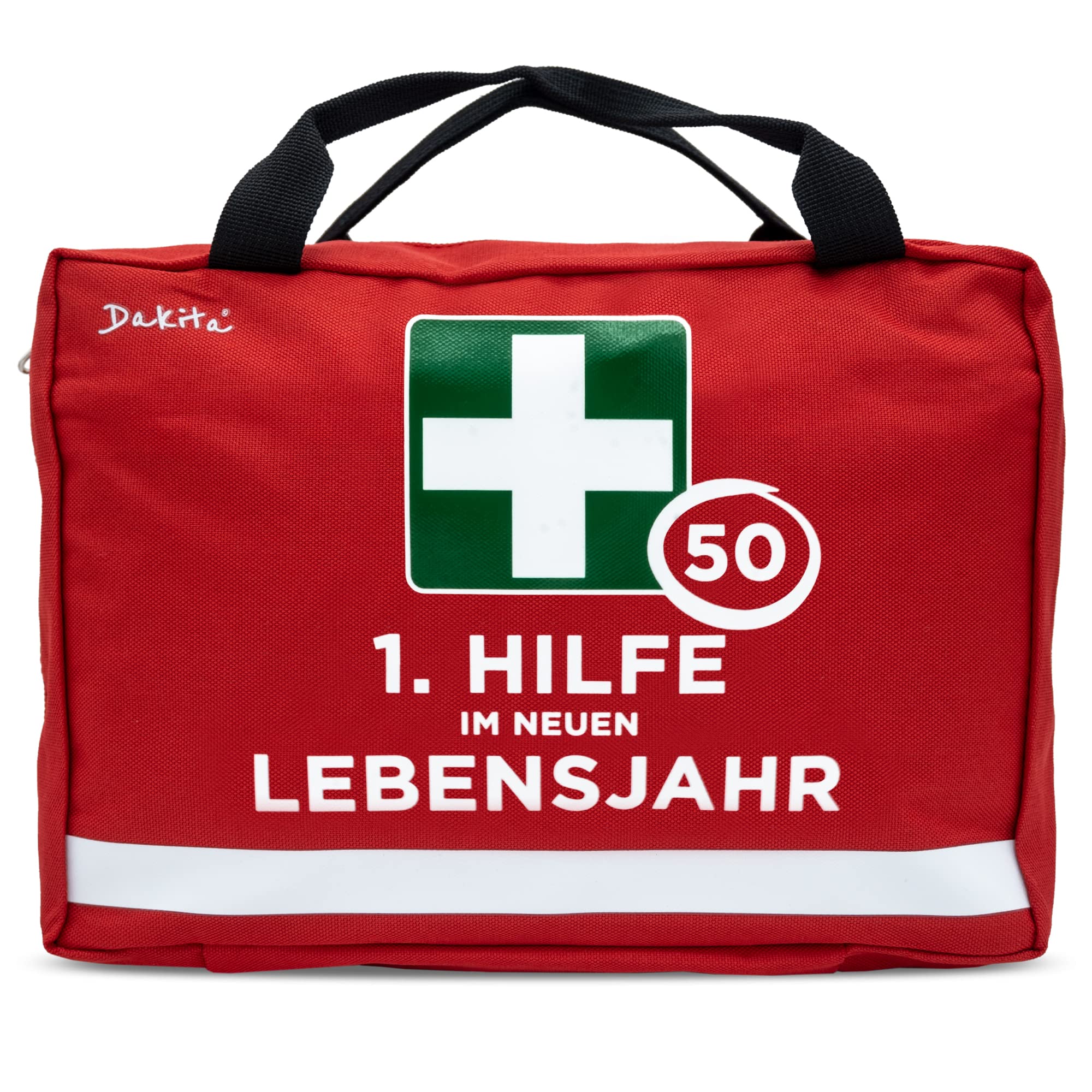 Dakita Erste-Hilfe Tasche zum 50. Geburtstag – Lustiges Geschenk für Männer & Frauen – 28×18×8 cm – rot, ohne Inhalt