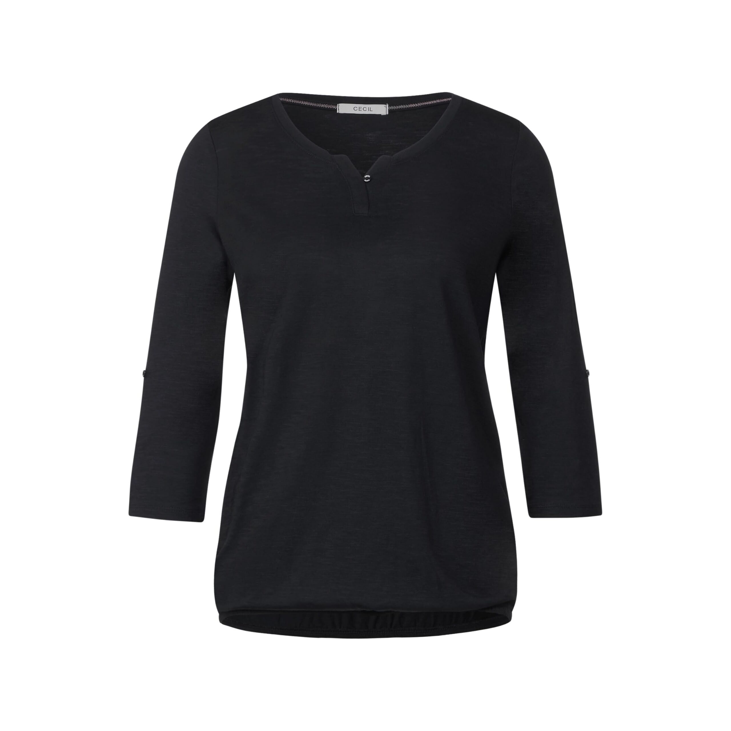 Allround-Talent. Mit der schlichten Ausstrahlung lässt sich das Shirt immer wieder neu und easy kombinieren. Highlights setzen der geschlitzte Rundhalsausschnitt und die verkürzten Ärmel mit Turn-Up Funktion. Ein weicher Materialmix und der Elastiksaum sorgen für einen hohen Tragekomfort. Masse bei EU-Grösse XS ca.: Länge 62cm, Breite 50cm, Taille 49cm