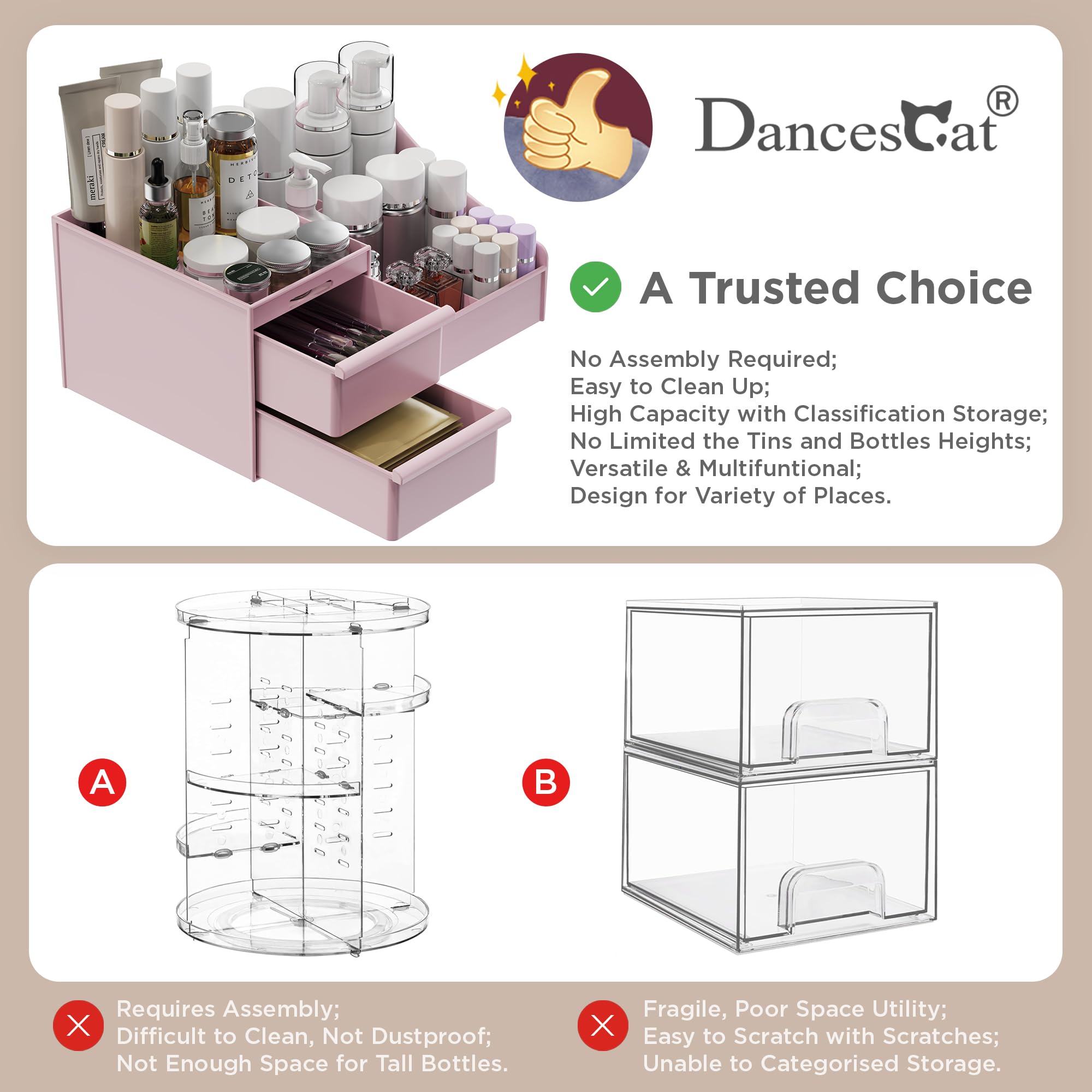 Der DancesCat Make-up Kosmetik Organizer mit Schubladen in Rosa ist die perfekte Wahl fuer alle, die ihre Kosmetik ordentlich, funktional und stilvoll organisieren moechten.
