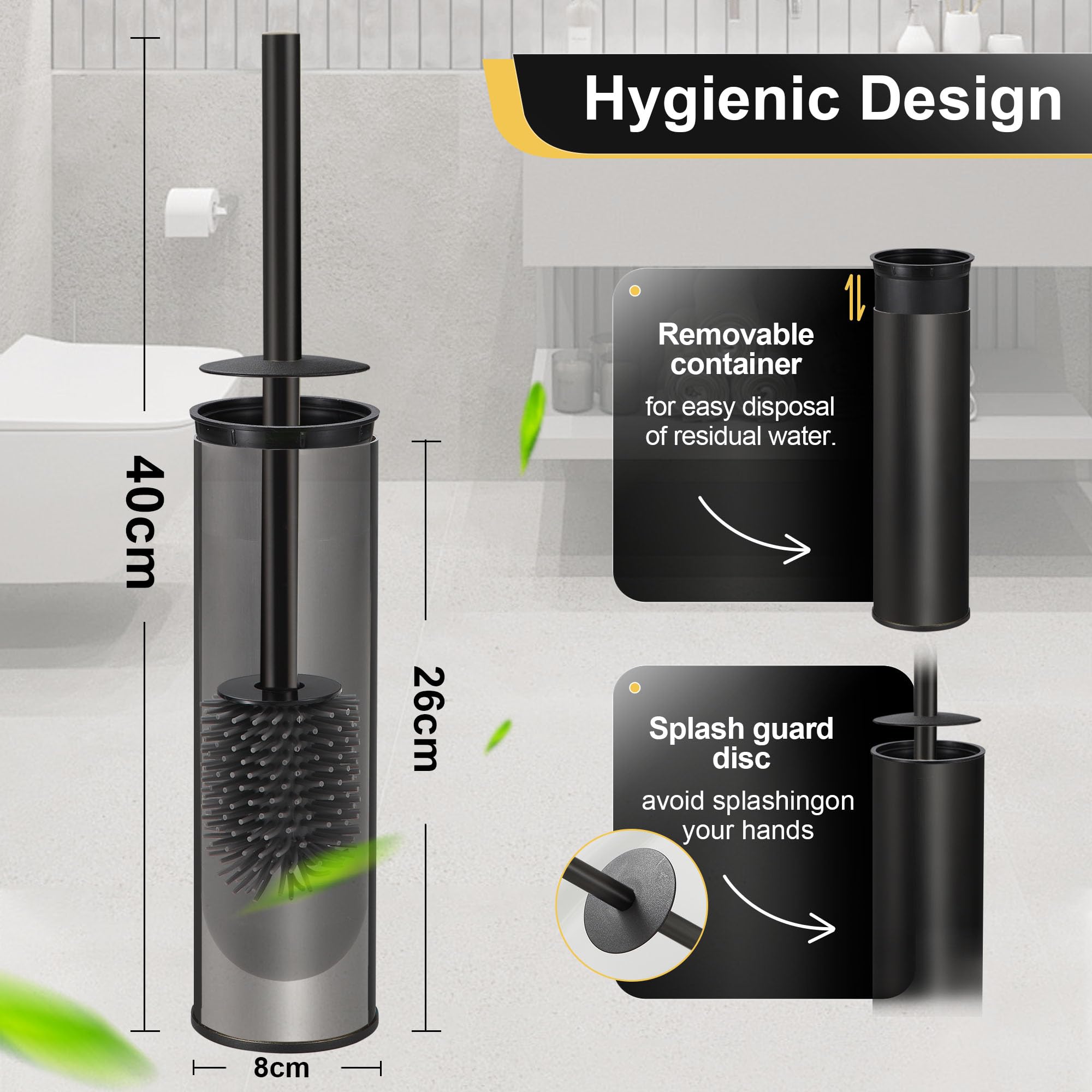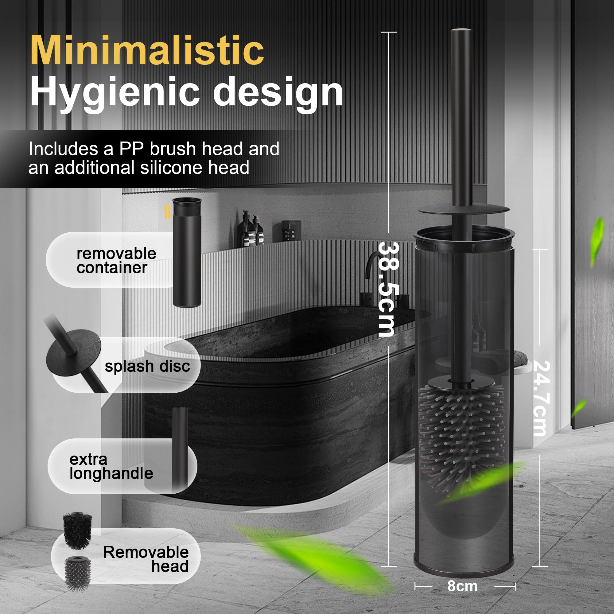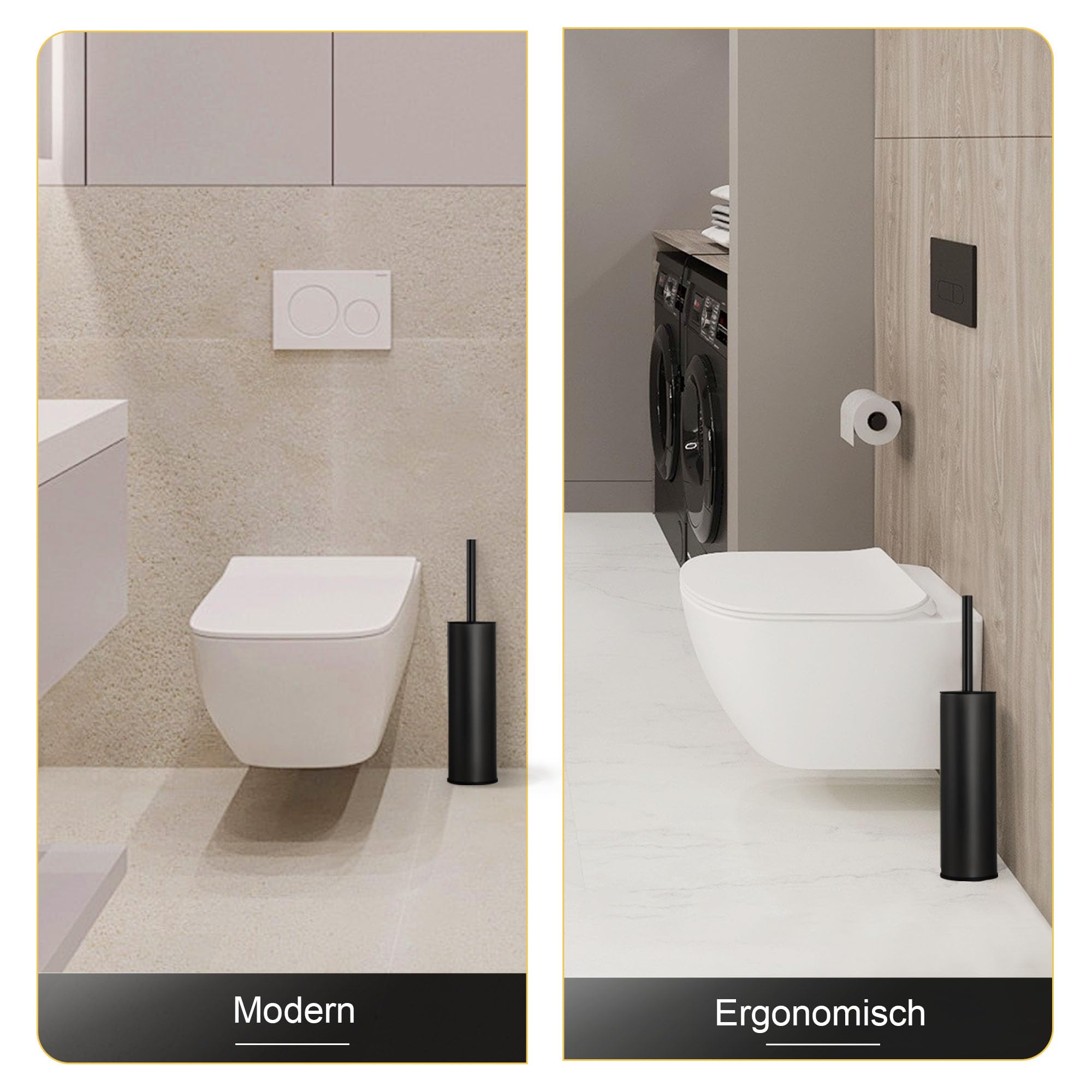 DAZI Klobürste freistehende metallisch, Schwarze Matte Toilettenbürste mit 2 Langen WC-Bürsten für eine Tiefenreinigung des Waschbeckens, Klobürste schwarz mit Tropf- und Verstopfungshemmung.