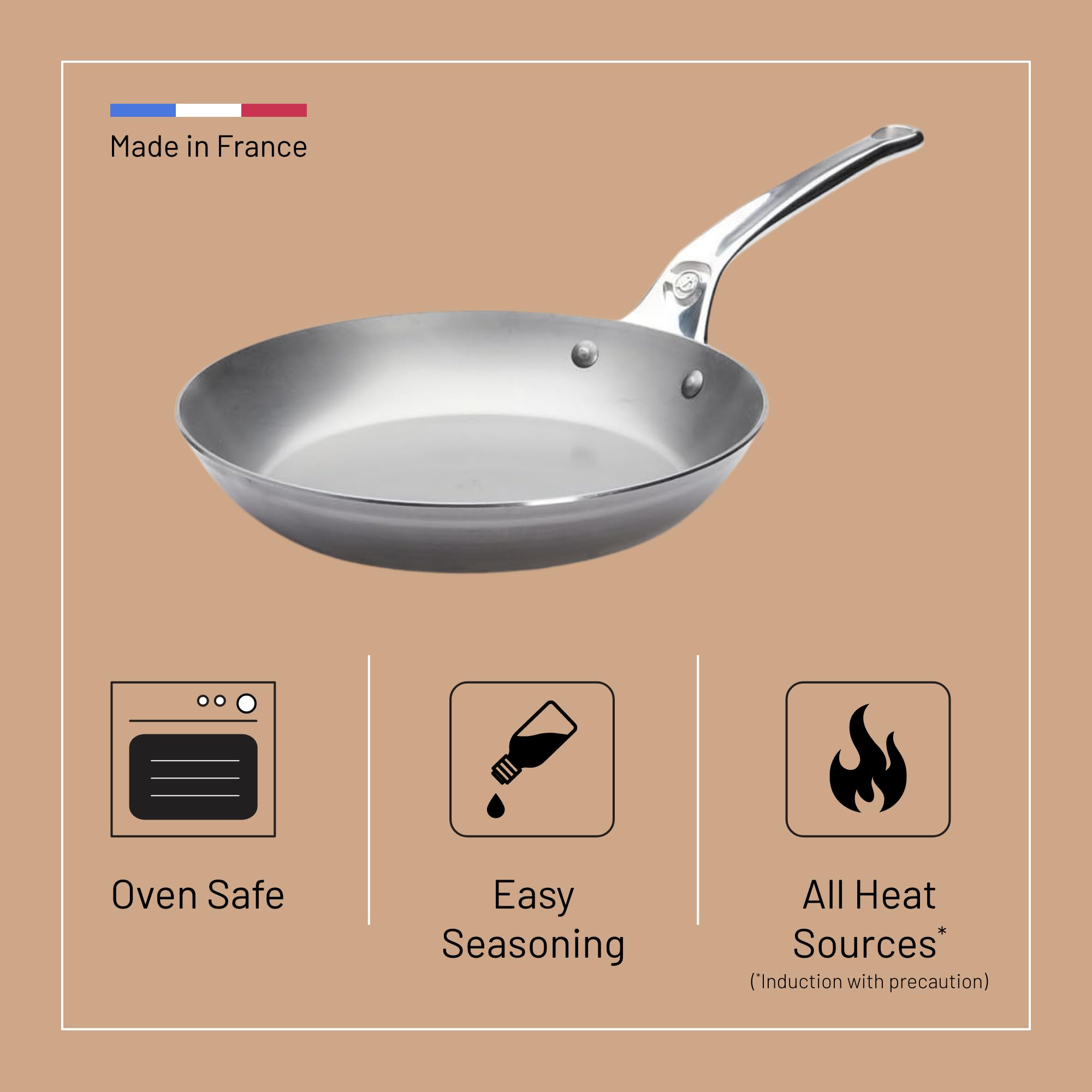 Runde Pfanne in Lyoner Form zum leichten Hinausgleiten der Speisen; ideal zum Anbraten, Grillen, Bräunen. Das formstabile Kochgeschirr MINERAL B aus weissem Walzstahl mit Bienenwachs, der gegen Oxidation schützt und das Einbrennen erleichtert. Die Antihaftwirkung wird ab der ersten Verwendung verbessert. Formstabile dicke Wände. Hervorragendes Karamelisieren der Speisen. Natürliche Antihaftwirkung: allmähliches Einbrennen. Der vernietete Stiel aus Edelstahlguss bleibt kühl und ist ergonomisch geformt. Tipp: mit wenig Fett vorheizen. Einbrennen vor der ersten Verwendung. Pflege: Mit Wasser ablöschen, mit warmem Wasser abspülen, abtrocknen und leicht einölen. An einem trockenen Ort aufbewahren. Keine Reiniger verwenden und nicht im Geschirrspüler waschen. Für alle Herdarten, auch Induktion.