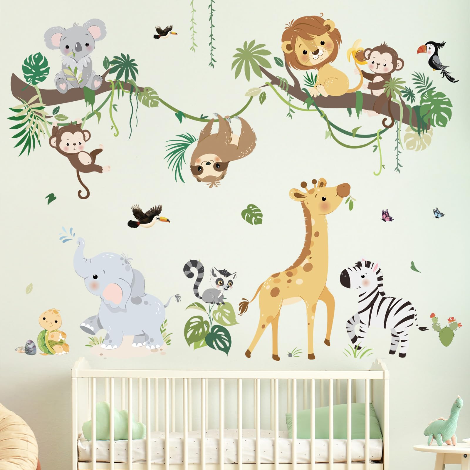 Dieser wandtattoo beinhaltete Baumzweige, tropische Blätter und Pflanzen, eine Giraffe, ein Elefant, ein Löwe, Affen und andere kleine Tiere, dekorieren sie das zimmer ihres mit stilvollen und warmen cartoon-effekten.