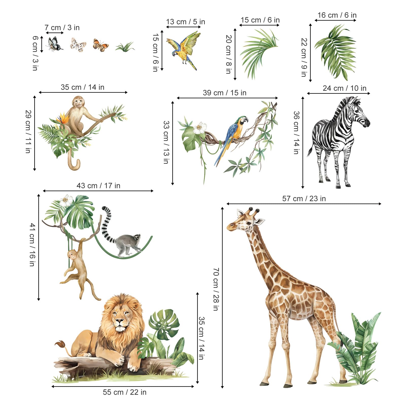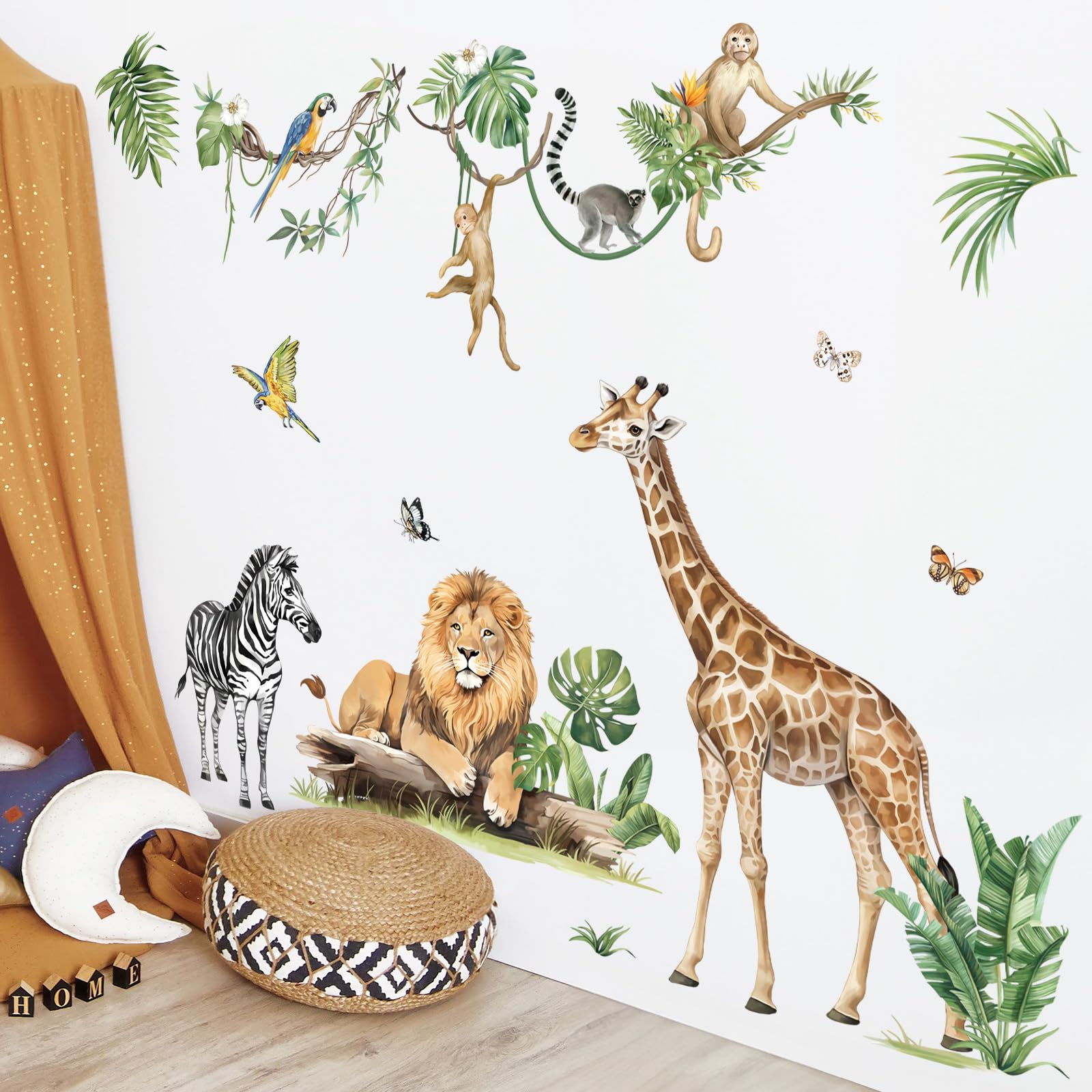 Dieser wandtattoo beinhaltete ein tropische Weinblätter und Pflanzen, eine Giraffe, ein Löwe, ein Zebra, Affen und andere Kleintiere, dekorieren sie das zimmer ihres mit stilvollen und warmen cartoon-effekten.