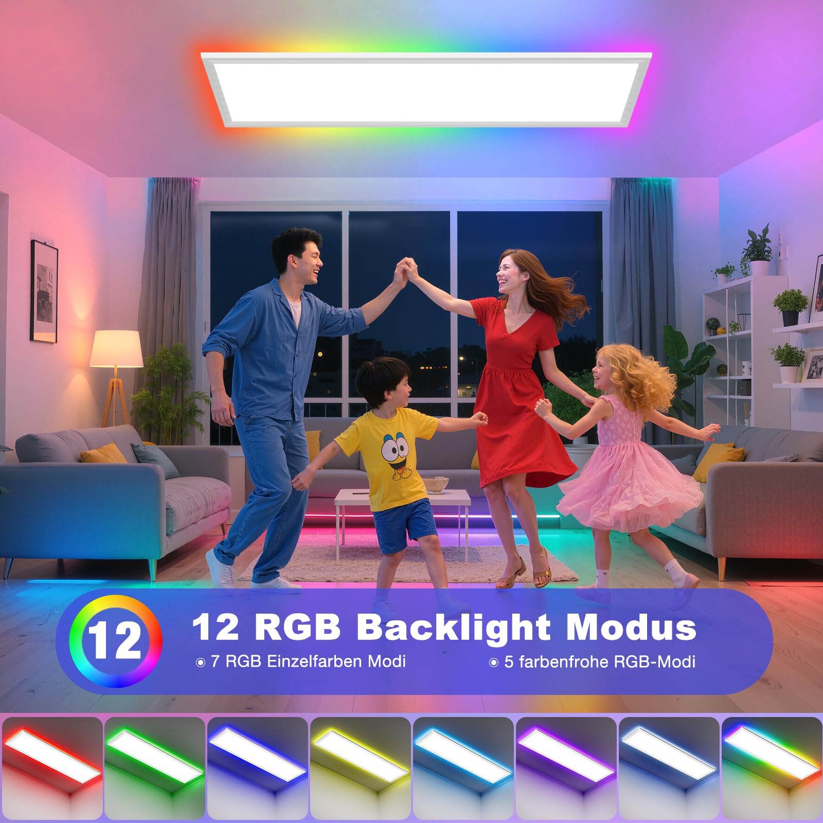 Die LED Deckenleuchte Lang verfügt über integrierte RGB-Lampenperlen, unterstützt 7 den farbenfrohen Monochrommodus und ist mit 5 dynamischen Farbmodi (Sprung, Farbverlauf, Laufen, fliessendes Wasser usw.) ausgestattet, die eine immersive Lichtatmosphäre schaffen, die für Partys, Spiele und Unterhaltungsszenen geeignet ist.