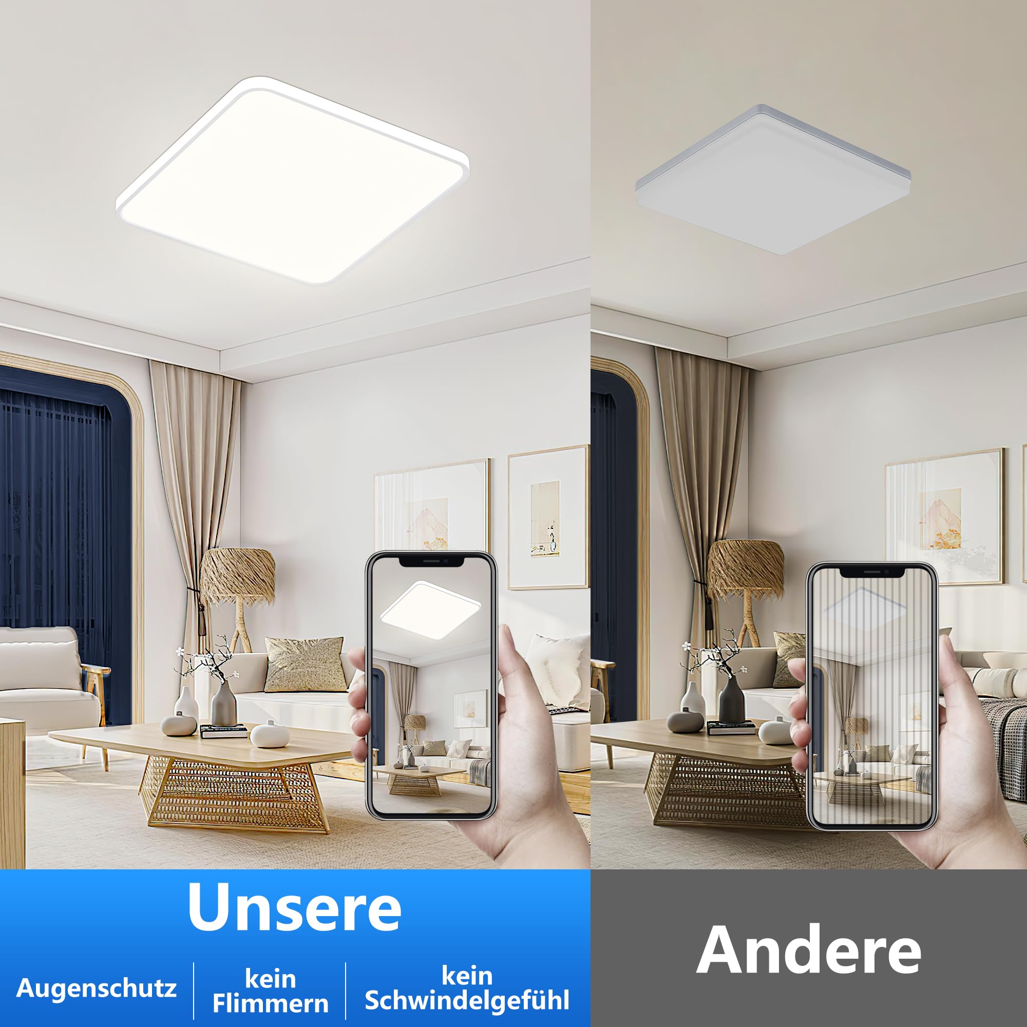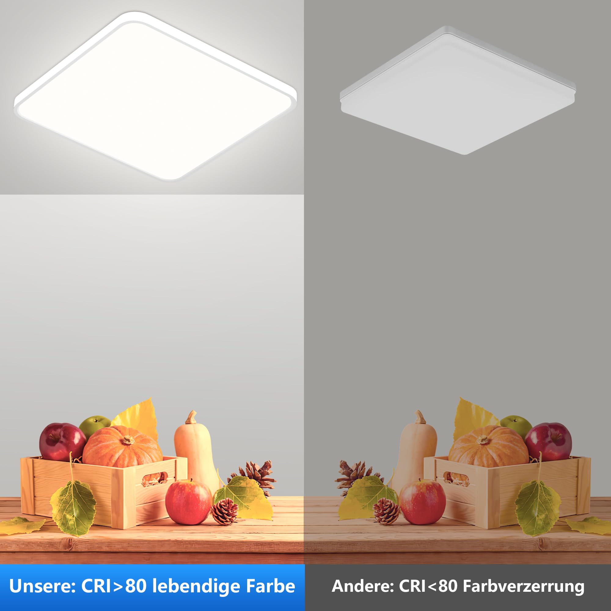 Die Rechteckige Led Panel ist frei von RF-Interferenzen und strahlt ein helles, weiches Licht aus, das Ihre Augen schützt. Der speziell behandelte Lampenschirm dämpft das Licht noch mehr. Der Farbwiedergabeindex der ultra flach Led Deckenleuchte liegt bei >80, was eine klare Farbwiedergabe gewährleistet und die wahren Farben des Lebens wiederherstellt.