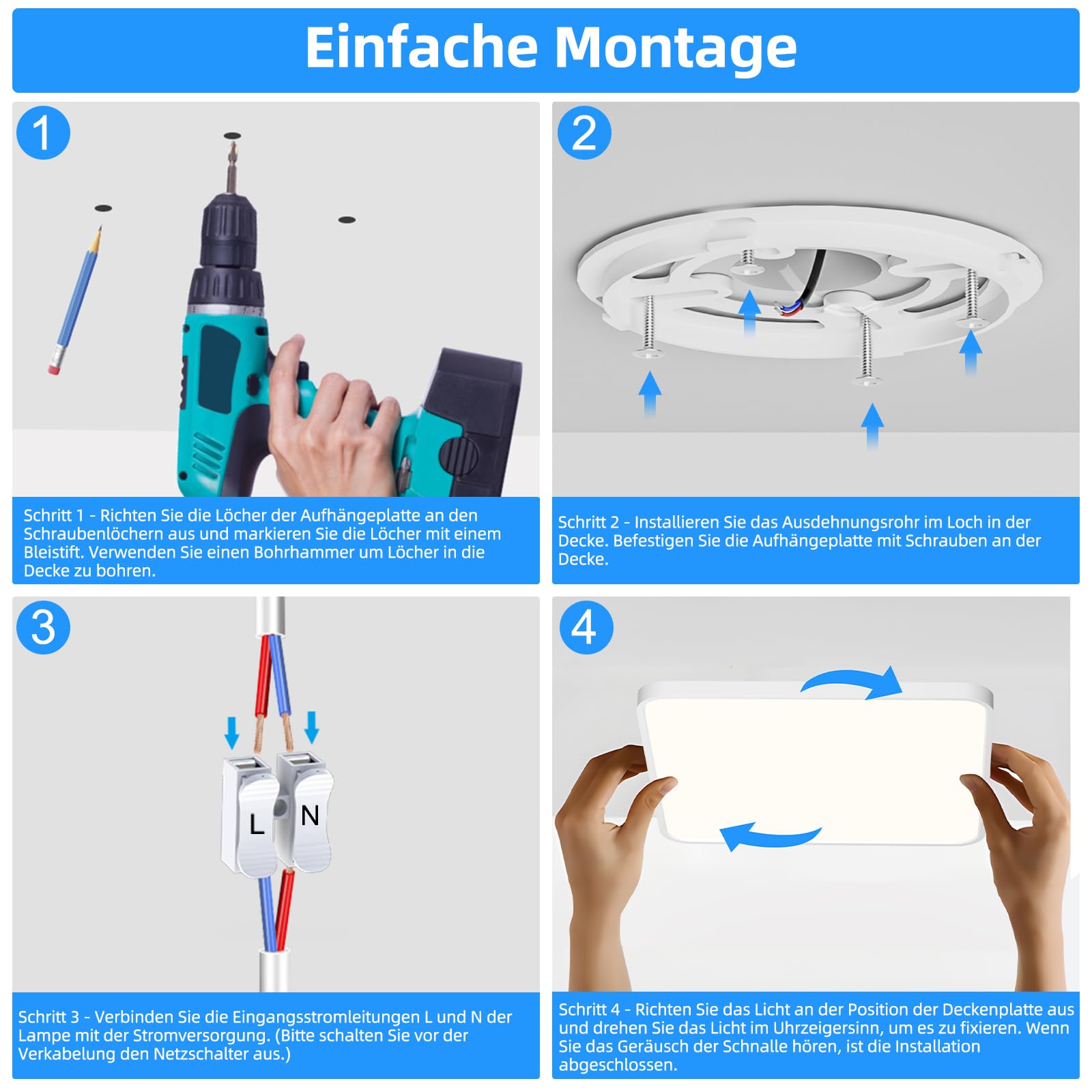 Mit dem humanisierte Sockeldesign passt der flache eckige Led Deckenlampe zu 99 % Anschlussdosen passt. Einfach auf die Montageschiene schieben und sofort funktionsfähig. Brauchen keine Hilfe vom Elektriker.