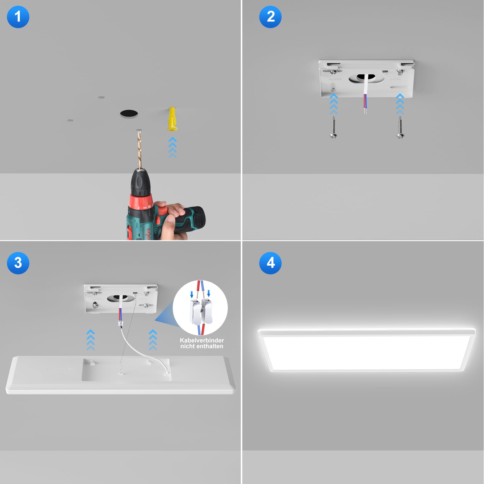 Brauchen keine Hilfe vom Elektriker. Es wird auch sehr bequem für eine Person die LED Deckenlampen mit mitgelieferten Zubehörteilen unabhängig zu installieren. Die Montagezubehör sind im Lieferumfang enthalten.