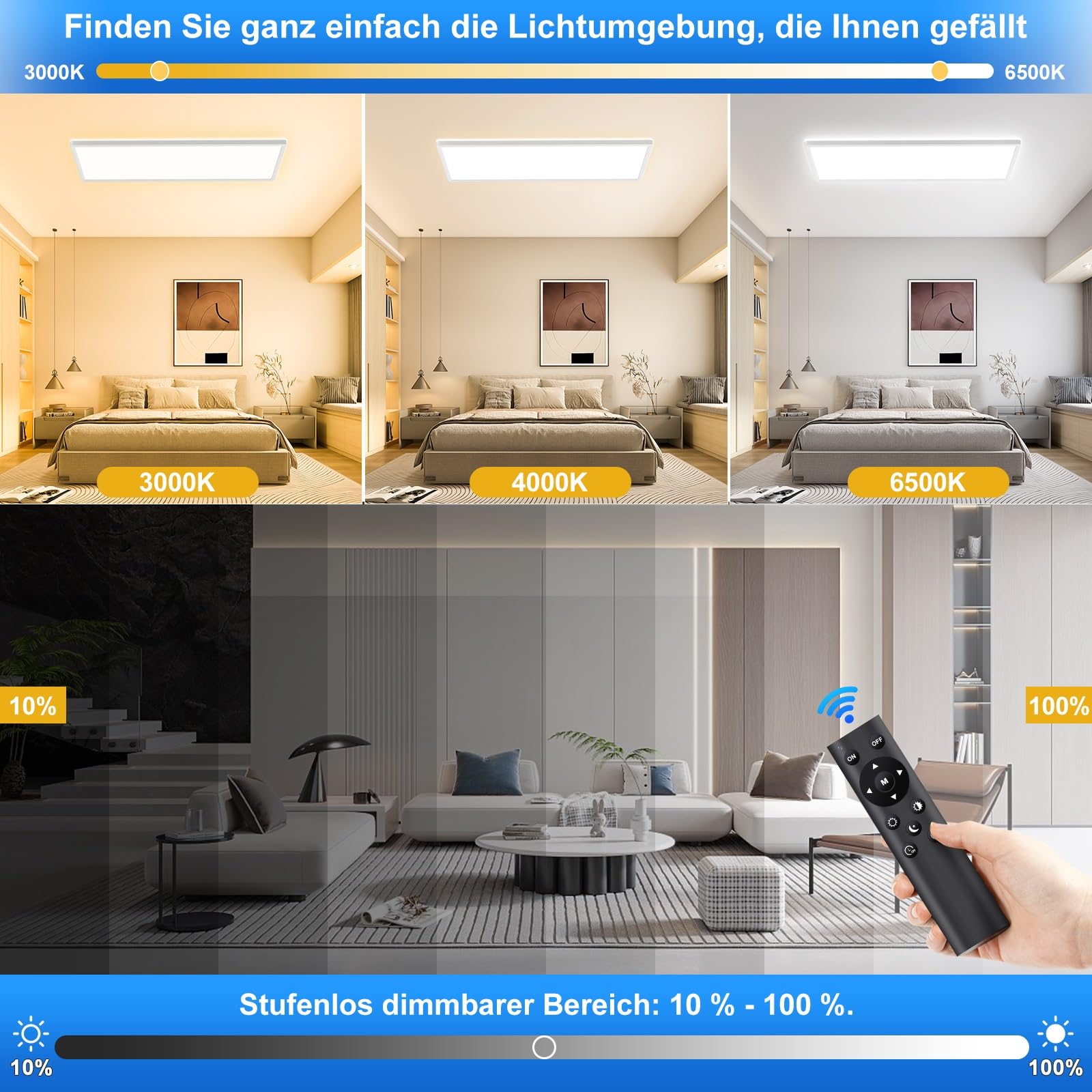 Die dimmbare LED Deckenleuchte mit Fernbedienung hat 3 Farbtemperaturen (warmweiss 3000K, naturweiss 4000K, tageslichtweiss 6500K), und die Helligkeit kann zwischen 10% und 100% eingestellt werden. Deckenlampe mit fernbedienung für eine einfache Einstellung ausgestattet.